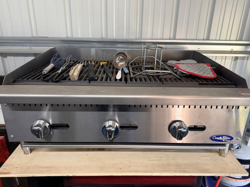 Commercial char broiler, storage drawers and totes. Loads of power and hand tools.