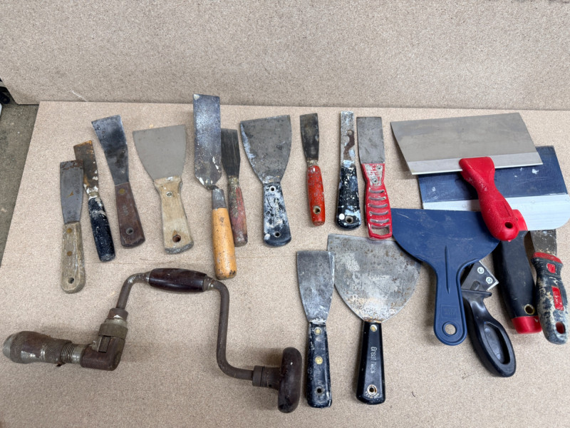 Lot # 176 - Putty Knives - Hand Drill - Spreaders - Scrapers Starting Bid: $ 5.00 Bids: This sale will end in: |