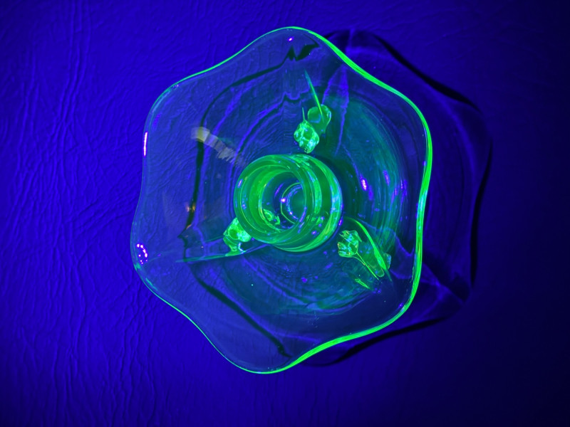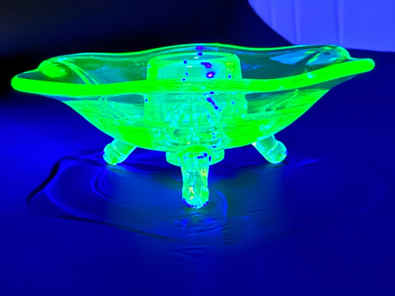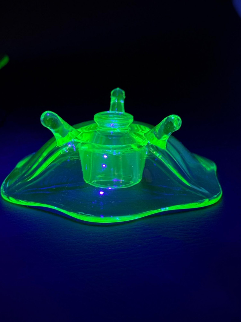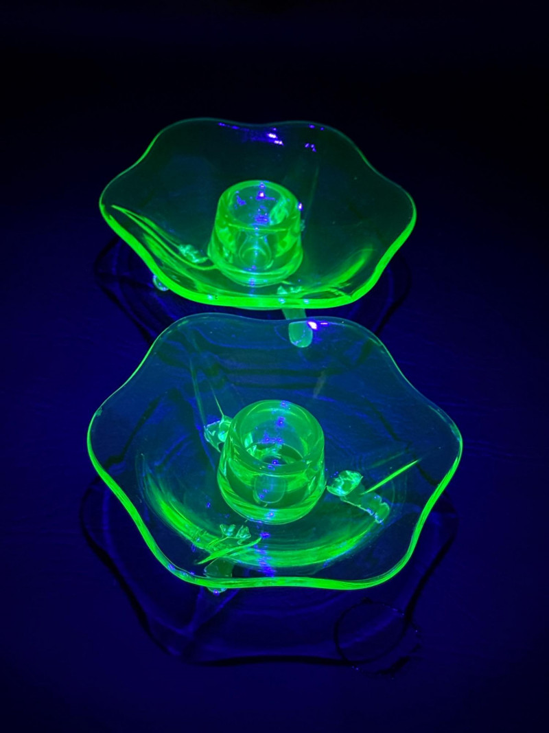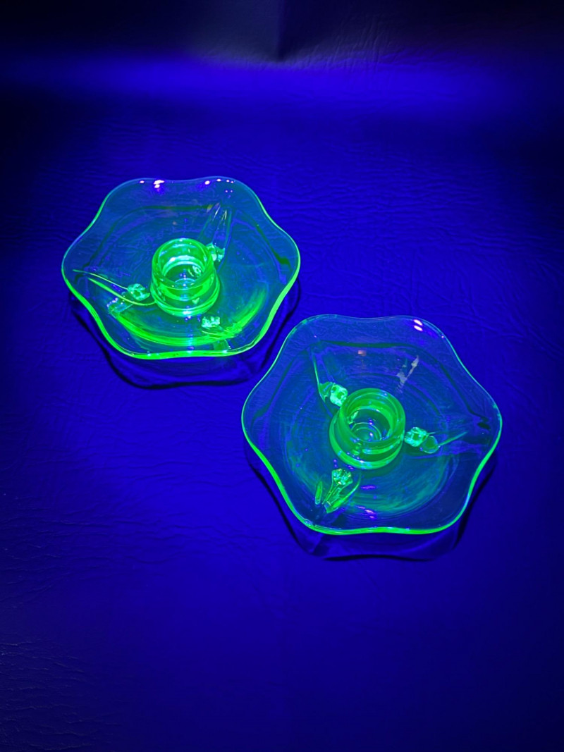 Fenton Lotus 6 Petal Green Uranium Glass 3 Footed Candleholders 4.5”x1.5” Beautiful.