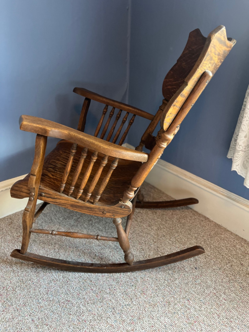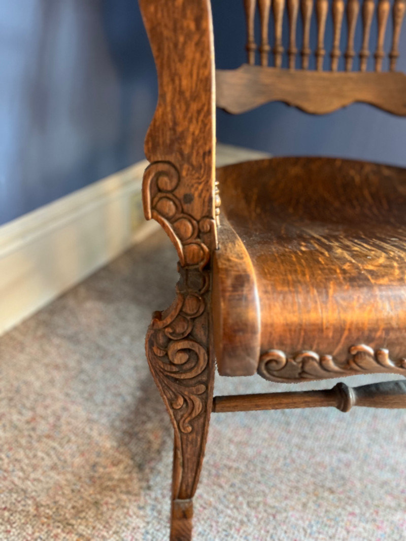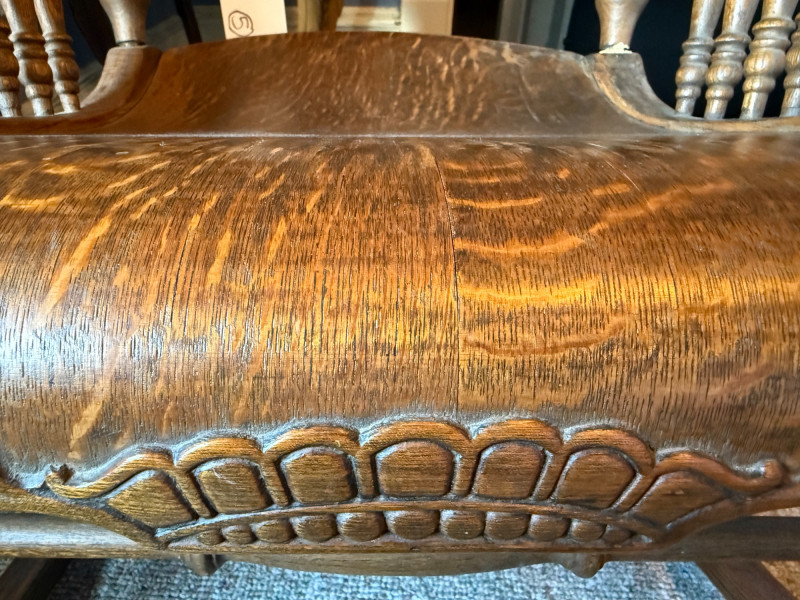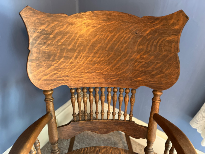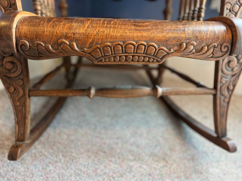 Antique Arts & Crafts Quartersawn Oak Rocking Chair The prominent wood grain suggests quarter-sawn oak, often referred to as "tiger oak" due to its distinctive pattern. This was a popular choice for furniture of this era. The chair features a spindle back, a bentwood seat, and detailed carvings on the armrests and top rail. 25”x33.5”x38”