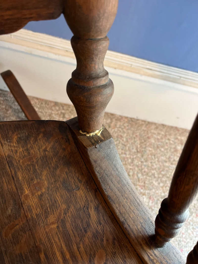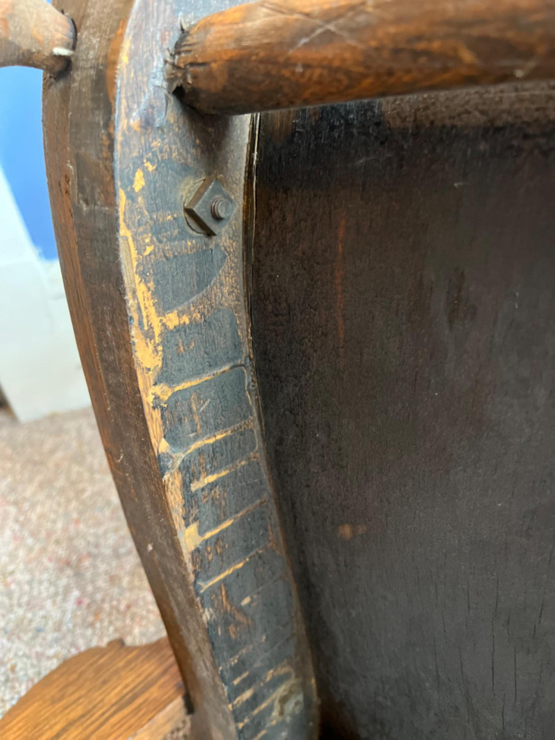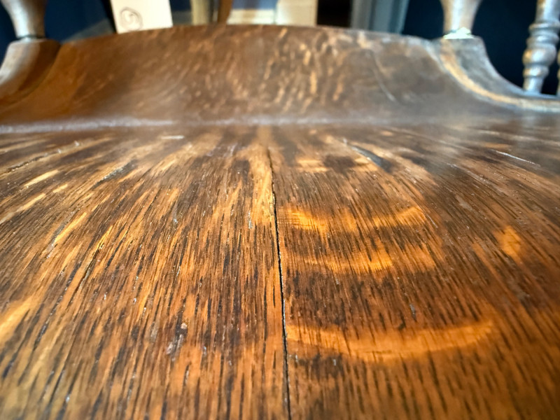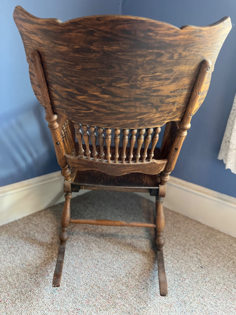 Antique Arts & Crafts Quartersawn Oak Rocking Chair The prominent wood grain suggests quarter-sawn oak, often referred to as "tiger oak" due to its distinctive pattern. This was a popular choice for furniture of this era. The chair features a spindle back, a bentwood seat, and detailed carvings on the armrests and top rail. 25”x33.5”x38”