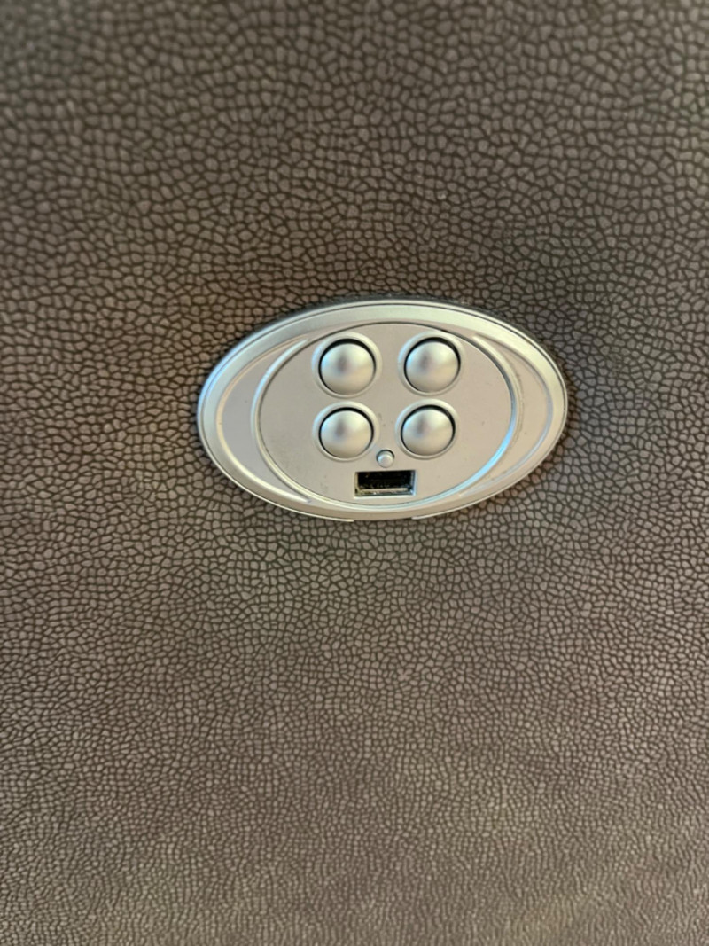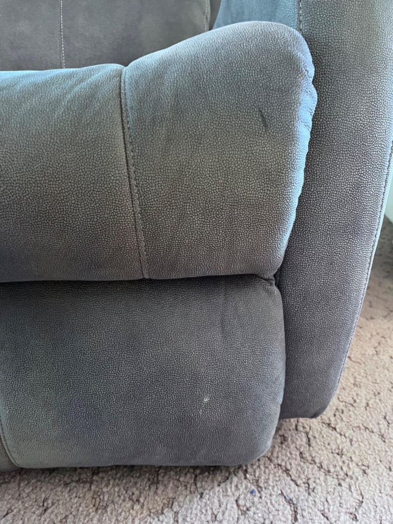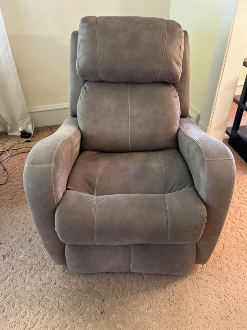 Southern Motion Electric Grey Microfiber Recliner #1 Four buttons for adjusting footrest and headrest. USB port on button panel. Some markings on fabric. 34”x46”x41” Seat height is 17”. Tested: Works.