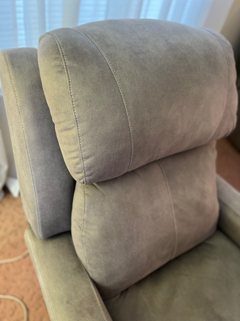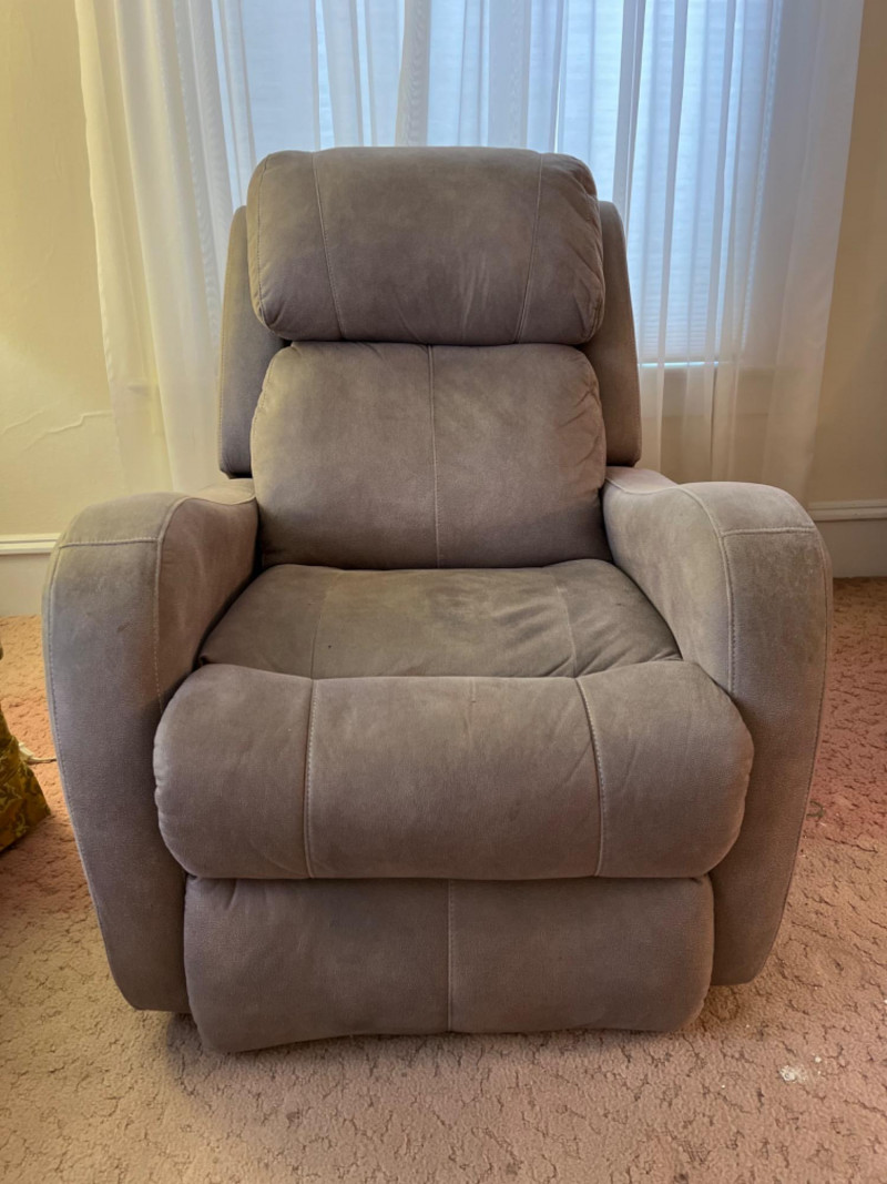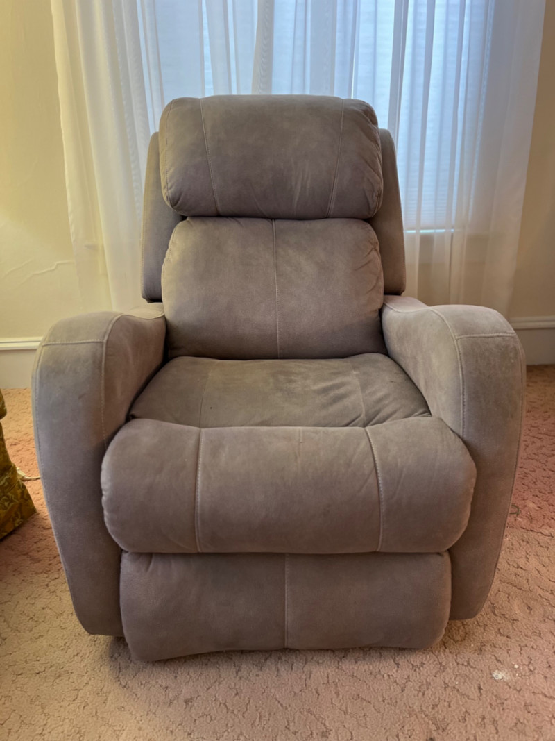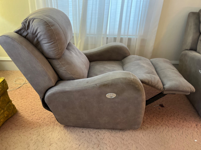 Southern Motion Electric Grey Microfiber Recliner #2 Four buttons for adjusting footrest and headrest. USB port on button panel. Some markings on fabric. Seat height is 17”. Tested: Works.