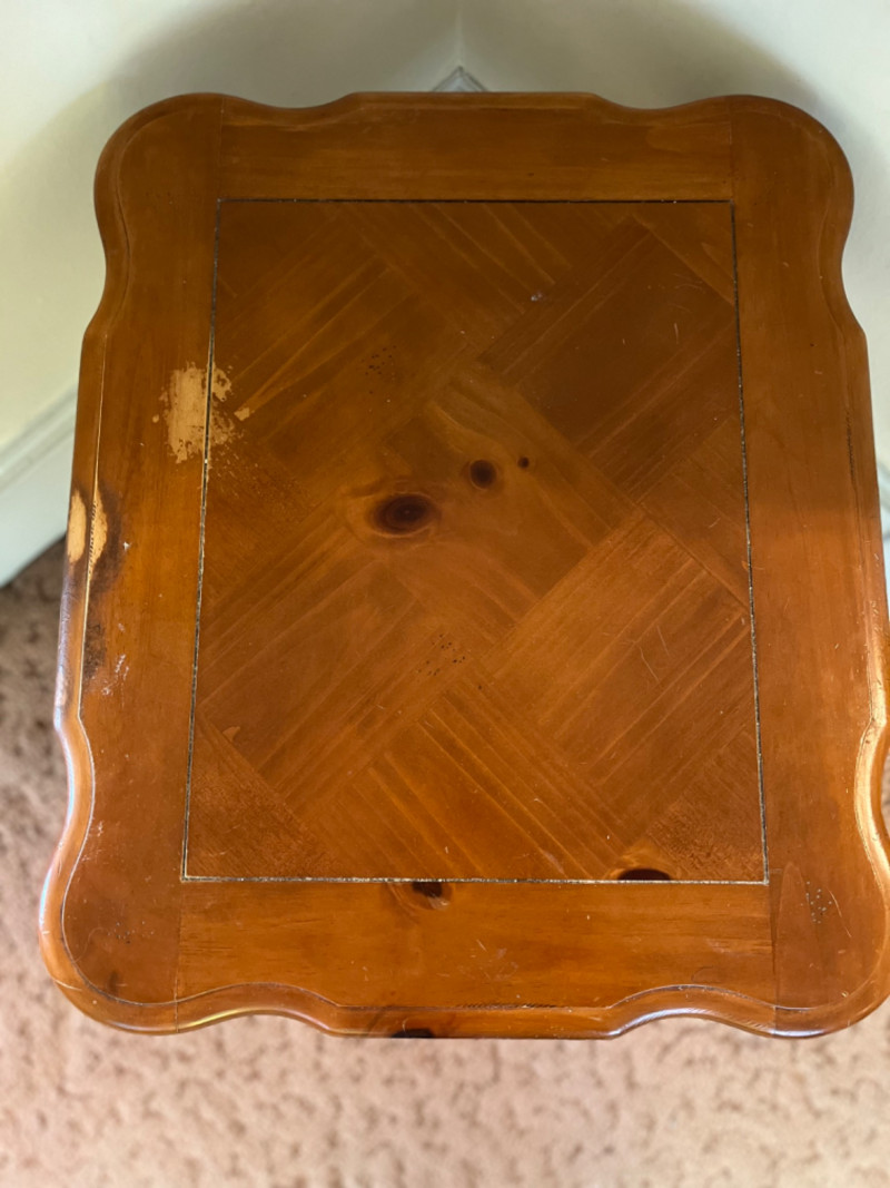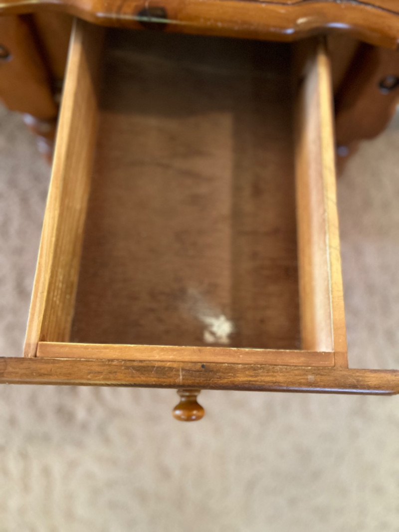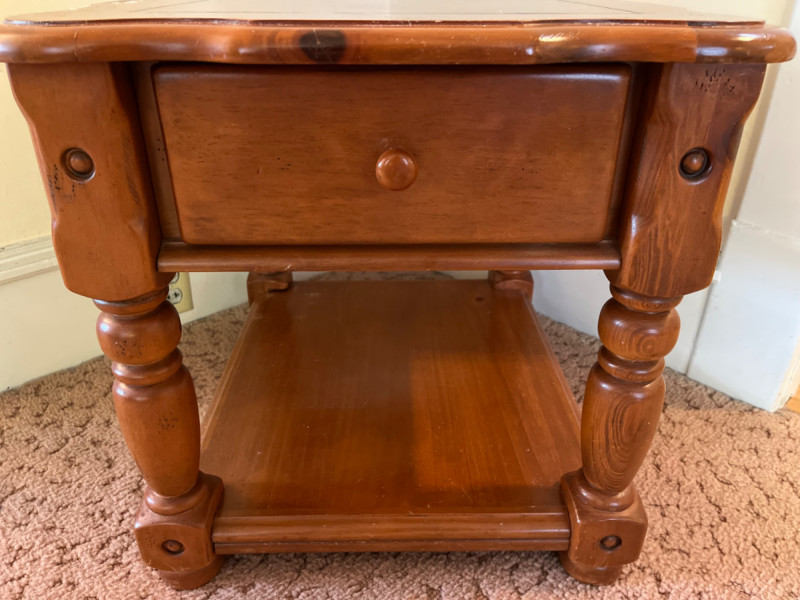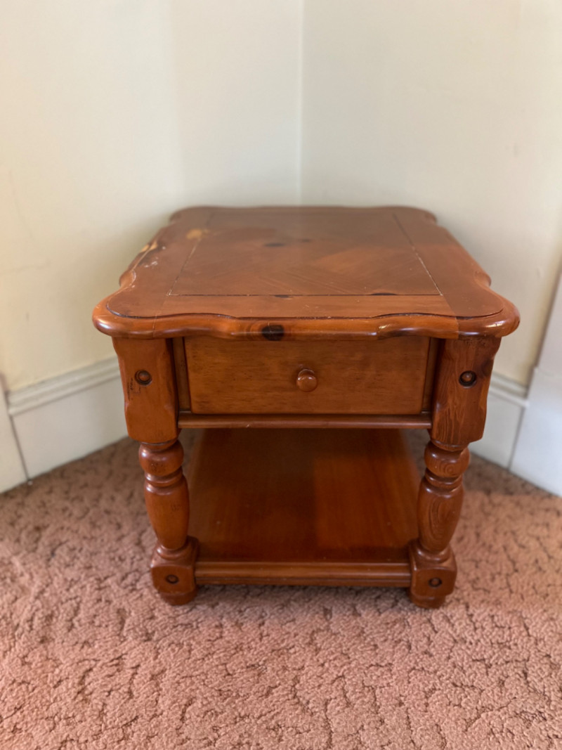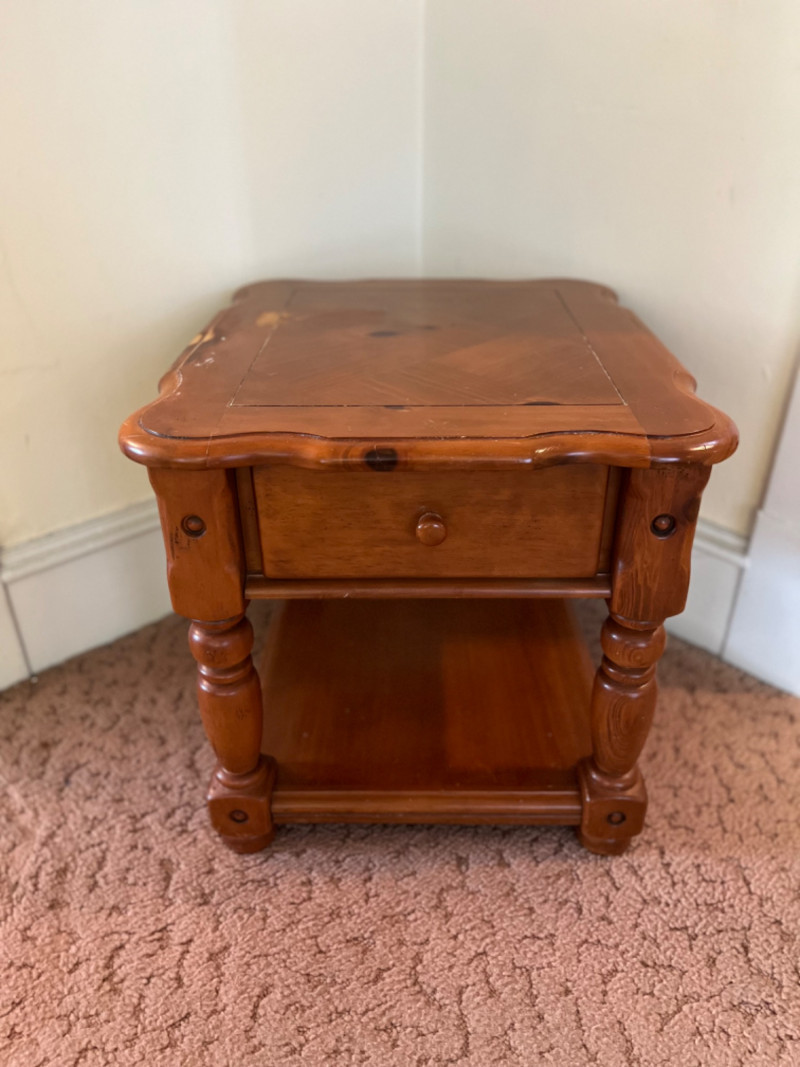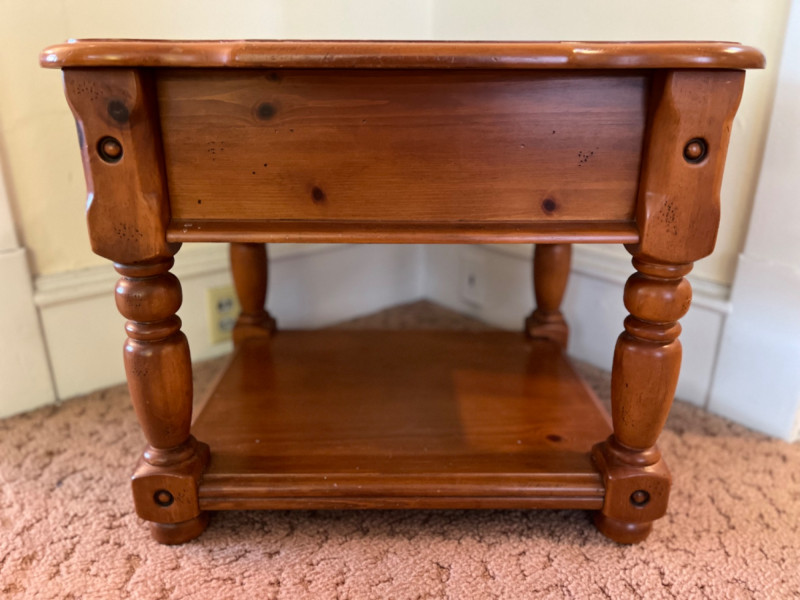 Traditional Wooden End Table with Drawer It features a single drawer and an open lower shelf, characterized by a scalloped edge on the tabletop and distinct, turned legs. The finish is a warm, natural wood tone. Some wear.