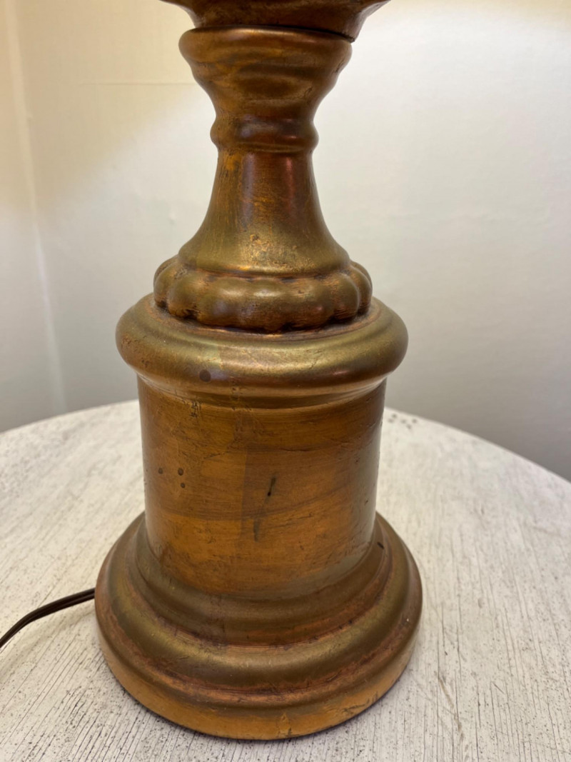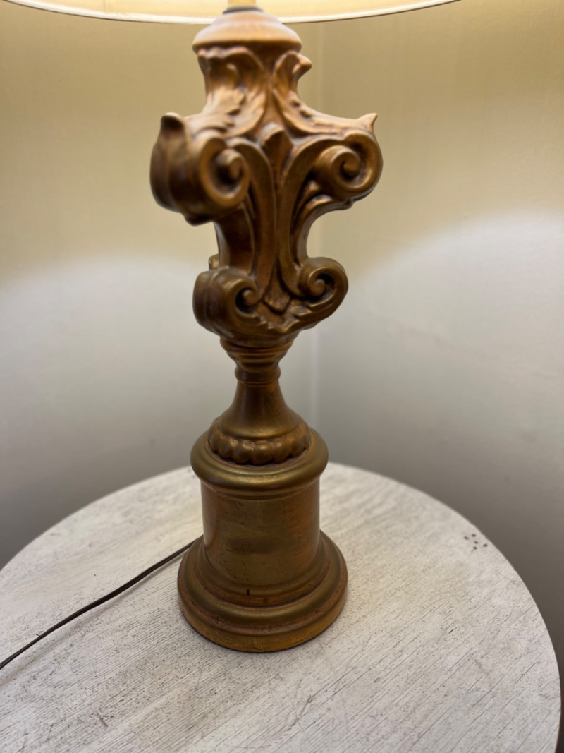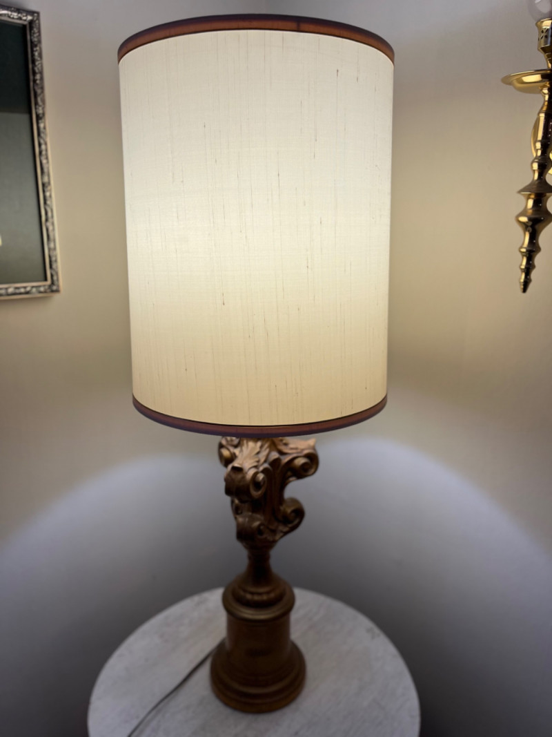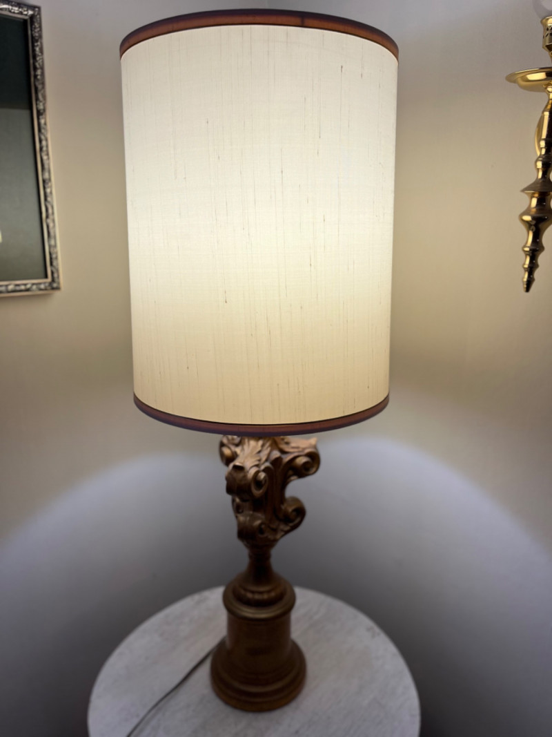 Vintage Rococo or Baroque Style Lamp The lamp's highly ornate and scrolled design is characteristic of the Rococo period, which emphasized elaborate ornamentation, though these pieces are usually vintage reproductions. The base is painted finished to look like aged gold or brass. Drum shaped lamp shade. 14”x38” Tested: Turns on.