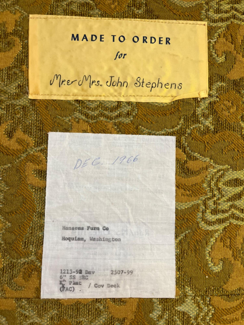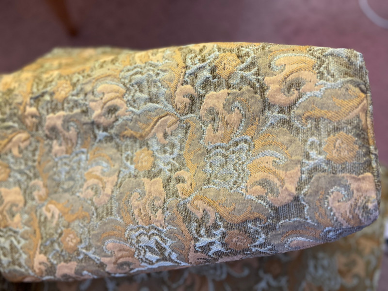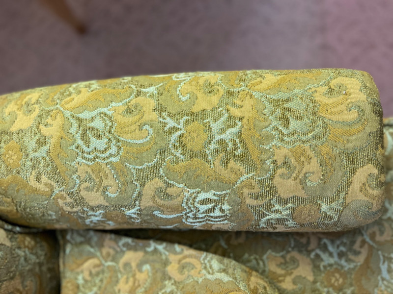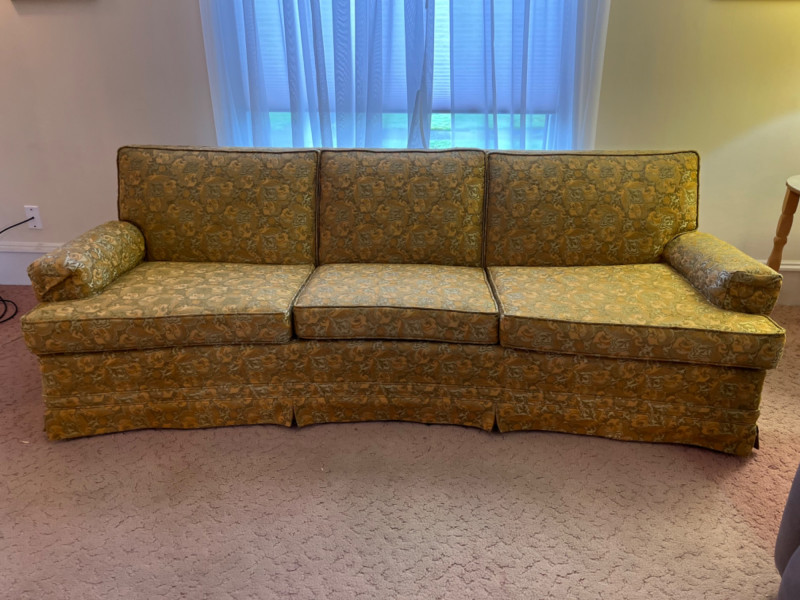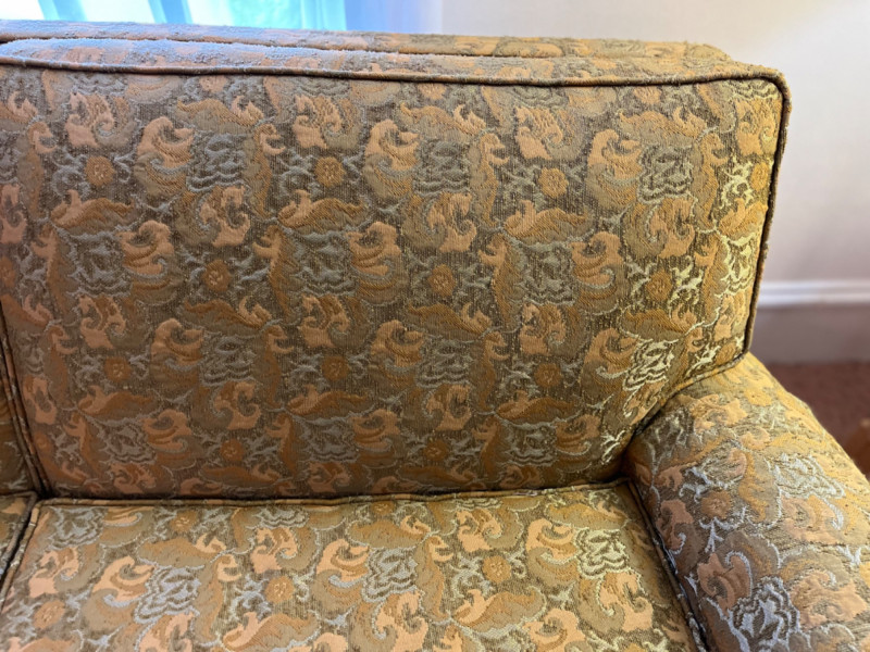 Mid-Century Modern Floral Upholstered Sofa It features a rich gold and yellow fabric, a damask/brocade weave, with an intricate floral pattern. The sofa has a multi-cushion design and a tailored skirt covering the base. Comes with arm rest covers. 85”x31”x29.5” Seat height is 17”.