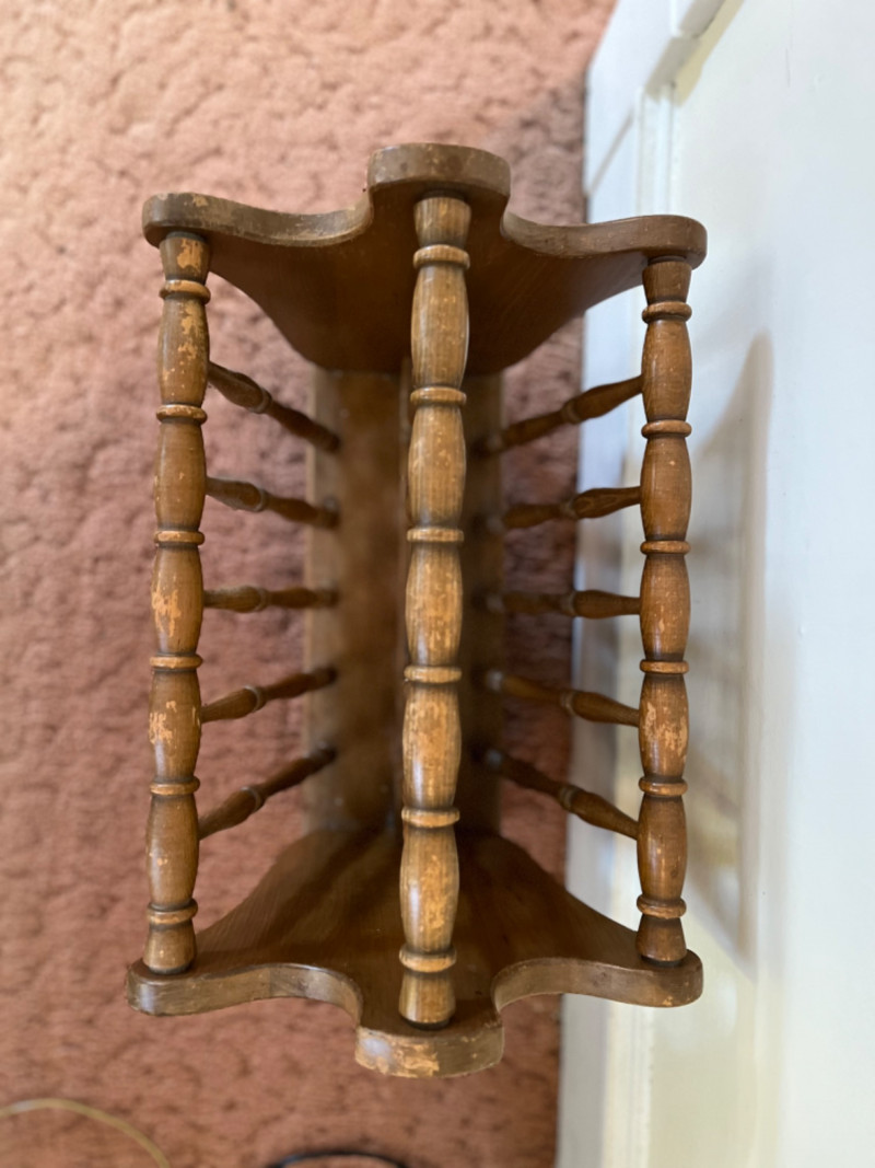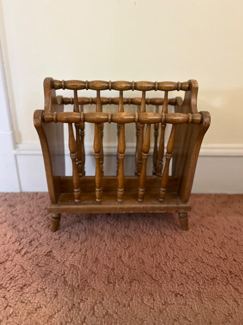 Mid-Century Modern Wooden Magazine Rack by Authentic Furniture Spindle magazine racks with this design can fit into a range of home decor, including vintage, rustic farmhouse, or mid-century modern interiors. The rack is made of solid wood, likely oak, maple, or walnut, and typically has a natural or warm finish. It is designed to store magazines, newspapers, or even vinyl records and can be used in a living room, office, or study. Some wear. 17”x12.5”x18.5”