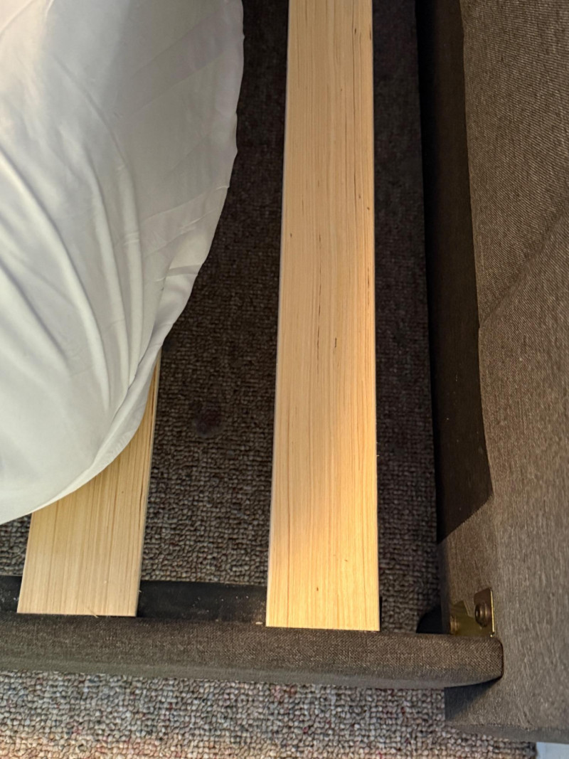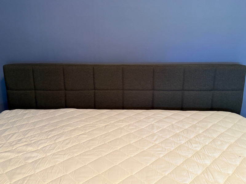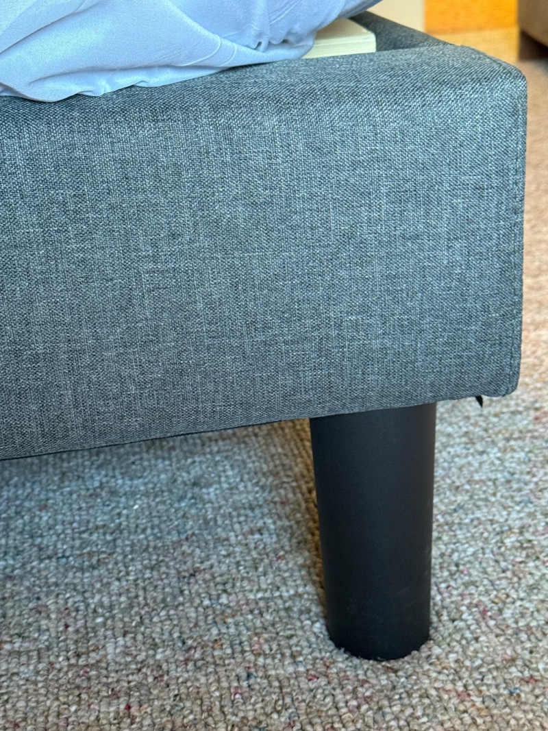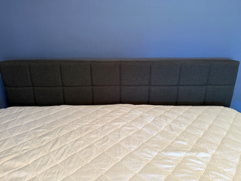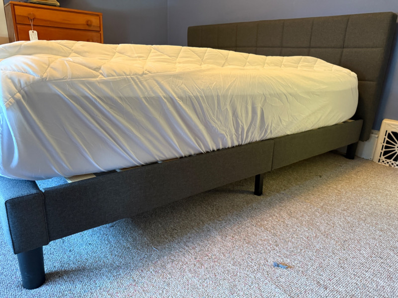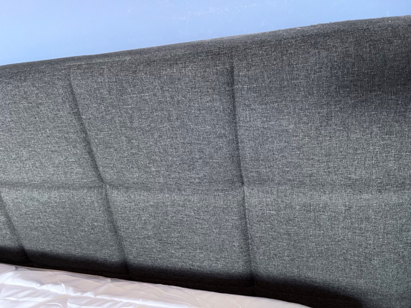 Modern Dark Gray Fabric Upholstered King Size mattress platform. Foam top mattress with some staining is available. Dark gray fabric upholstered frame with square tufting. 76” x 83“ x 38“