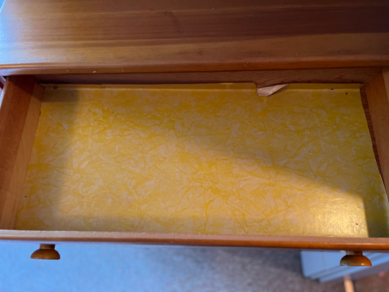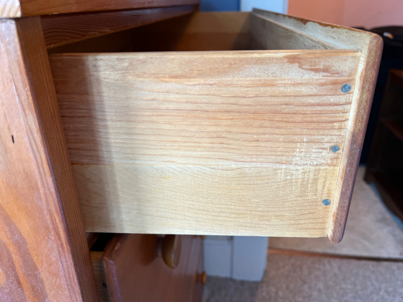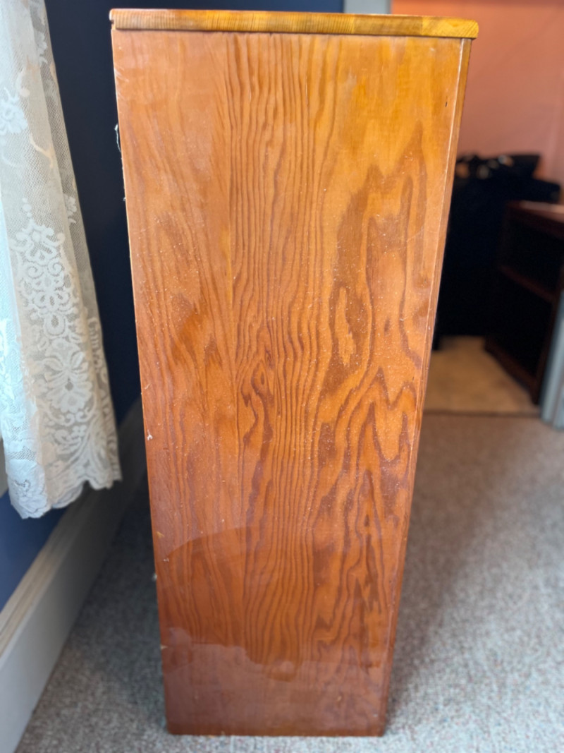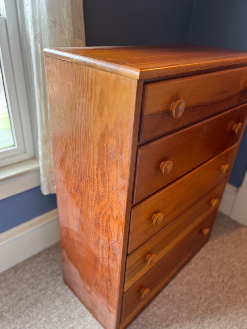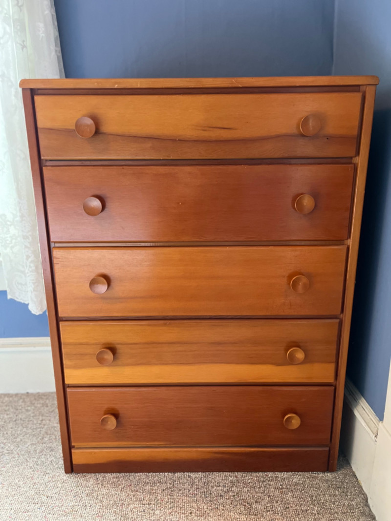 Solid Wood 5-Drawer Chest The dresser features five vertically stacked drawers with a simple, classic design that includes round concave wooden knobs on each drawer front. Some surface scratches. 30”x14”x40”
