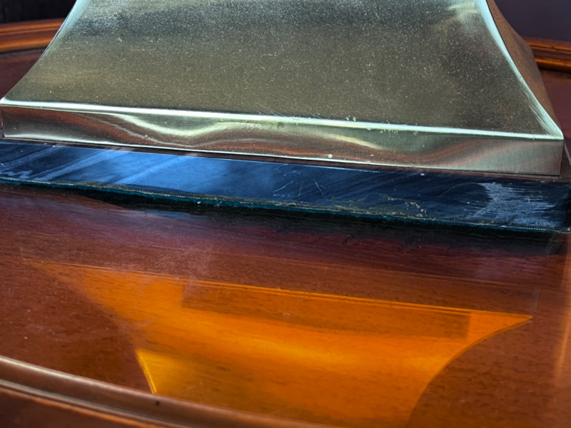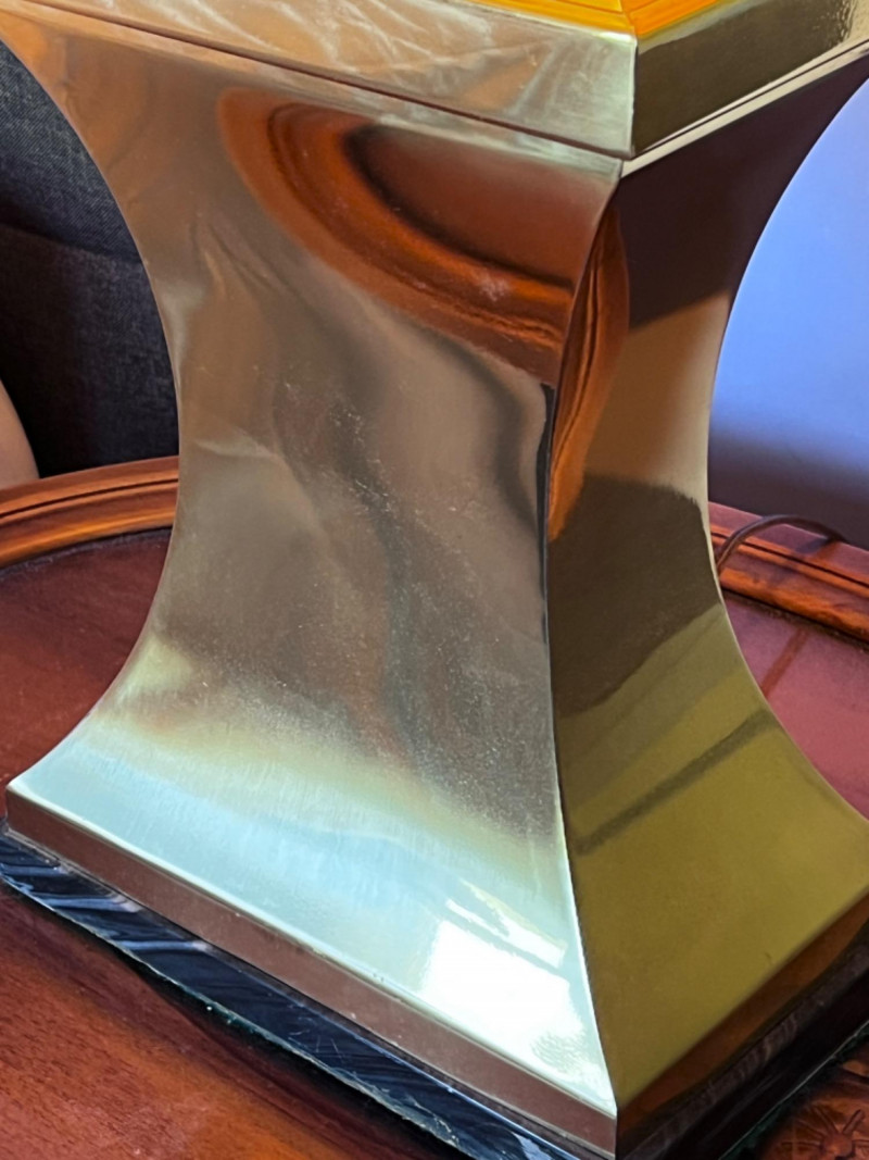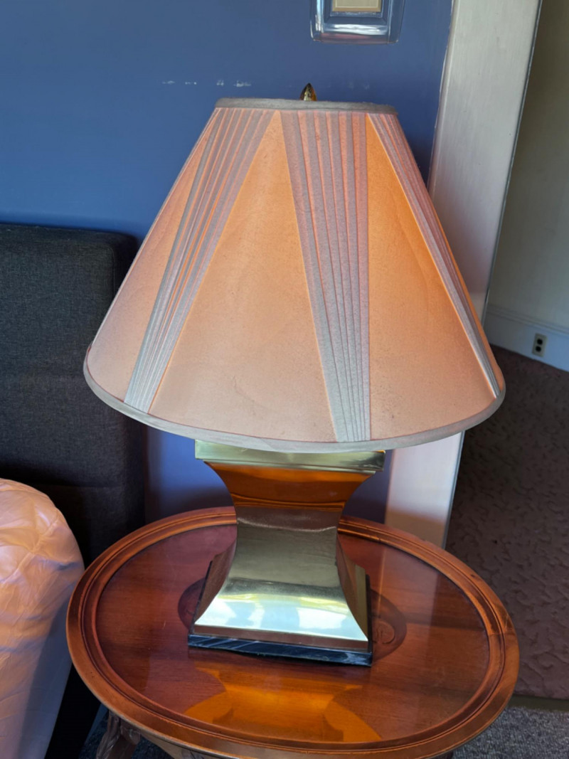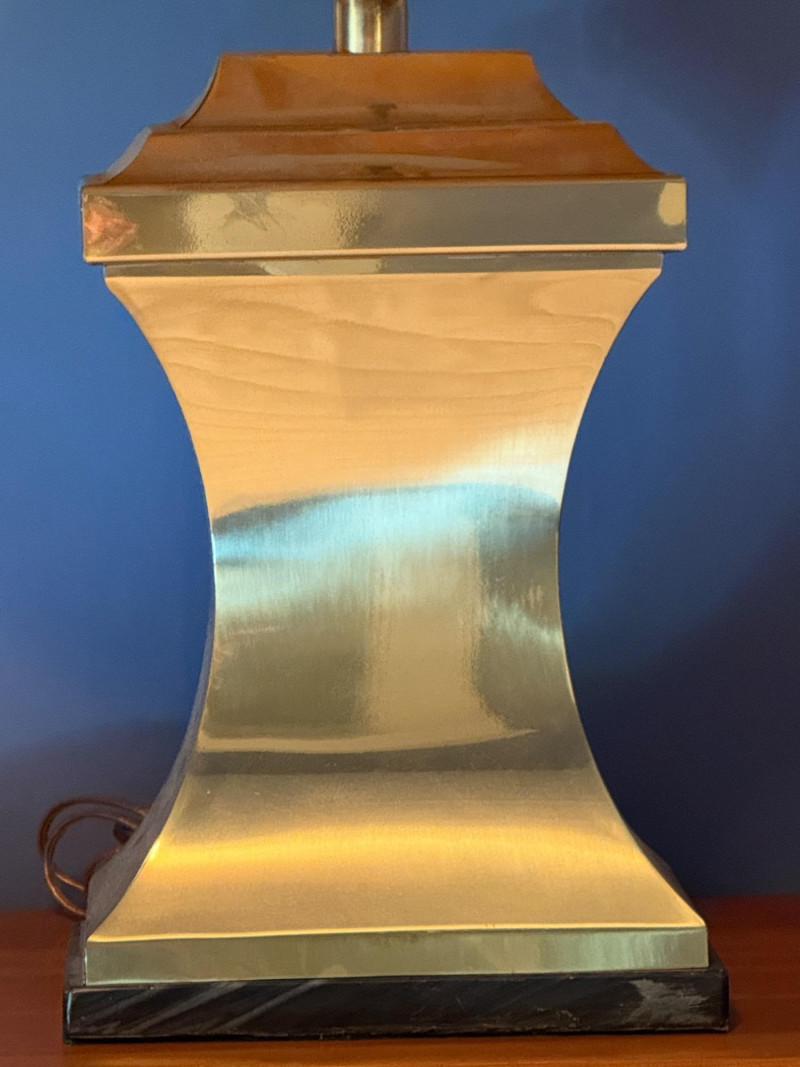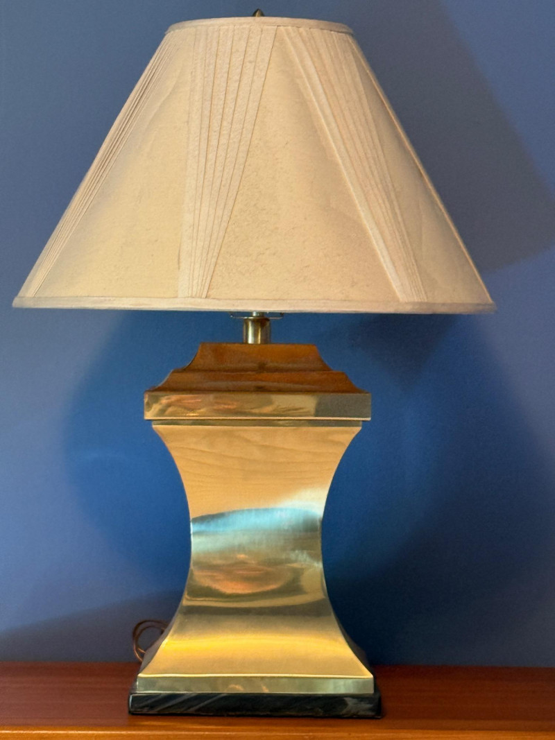Polished brass hourglass table lamp, also described in some retail listings as having an "Empire" or "Mid-Century Modern" style. The lamp features a highly reflective, polished brass body that tapers to an hourglass shape, set upon a dark square base, with a wooden cap leading to the socket. It is topped with a cream or off-white pleated empire shade. Shade has interior cracking and needs cleaning. Gold-Toned Metal Lamp with Marble Base Tested: Works.