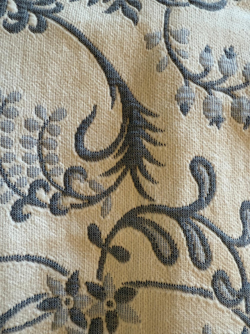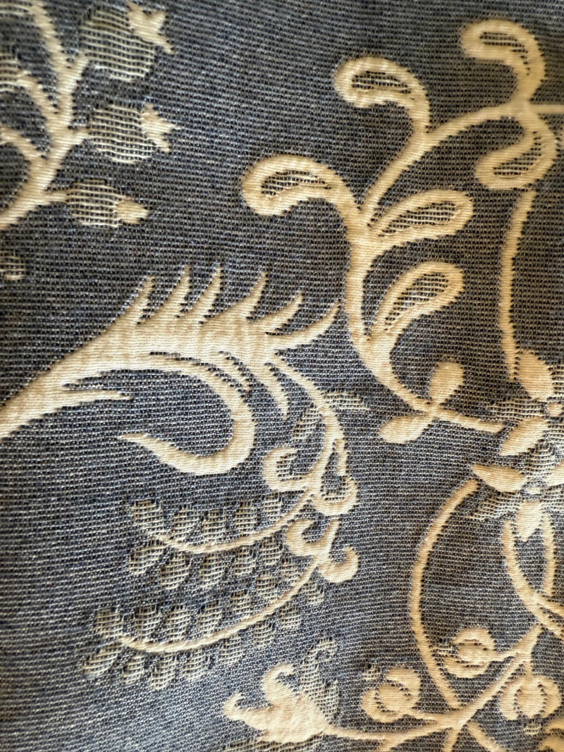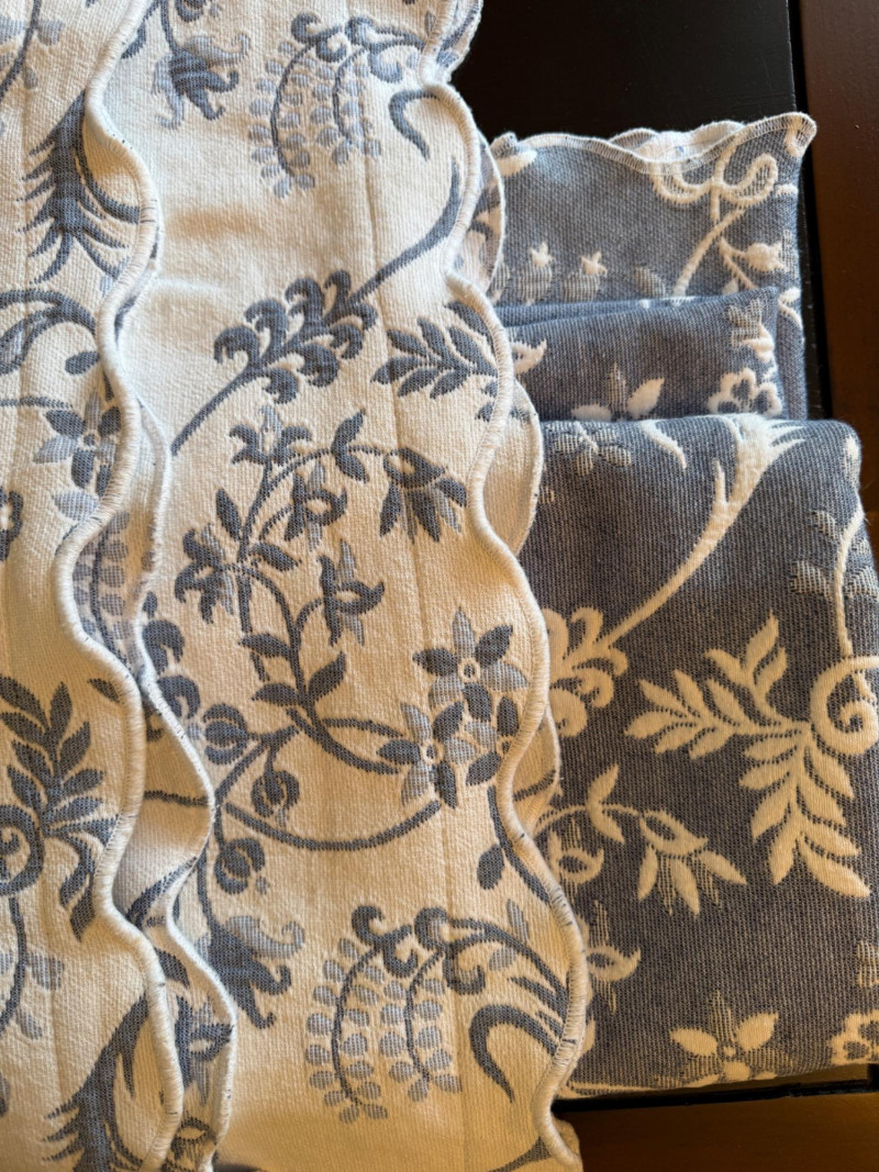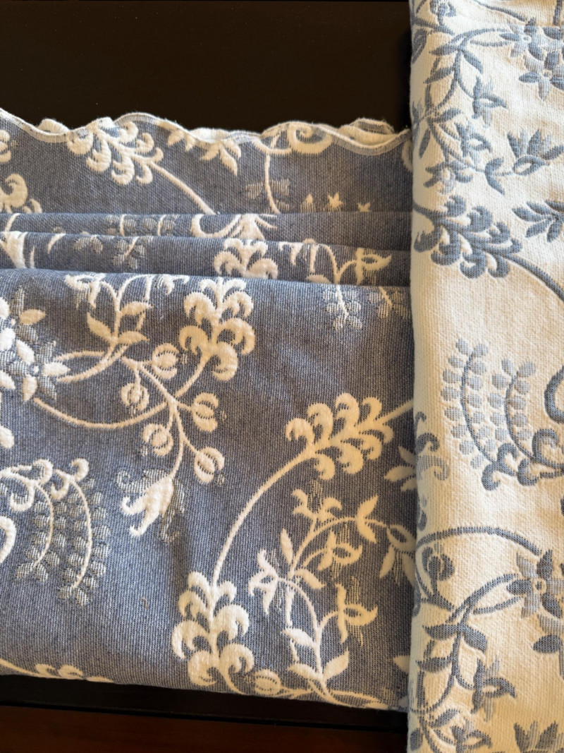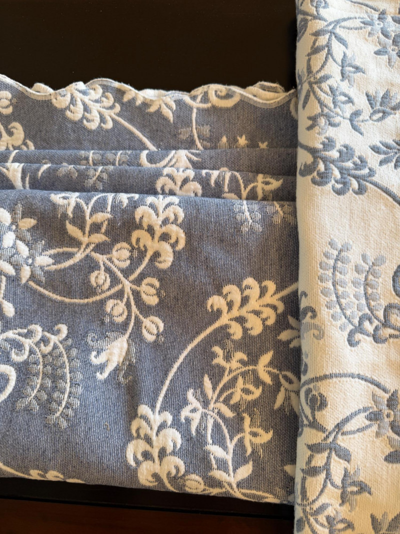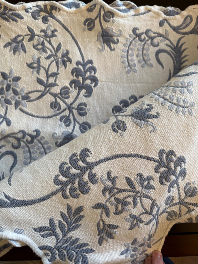 Reversible Queen Coverlet and European Shams. Tag is faded, appears to be queen size. Cornflower blue and white. Shams are white with blue.