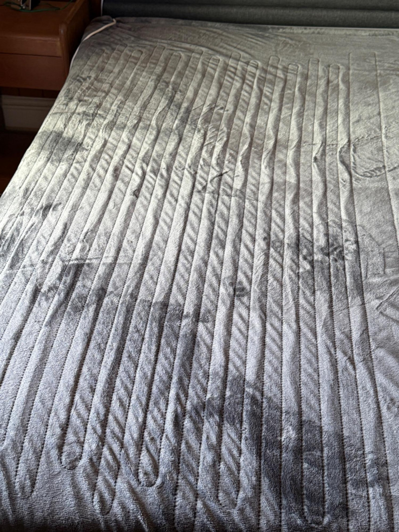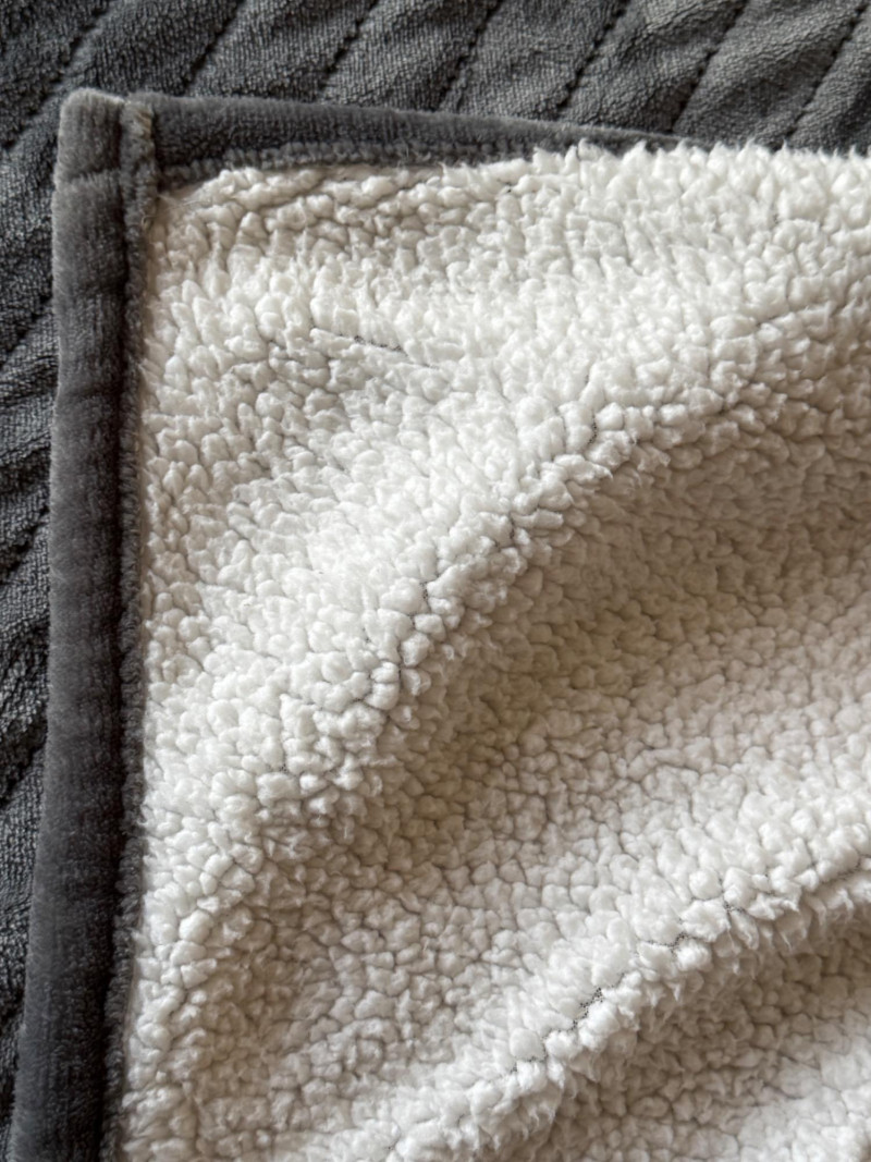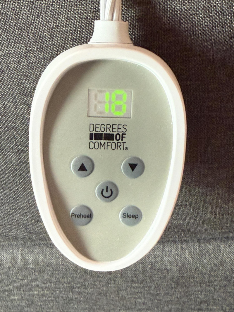 King Dual Control Plush Warming Blanket. Gray plush and Sherpa backing, with settings from 1-20 and pre-heat feature.