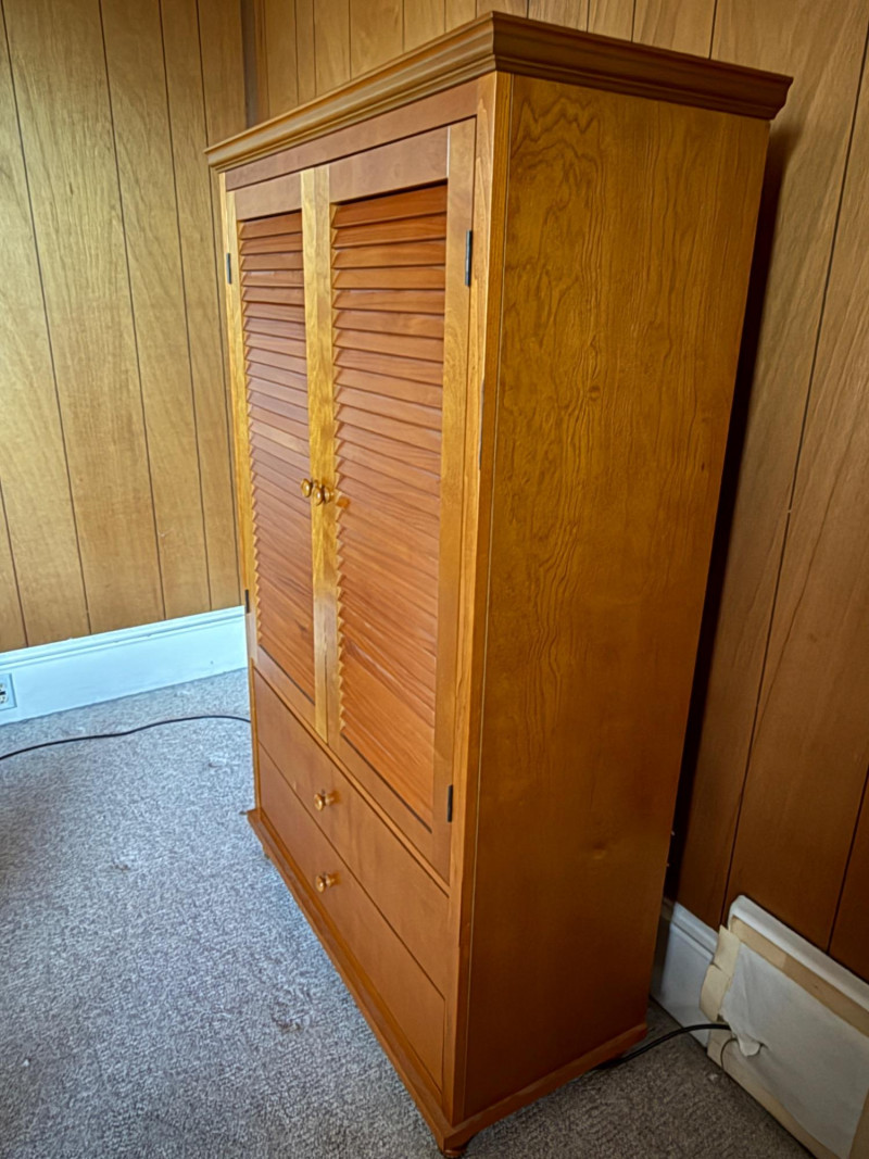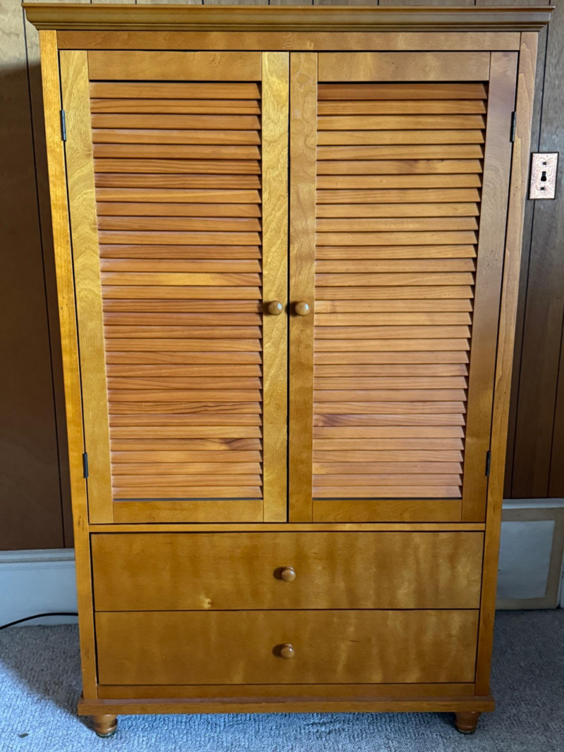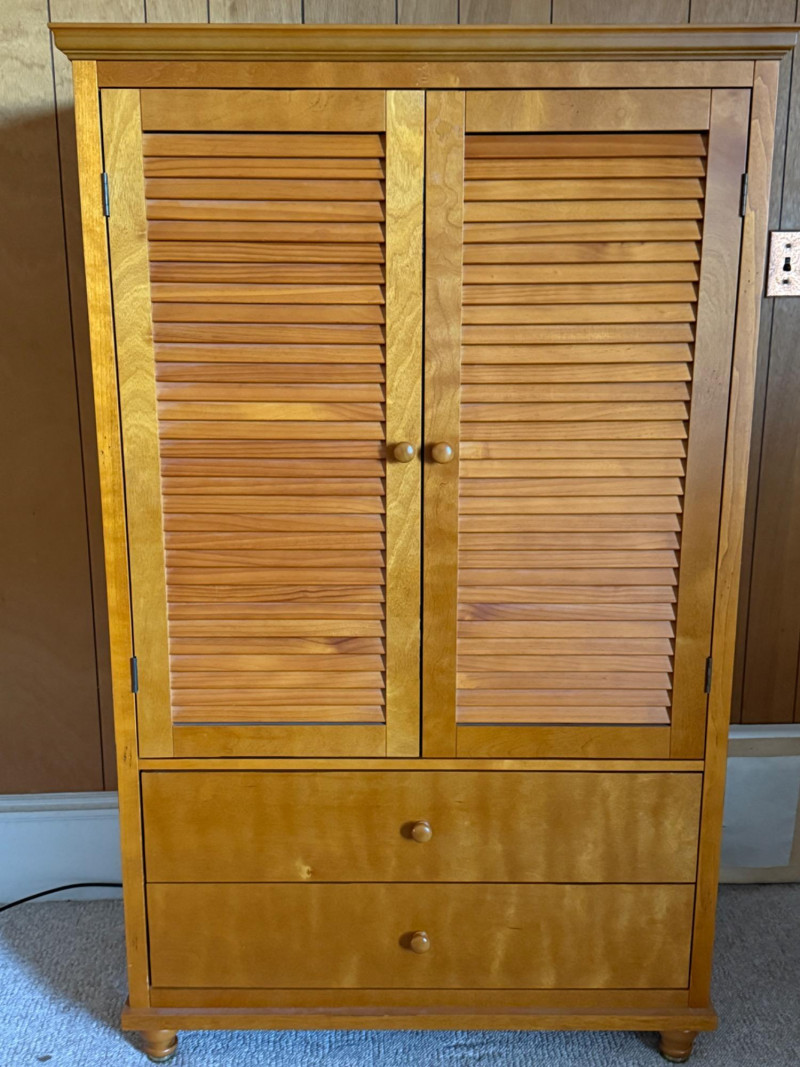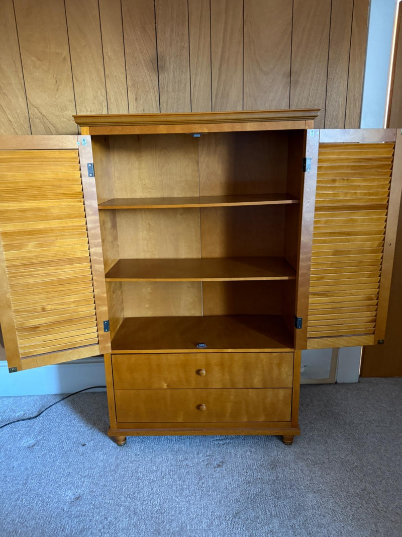 Maple Veneer Double Louvered Door Cabinet Behind two doors are 2 shelves with 2 lower drawers Some scuffs near edge of drawers and black mark on side edge. One drawer held too much weight and the bottom is separated from the back. The screw in one leg is stripped and comes out of the hole when lifted. Needs a little repair.