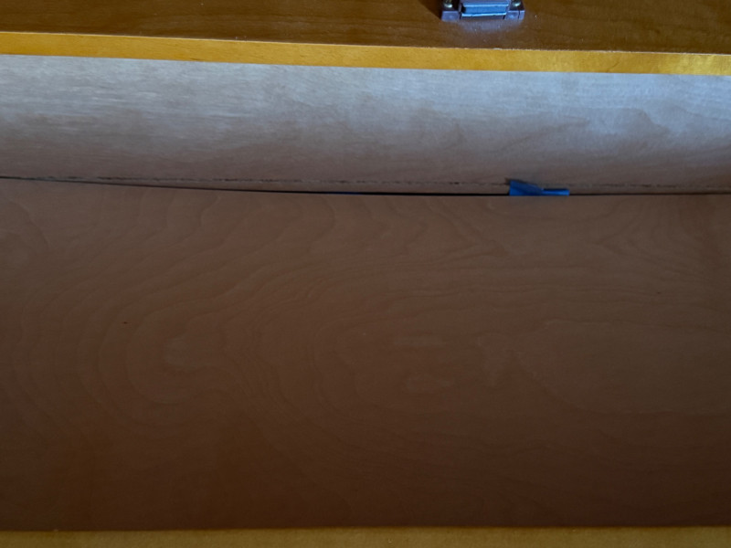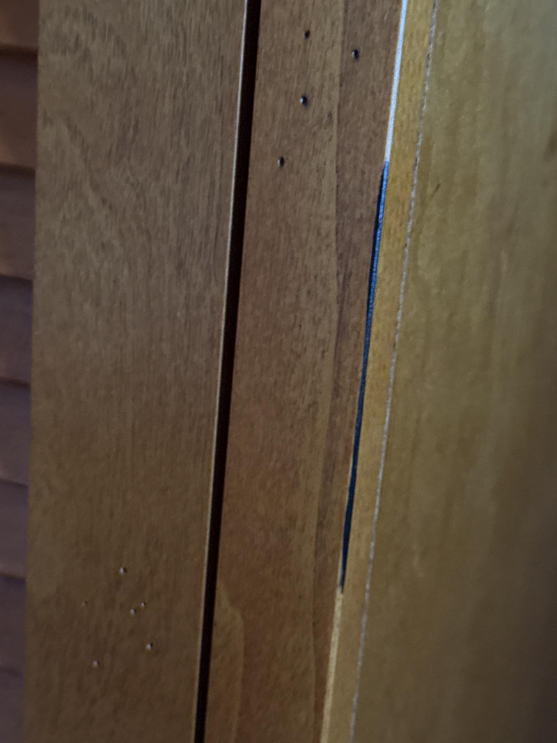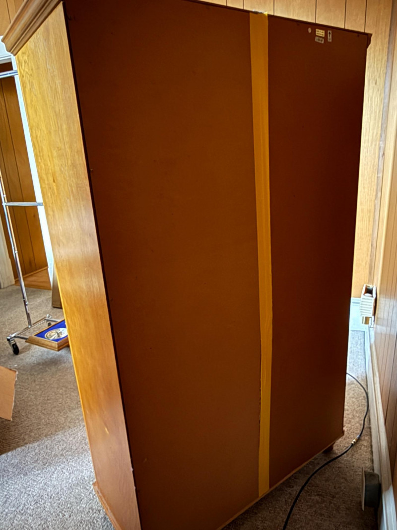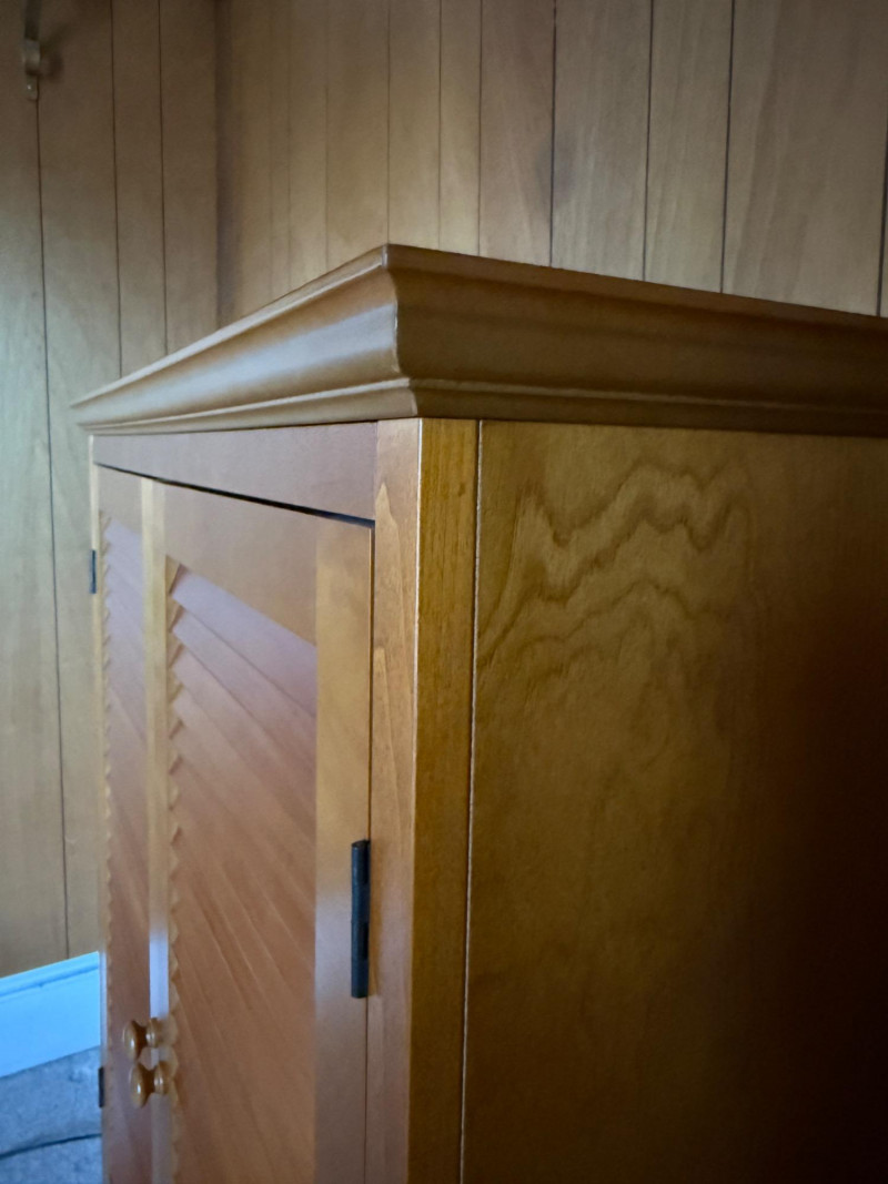 Maple Veneer Double Louvered Door Cabinet Behind two doors are 2 shelves with 2 lower drawers Some scuffs near edge of drawers and black mark on side edge. One drawer held too much weight and the bottom is separated from the back. The screw in one leg is stripped and comes out of the hole when lifted. Needs a little repair.