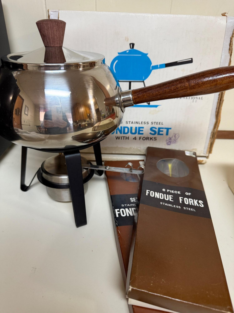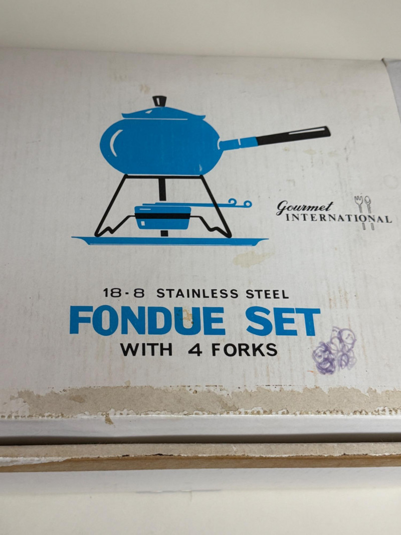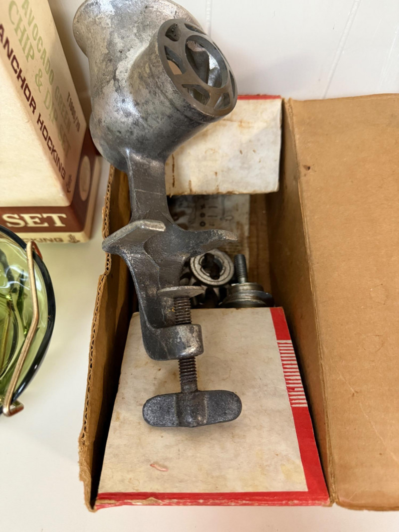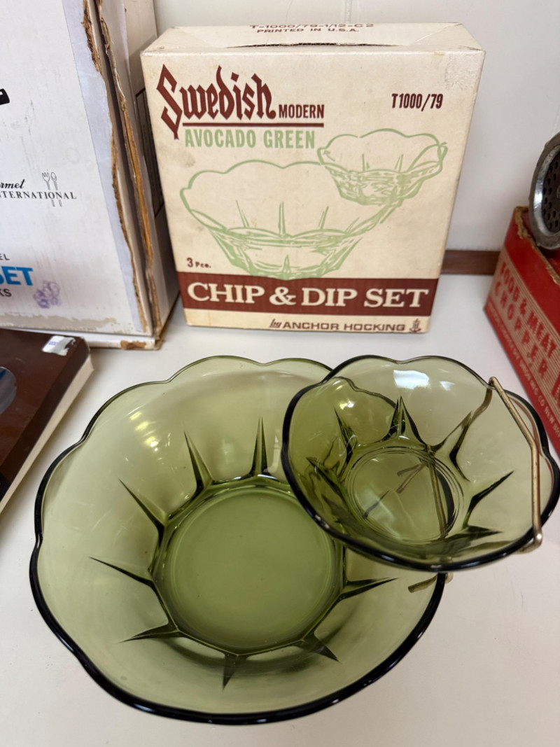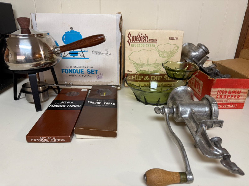 Vintage Kitchen - Fondue Set - Chip & Dip - Meat Choppers Gourmet International fondue set with forks. Stainless pot with wood handle uses sterno fuel. In original box. Swedish Modern Avocado Green chip bowl with dip bowl that sits on the edge with a wire holder. In original box. Swing-A-Part, and Ward's food choppers.
