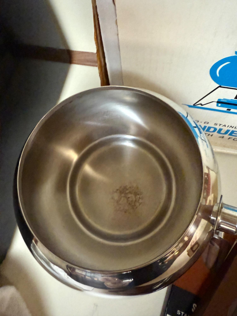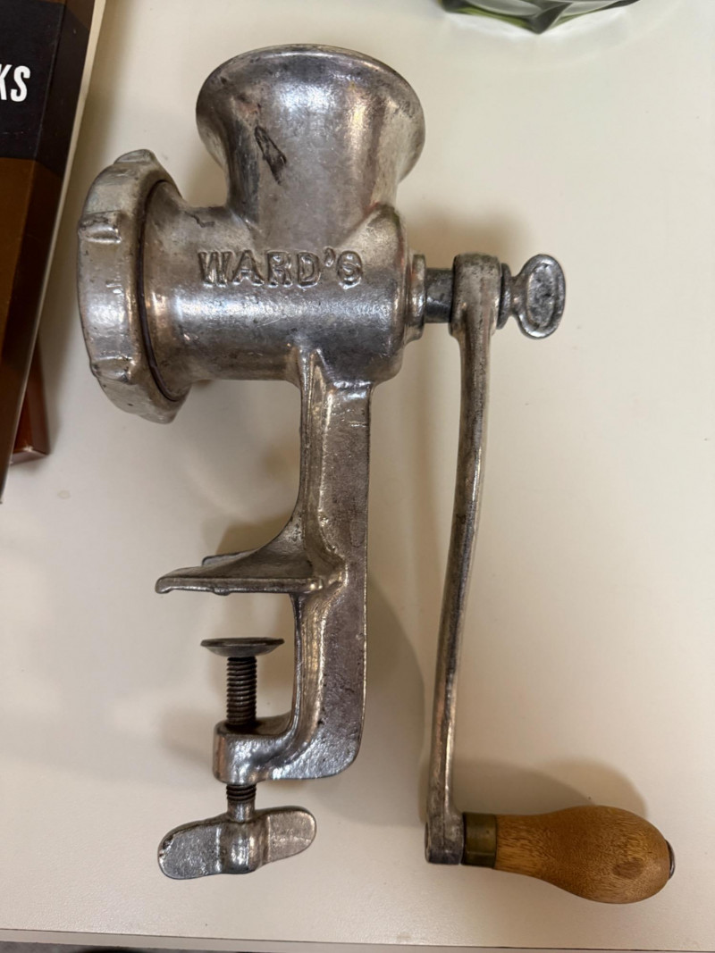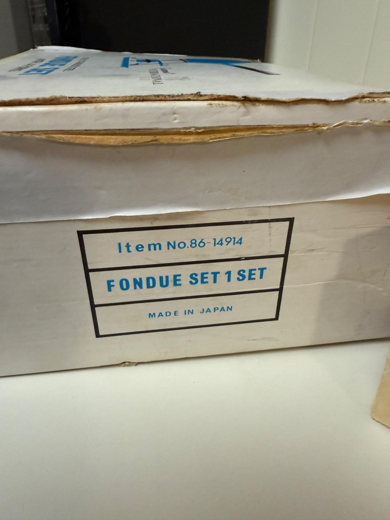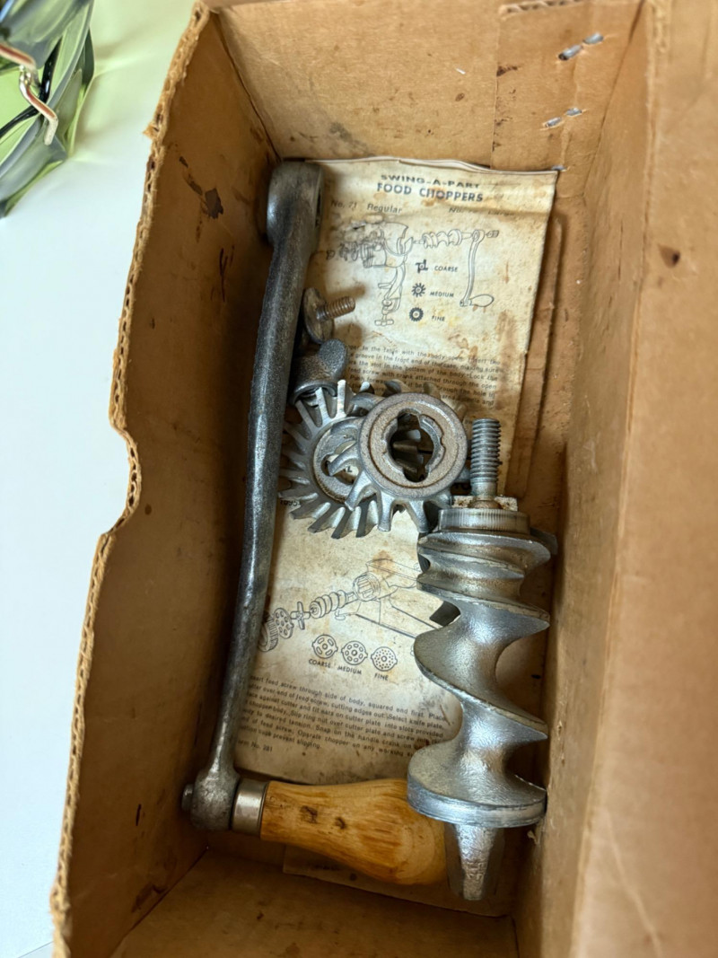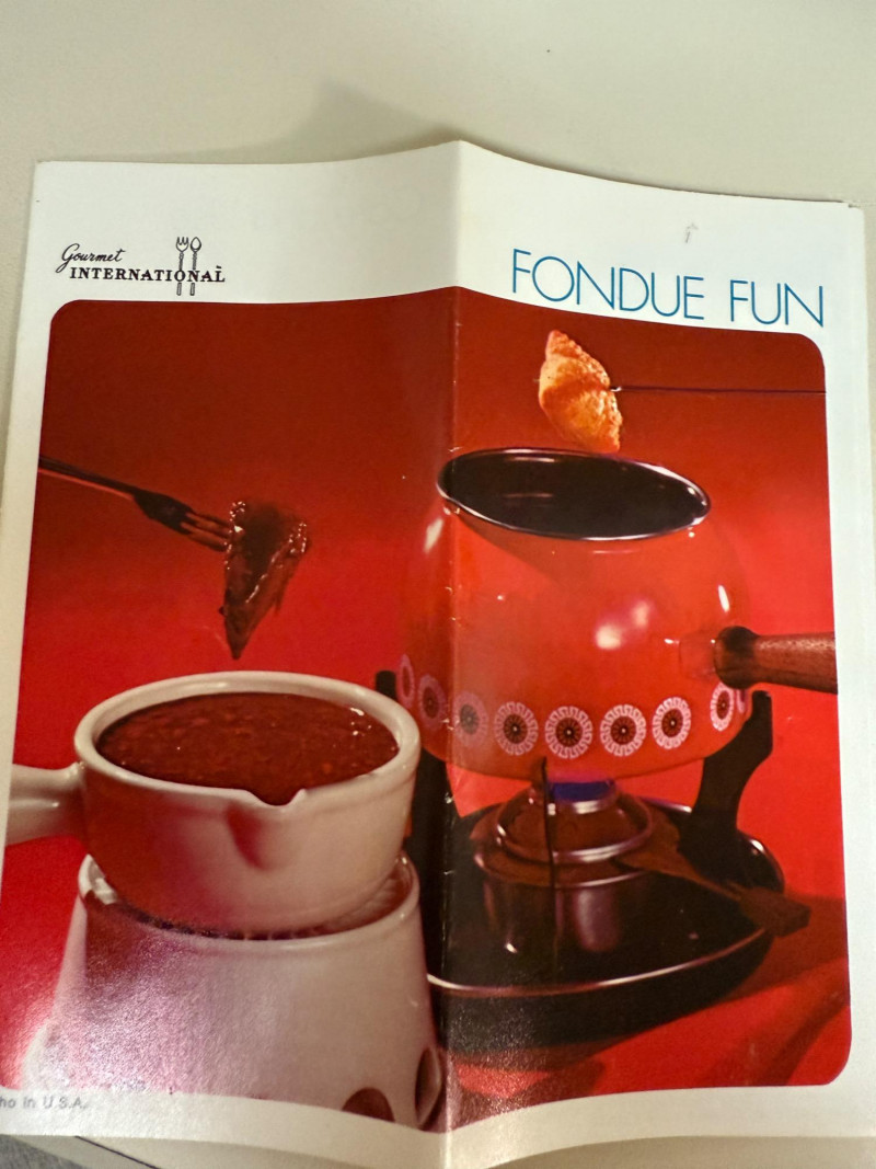 Vintage Kitchen - Fondue Set - Chip & Dip - Meat Choppers Gourmet International fondue set with forks. Stainless pot with wood handle uses sterno fuel. In original box. Swedish Modern Avocado Green chip bowl with dip bowl that sits on the edge with a wire holder. In original box. Swing-A-Part, and Ward's food choppers.