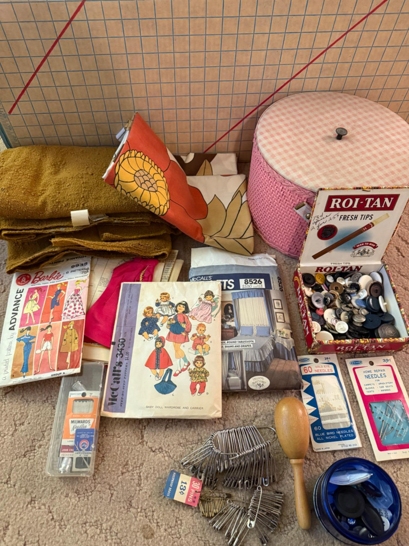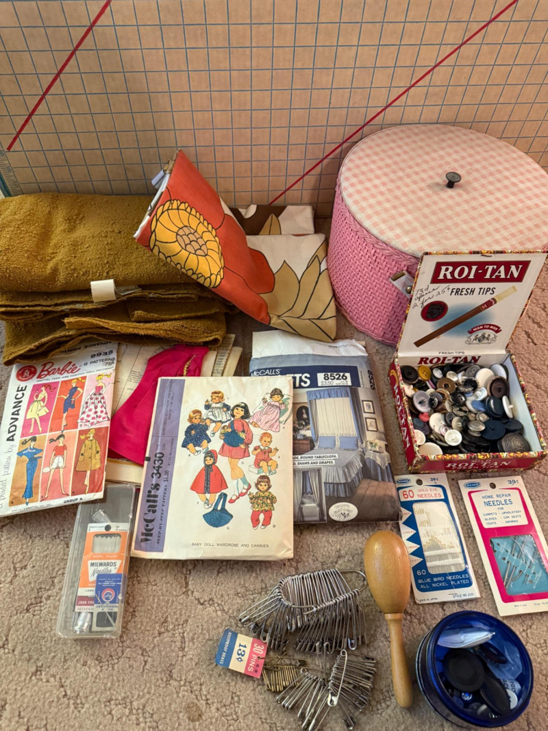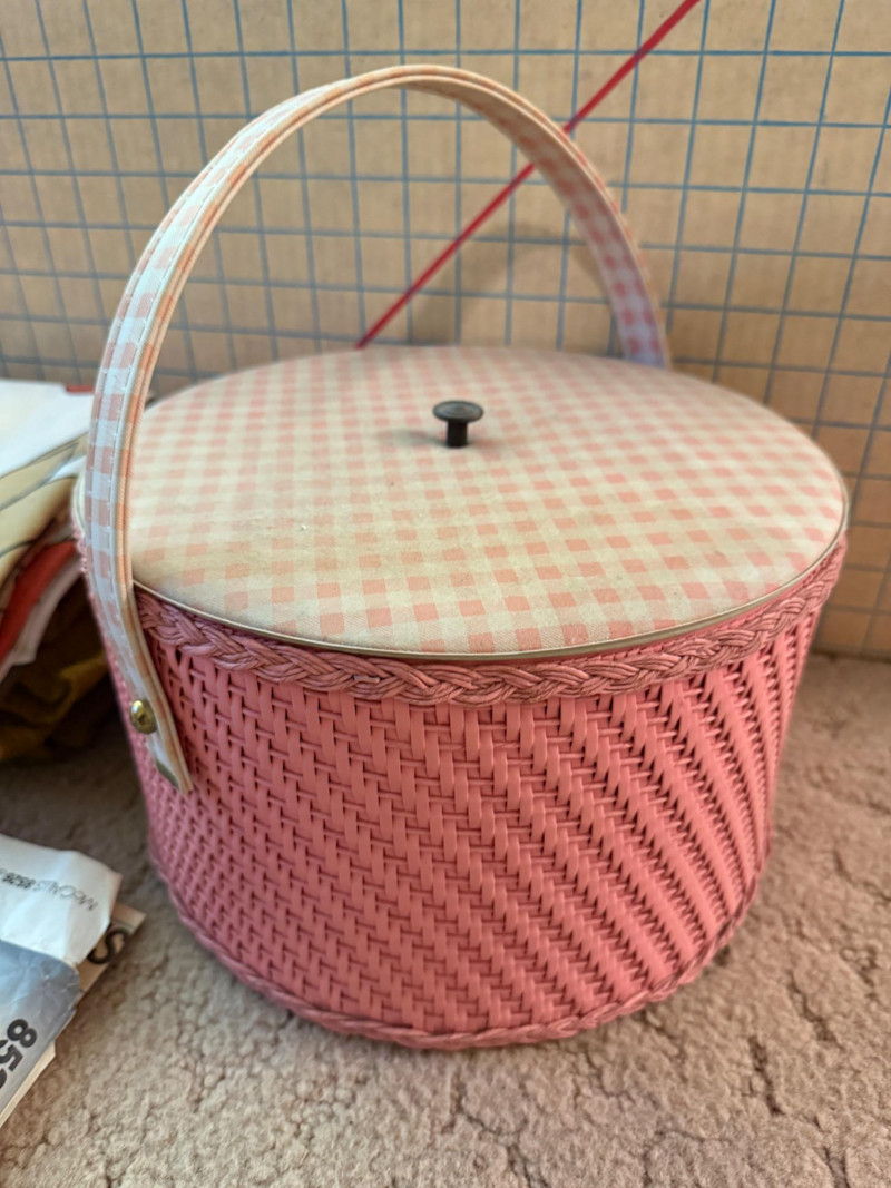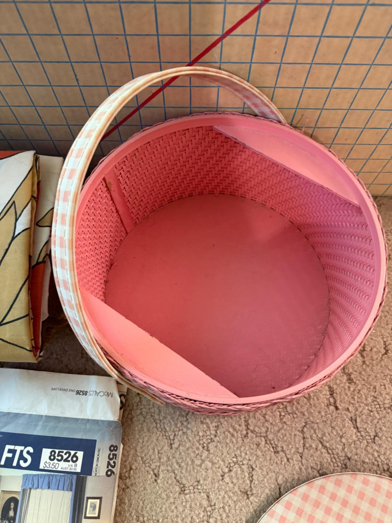 Pink Vintage Sewing Basket - Buttons - Pattern Cutting Board Pink wicker lidded sewing basket with pink fabric lid and handle cover. Barbie clothes pattern Doll pattern Safety pins a-plenty 70's Vintage thick Boucle upholstery fabric 70's Vintage brown, orange and yellow floral fabric