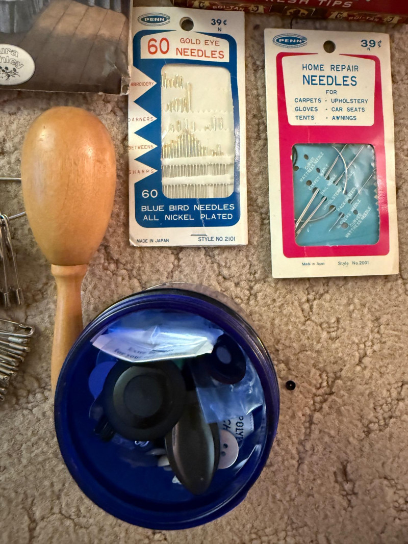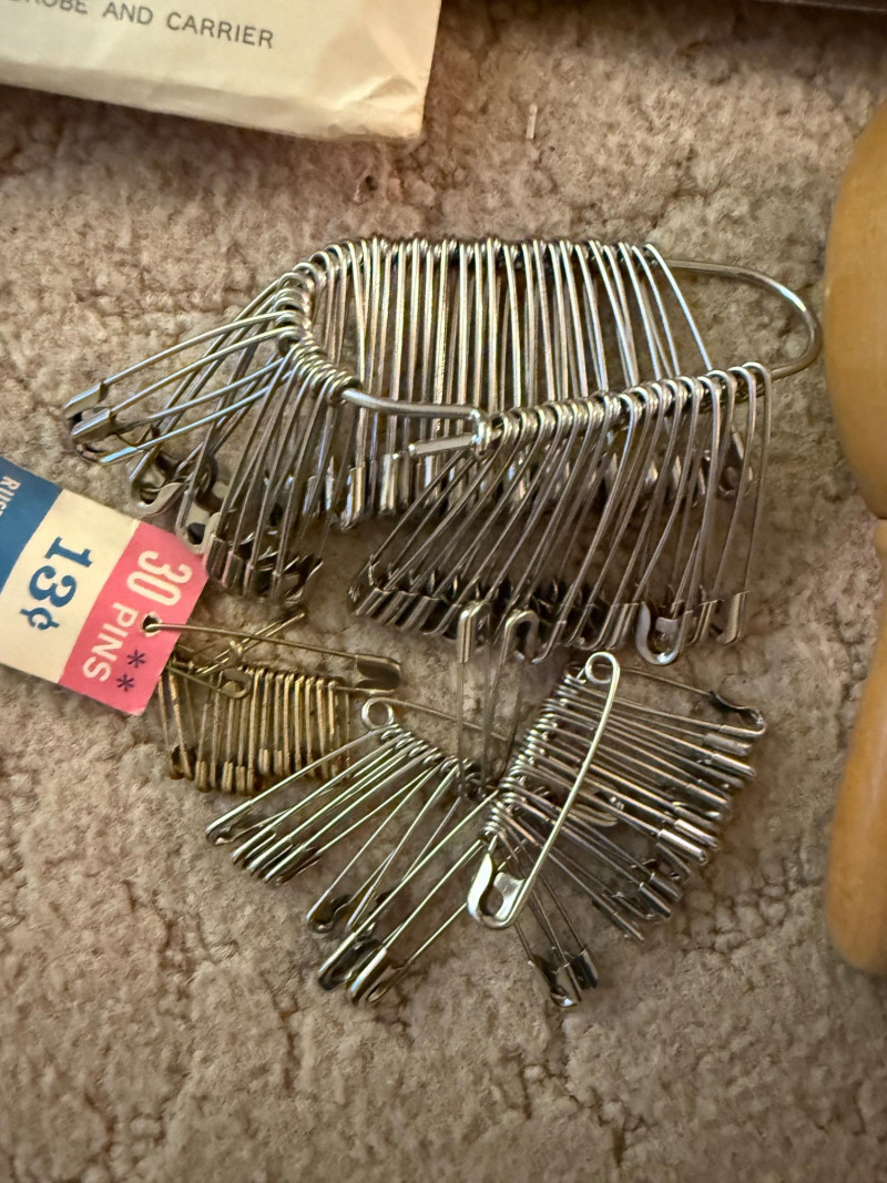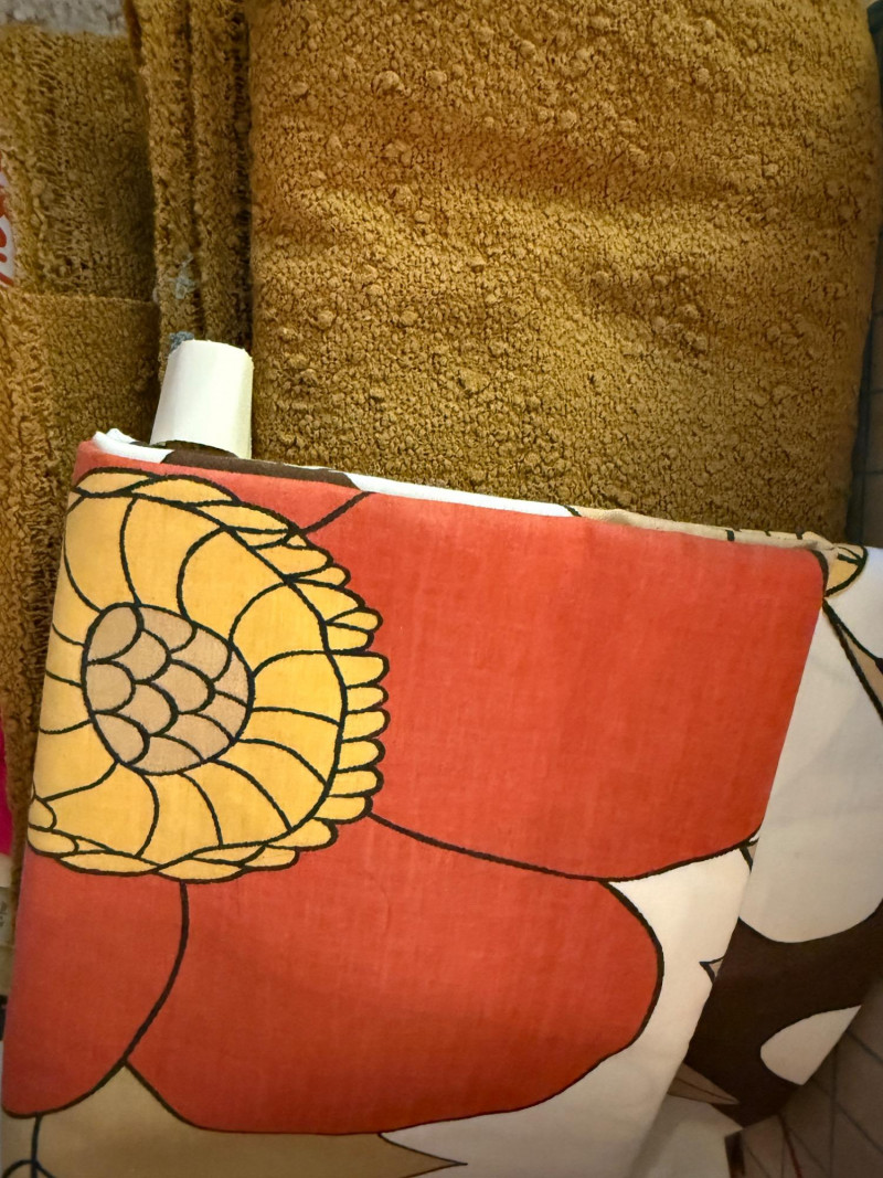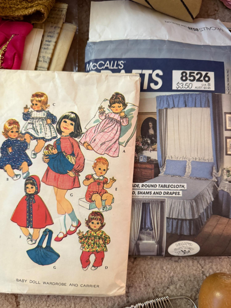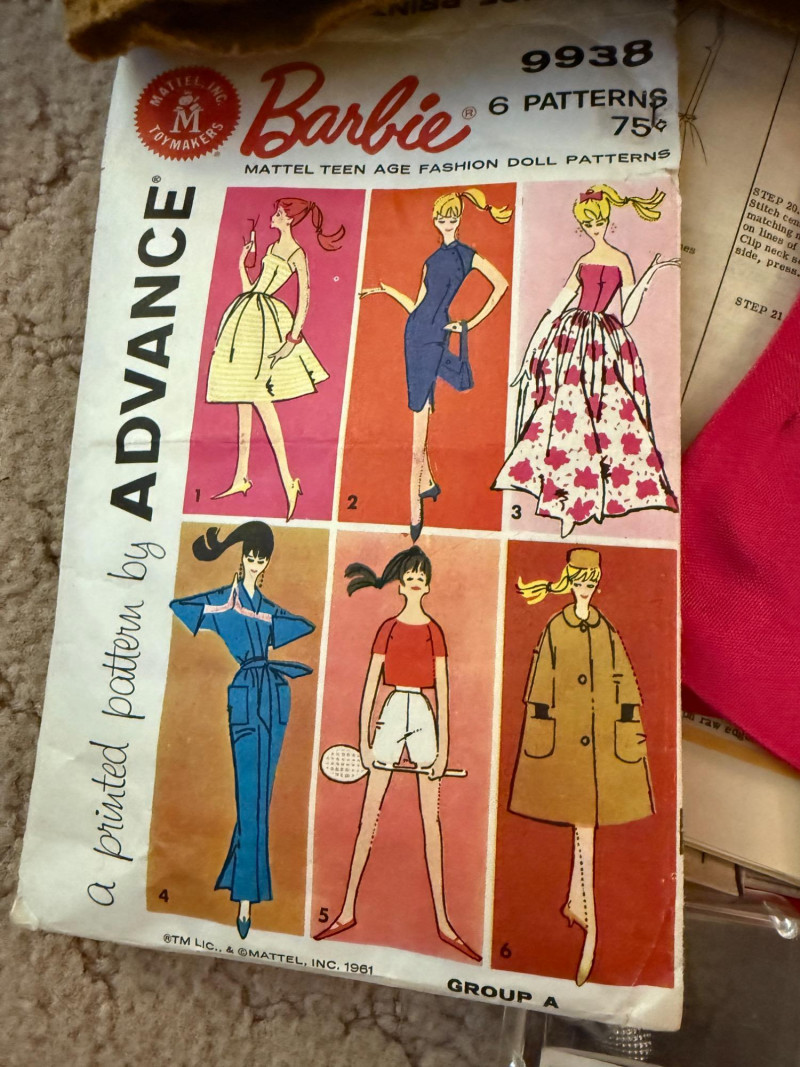 Pink Vintage Sewing Basket - Buttons - Pattern Cutting Board Pink wicker lidded sewing basket with pink fabric lid and handle cover. Barbie clothes pattern Doll pattern Safety pins a-plenty 70's Vintage thick Boucle upholstery fabric 70's Vintage brown, orange and yellow floral fabric