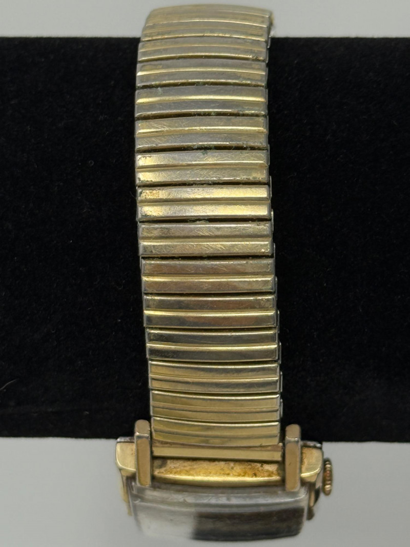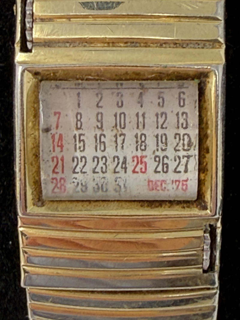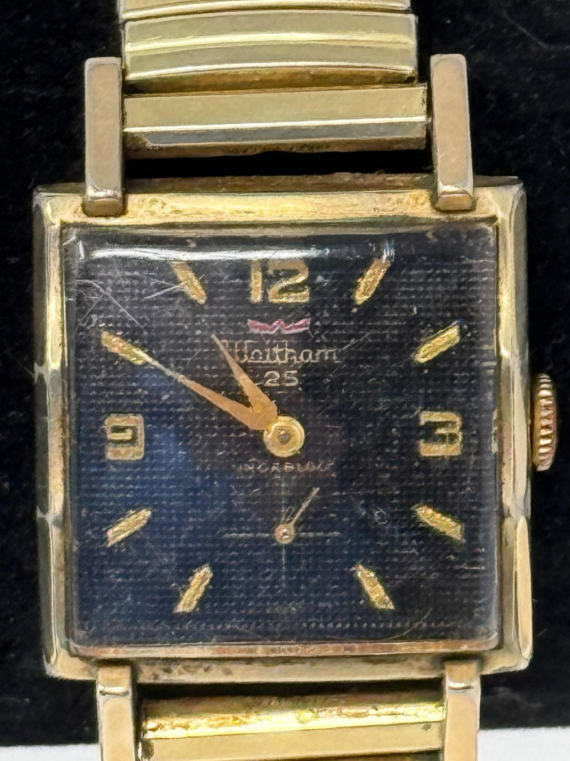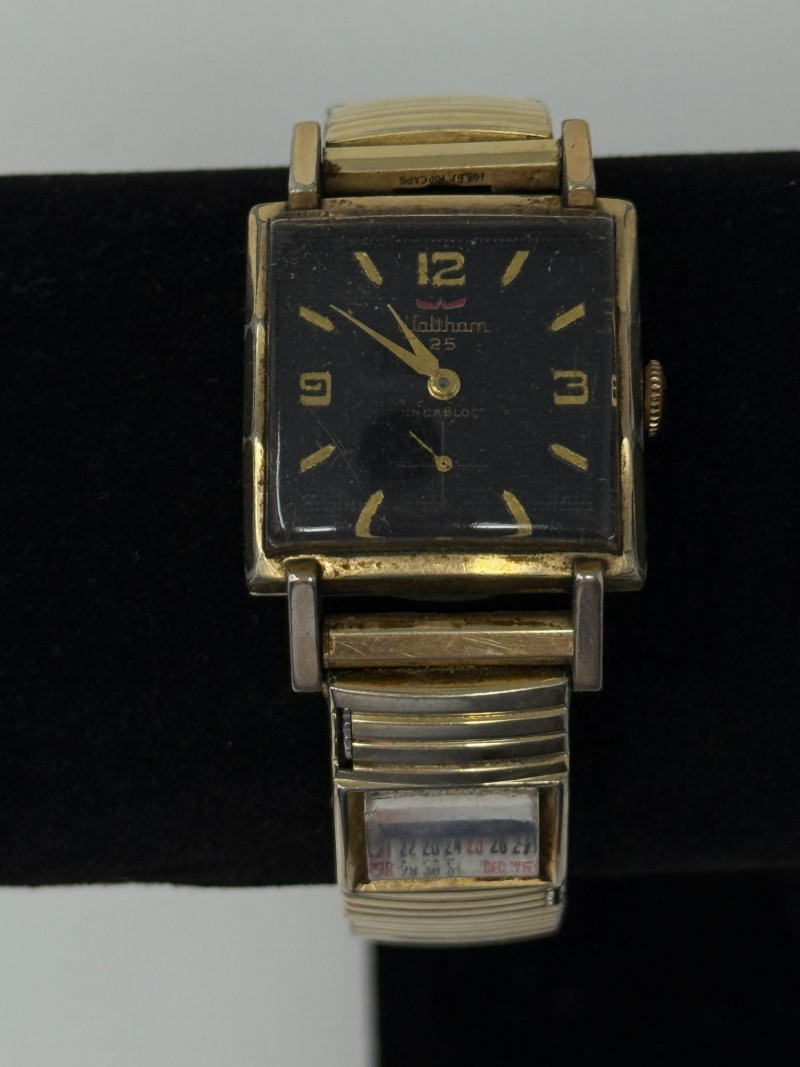 Vintage Waltham 17 jewel manual-wind ladies' wristwatch, typically dating from the 1960s or 1970s. The watch is likely Swiss-made, as the American Waltham Watch Company ceased U.S. production in 1957 and subsequently produced watches with imported Swiss movements. Vintage Waltham men's wristwatch with a square gold-tone case and a black dial. Waltham Case Square Dial: Black with gold-tone hands and hour markers. The text on the dial indicates it has 21 jewels, manual-wind (mechanical) movement, which is common for watches of this vintage and jewel count. The band is a Speidel 10K gold filled flexible expansion or stretch band. With currently a December 1973 calendar on the band.