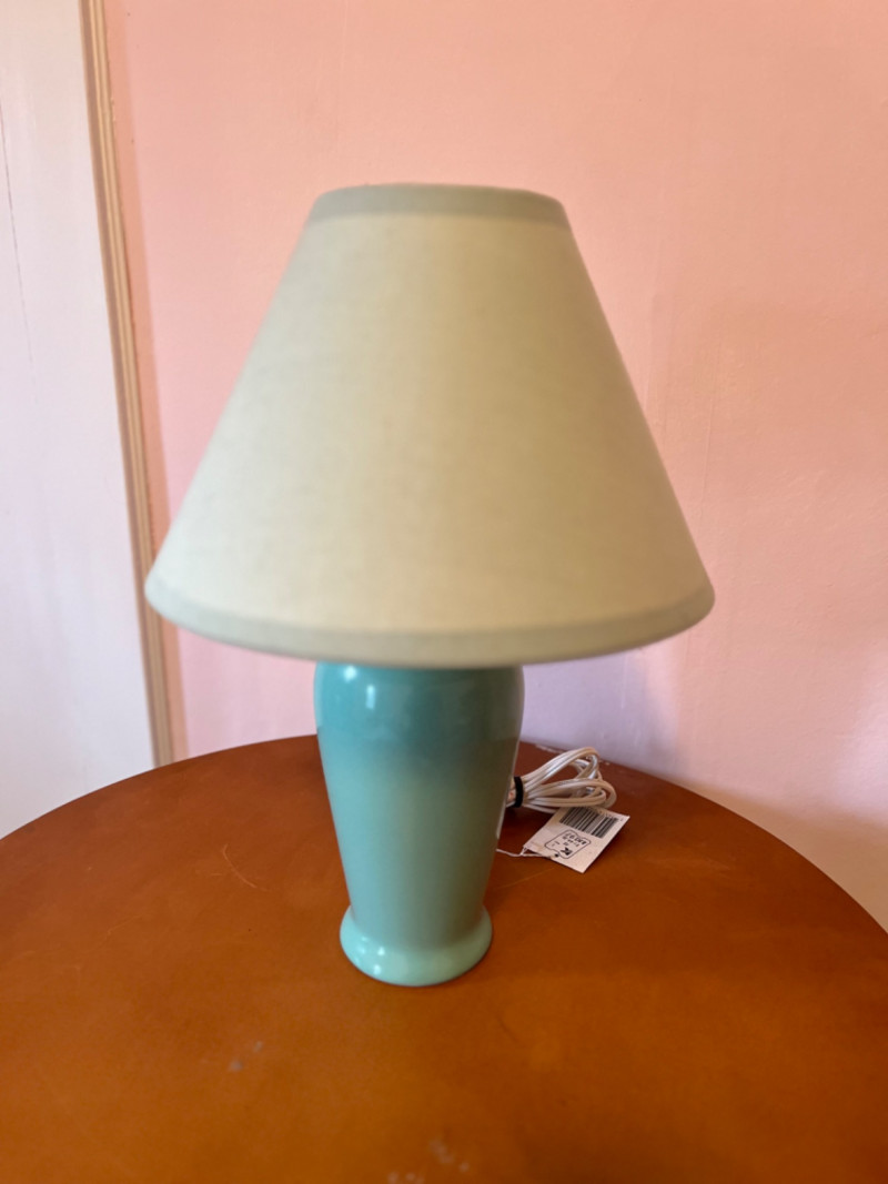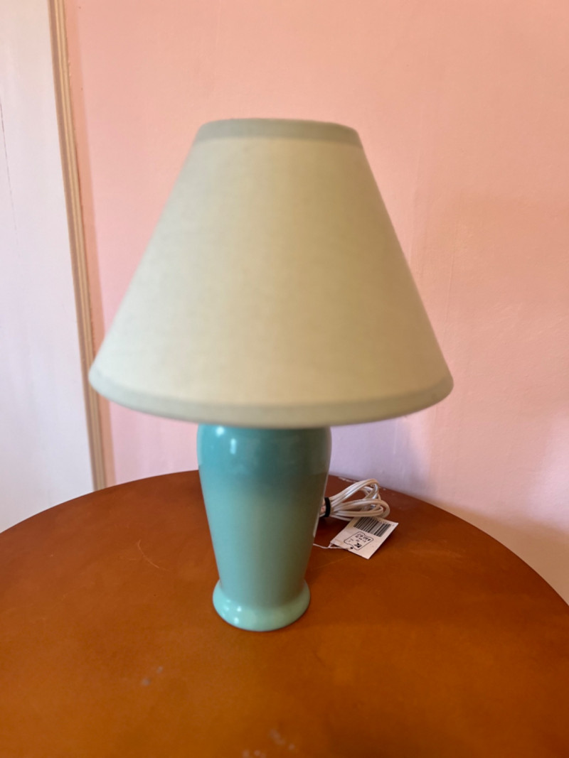 Ceramic lamp with teal lamp shade.