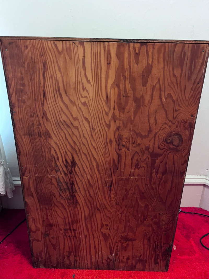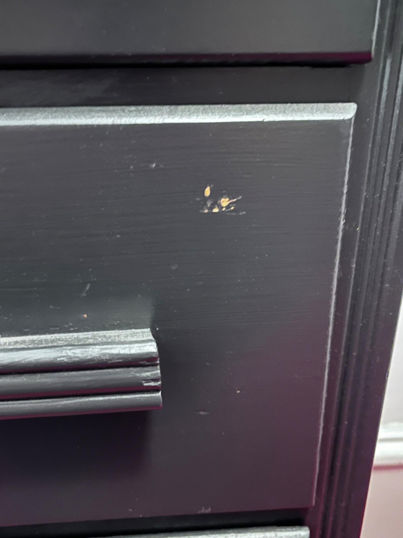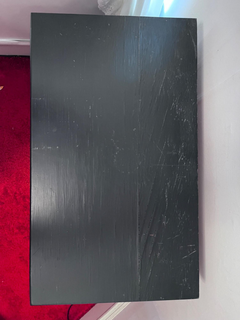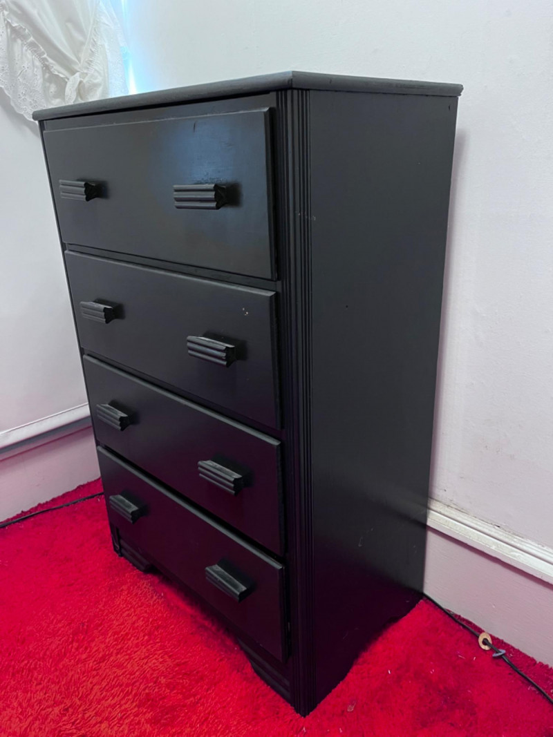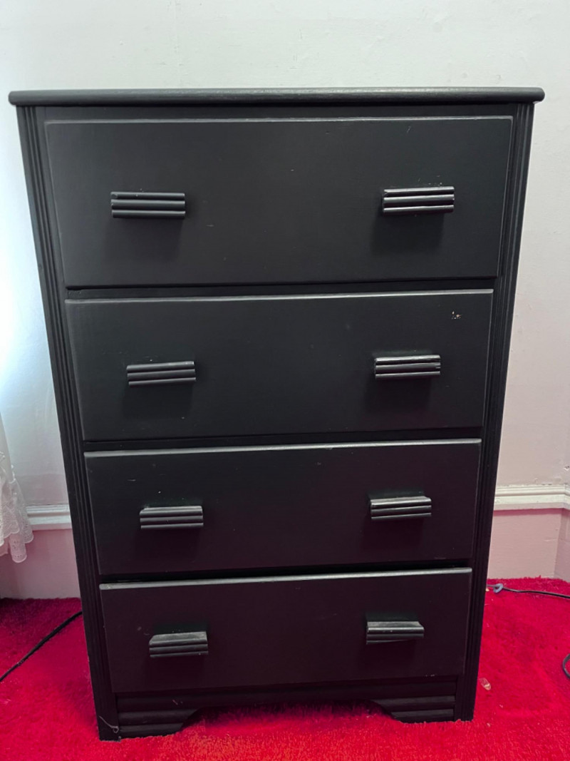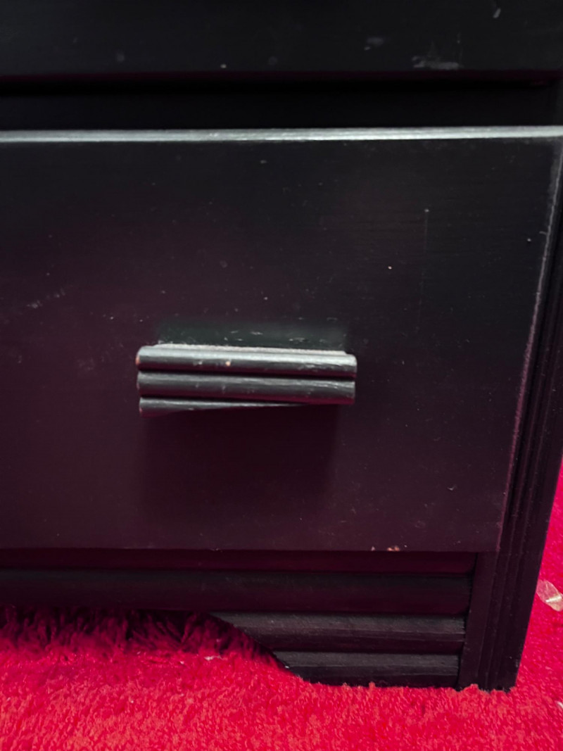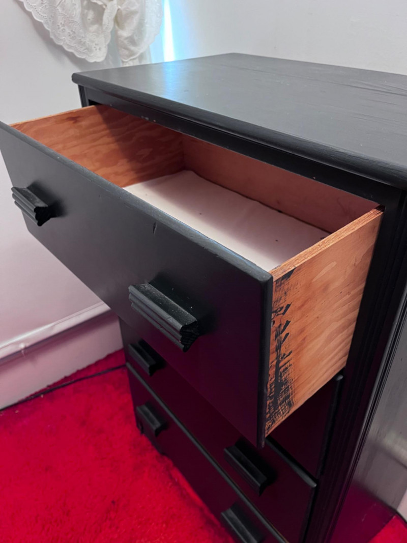 Compact 4-Drawer Dresser Black plywood dresser. Drawers have two wooden pulls. Bottom right is slightly broken. Delaminating on top of dresser. Some scratches and wear. 24”x14”x36”