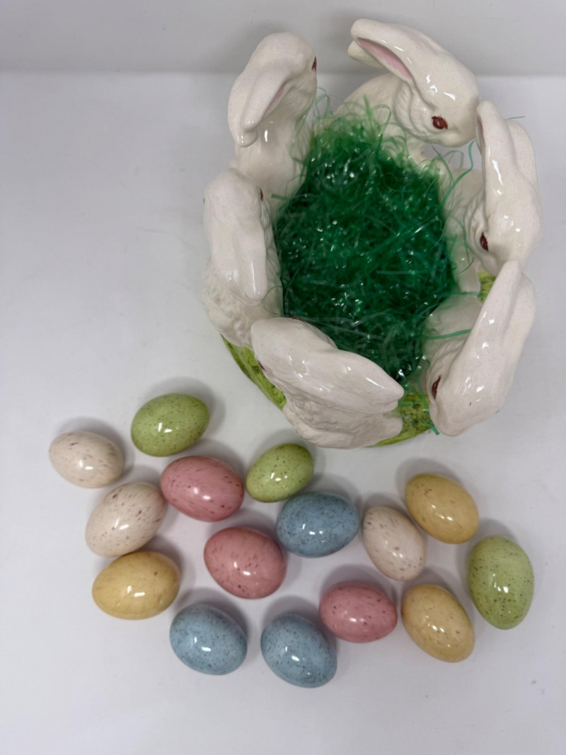 Ceramic Rabbit Ring filled with Ceramic Eggs 8”x9x5.5” Heavy Rabbit Ring with felted bottom and 15 hollow ceramic eggs.
