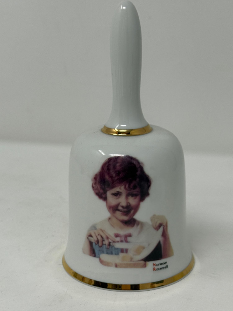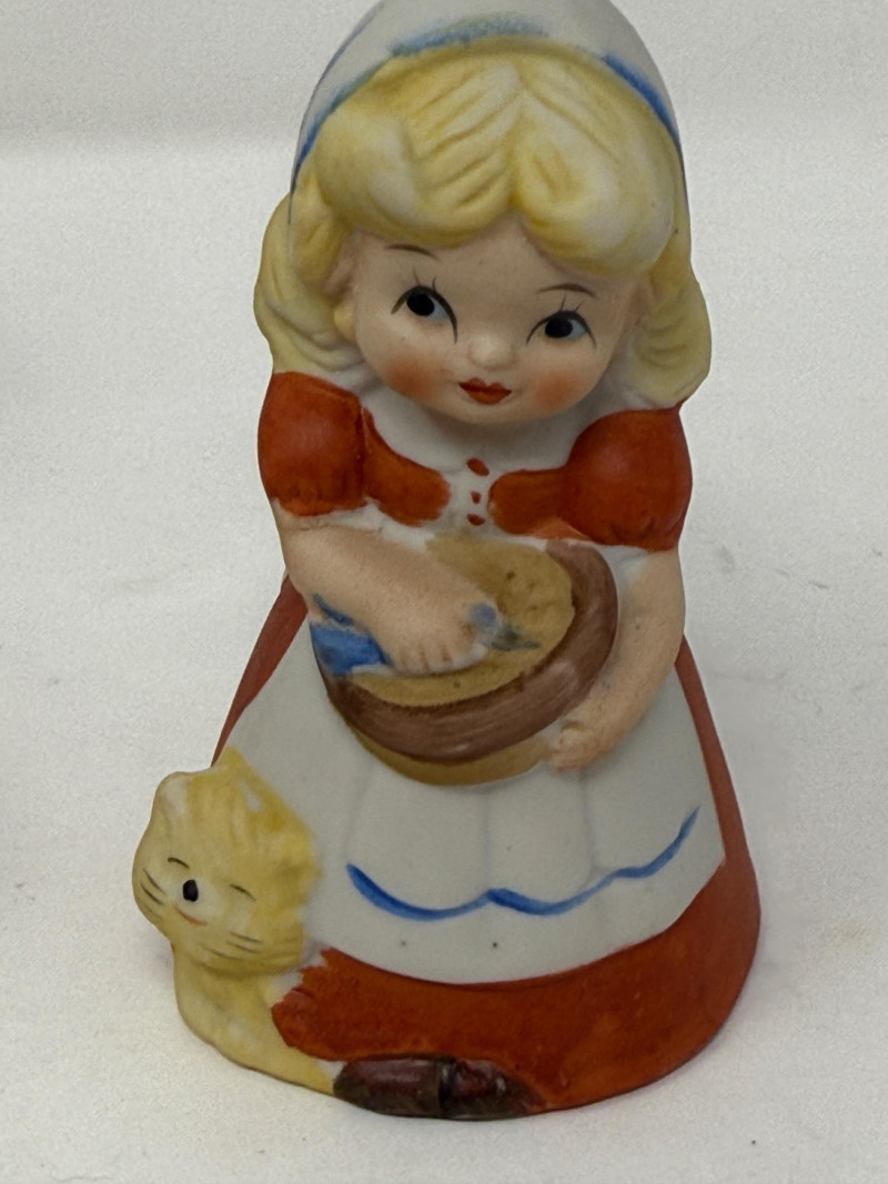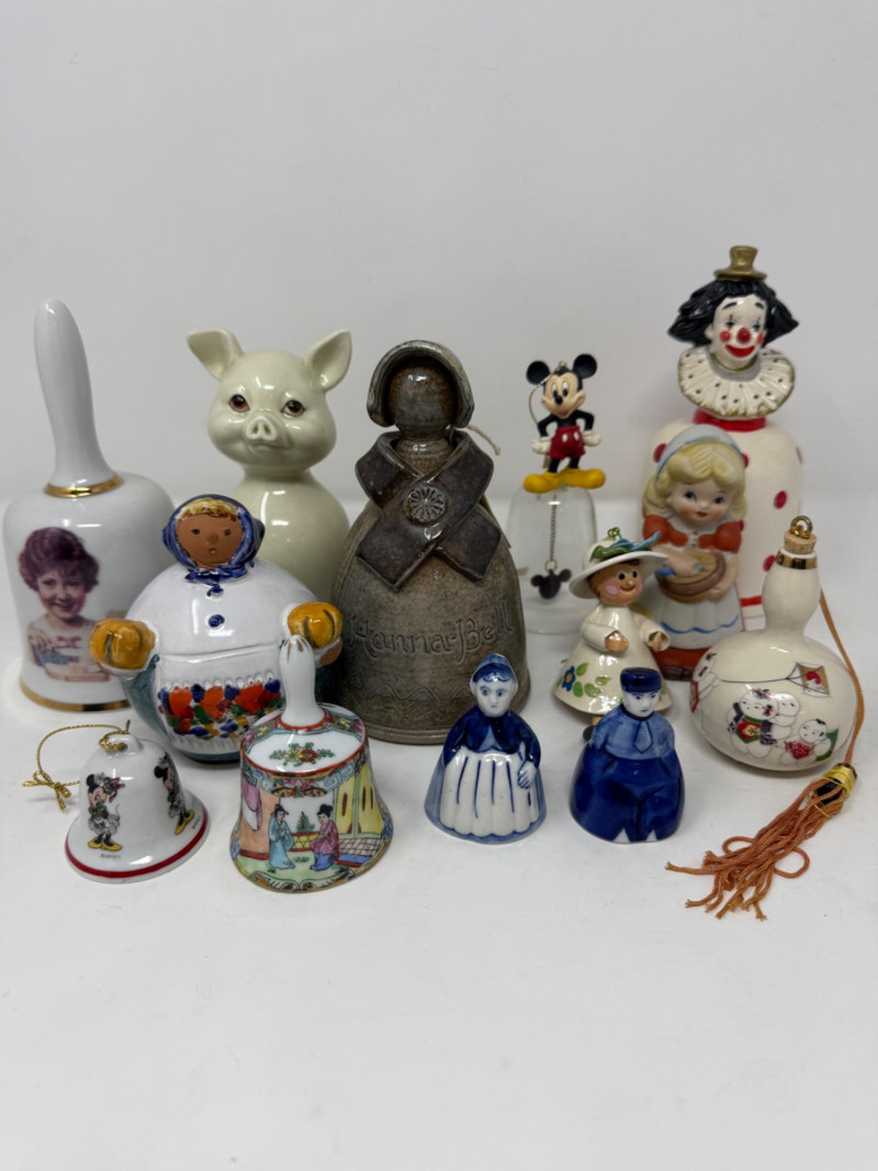 (13) Character bells from Norman Rockwell’s “Butter Girl” to Minnie Mouse, ceramic pig to polka dot clown.