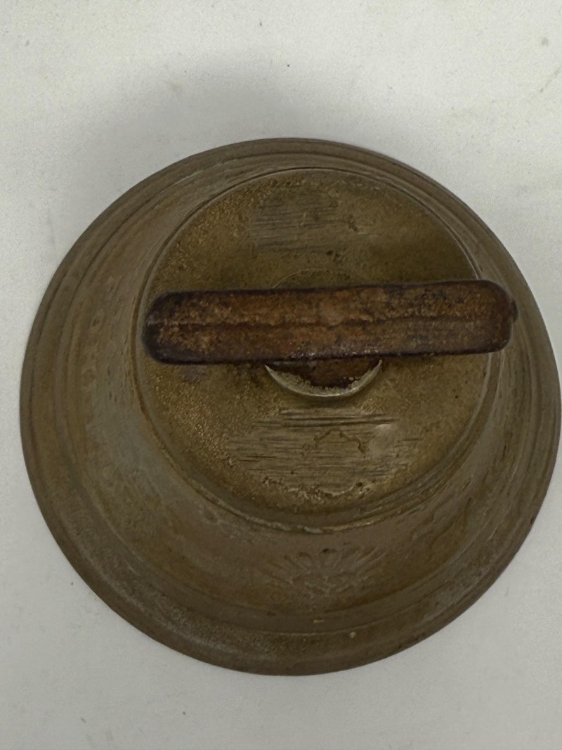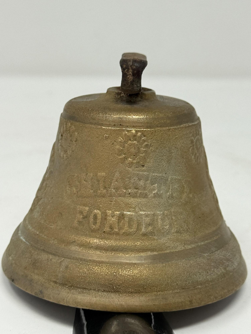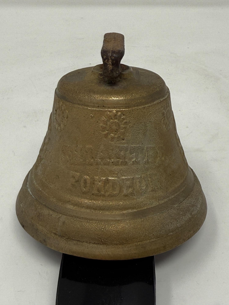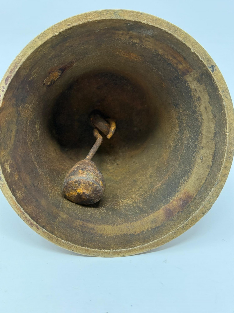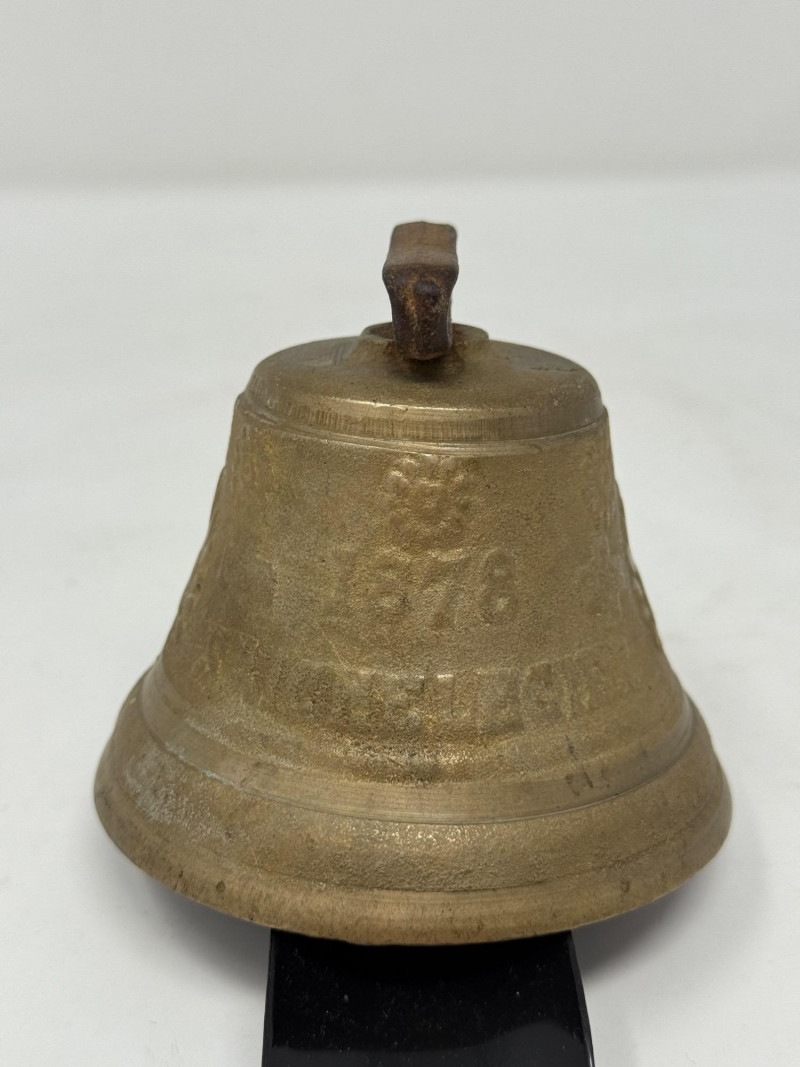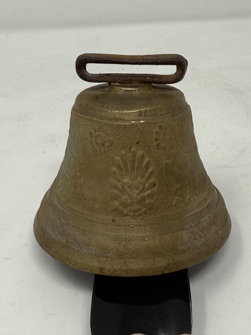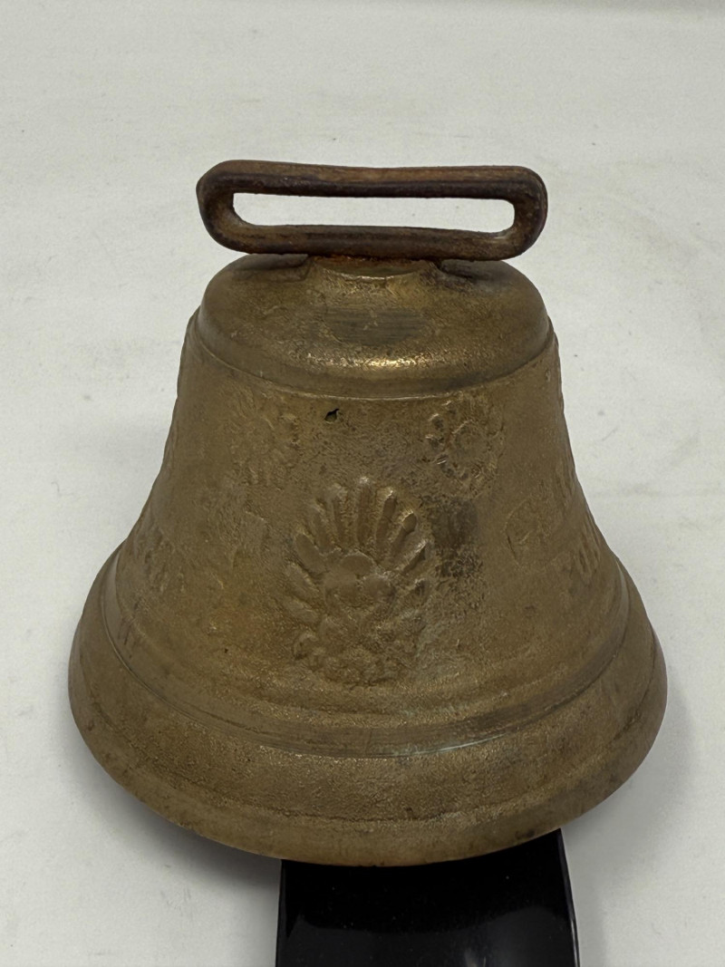 Bronze Chiantel Fondeur bell, often referred to as a Swiss cow or sleigh bell. It is marked with the name of the company, the town of Saignelegier, and the year 1878 4”x3.25” with loop for strap to attach to cows or sheep.