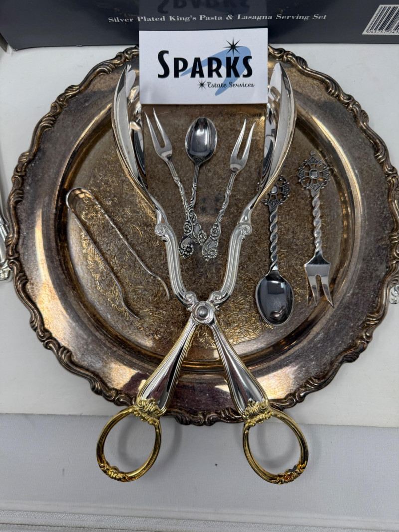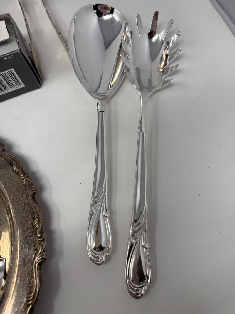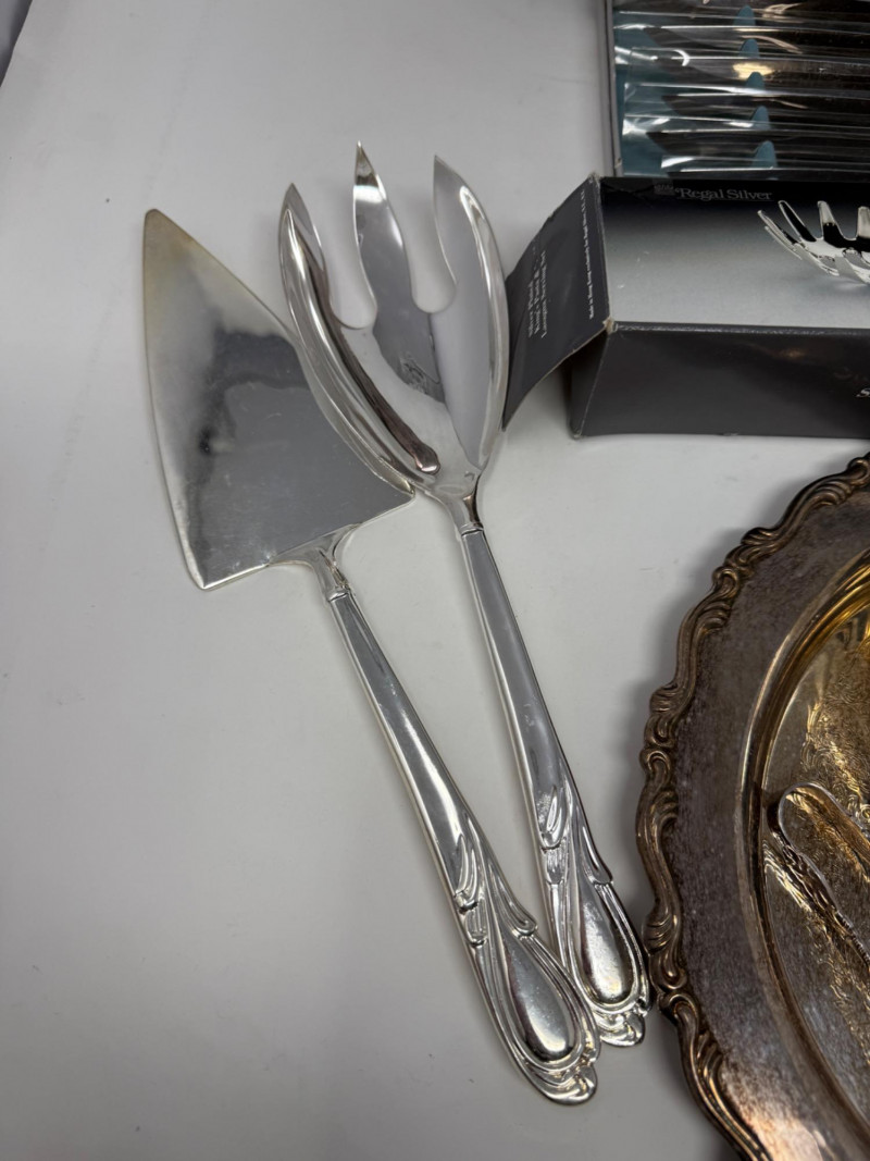 Silver Plate Serving Accessories & Platters International Silver pie server, spoon, pasta fork and slotted spoon. Silver and gold tone salad tongs Original Rogers by International Silver Co 6 piece knife set in original box.