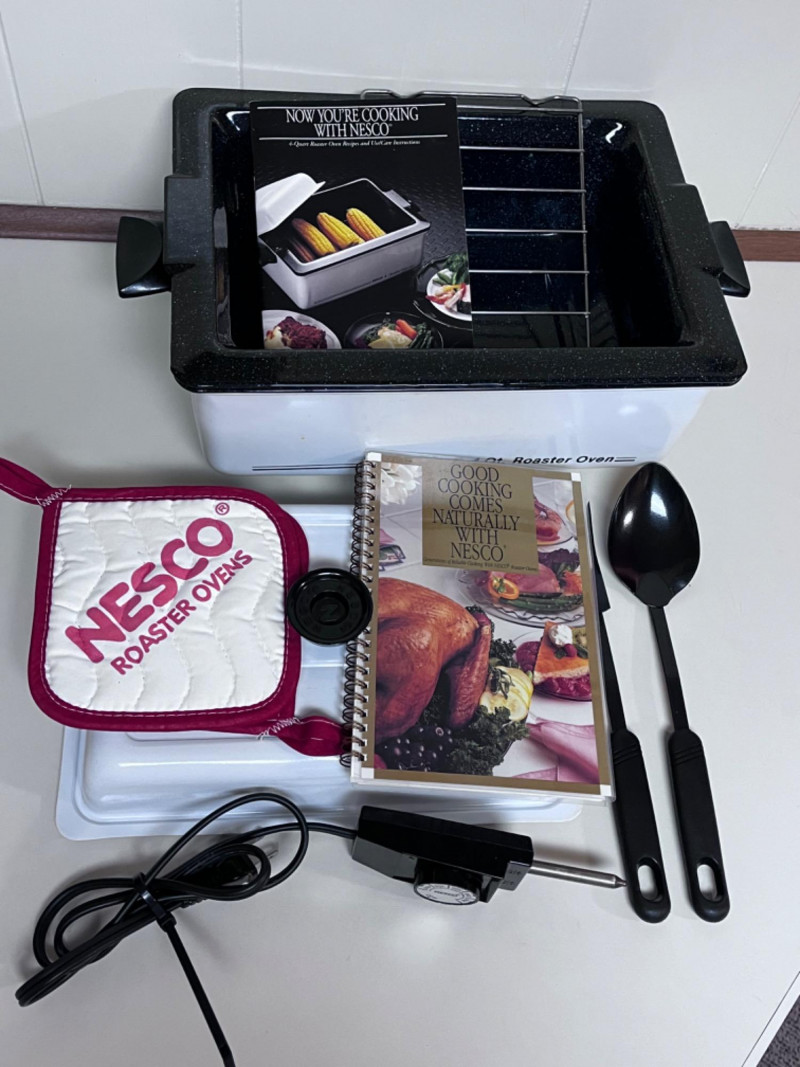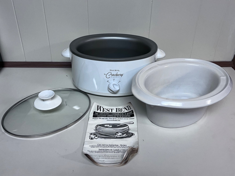 West Bend The Crockery Cooker—Stove Top Popper—Nesco Roaster Oven Turn dial for off, LO, & HI. Removable dish. Tested: Turns on. 16.5”x9.5”x6” Faberware electric open hearth broiler. White Nesco 4 QT. Toaster Oven Comes with: Metal rack Metal fork Roaster oven mitts Cook book Instruction manual Tested: Turns on.