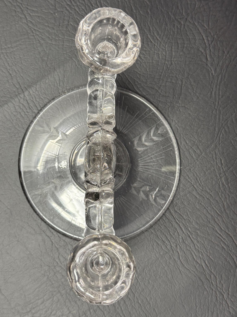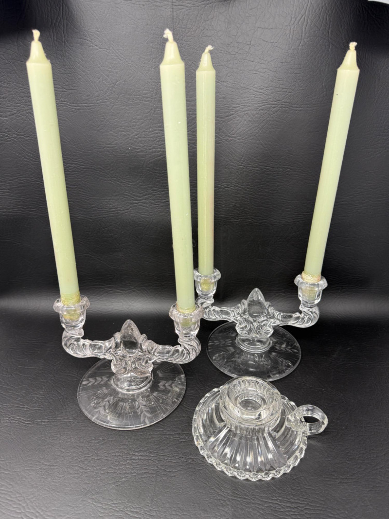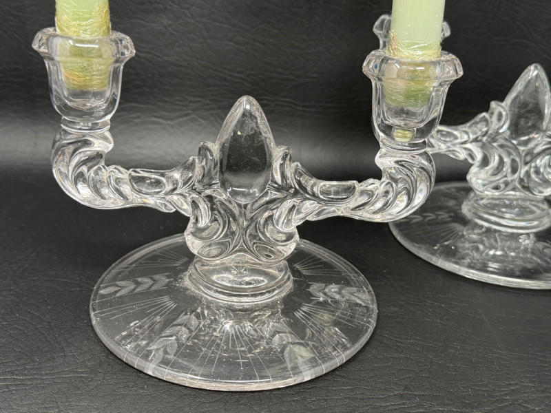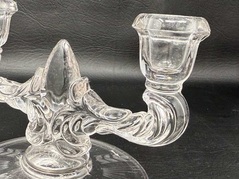 (2) Art Deco New Martinsville clear glass double-arm candlestick holder in the "Teardrop" pattern.
