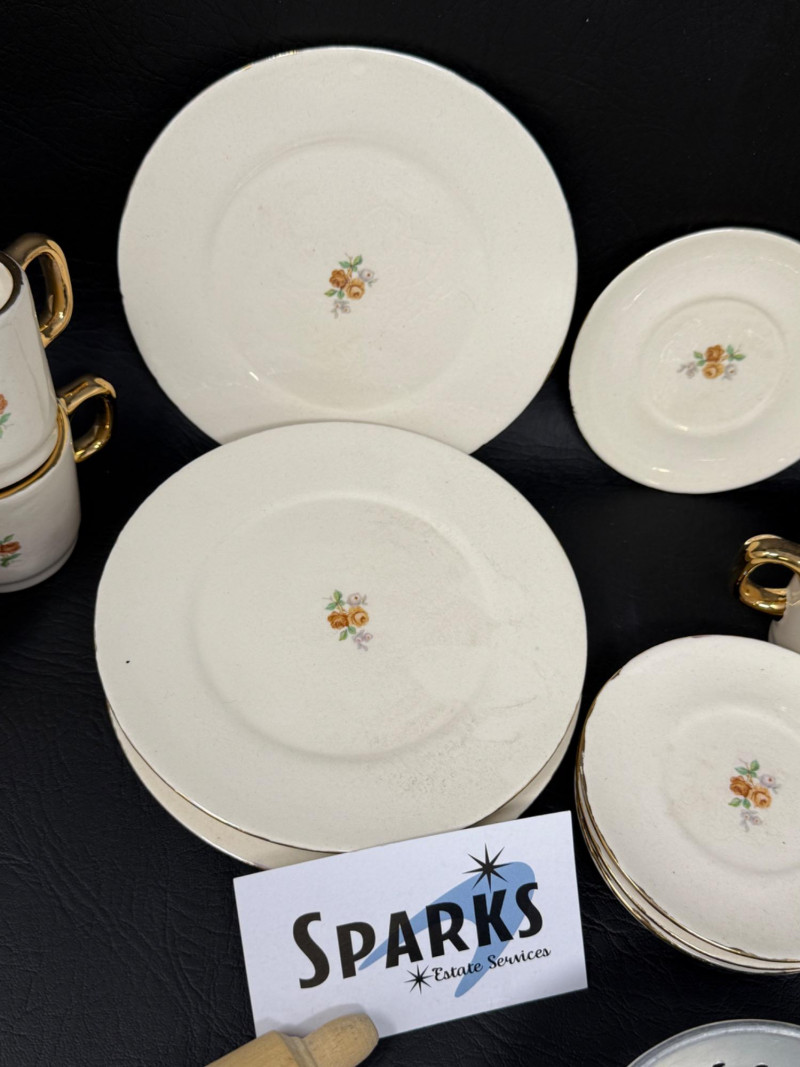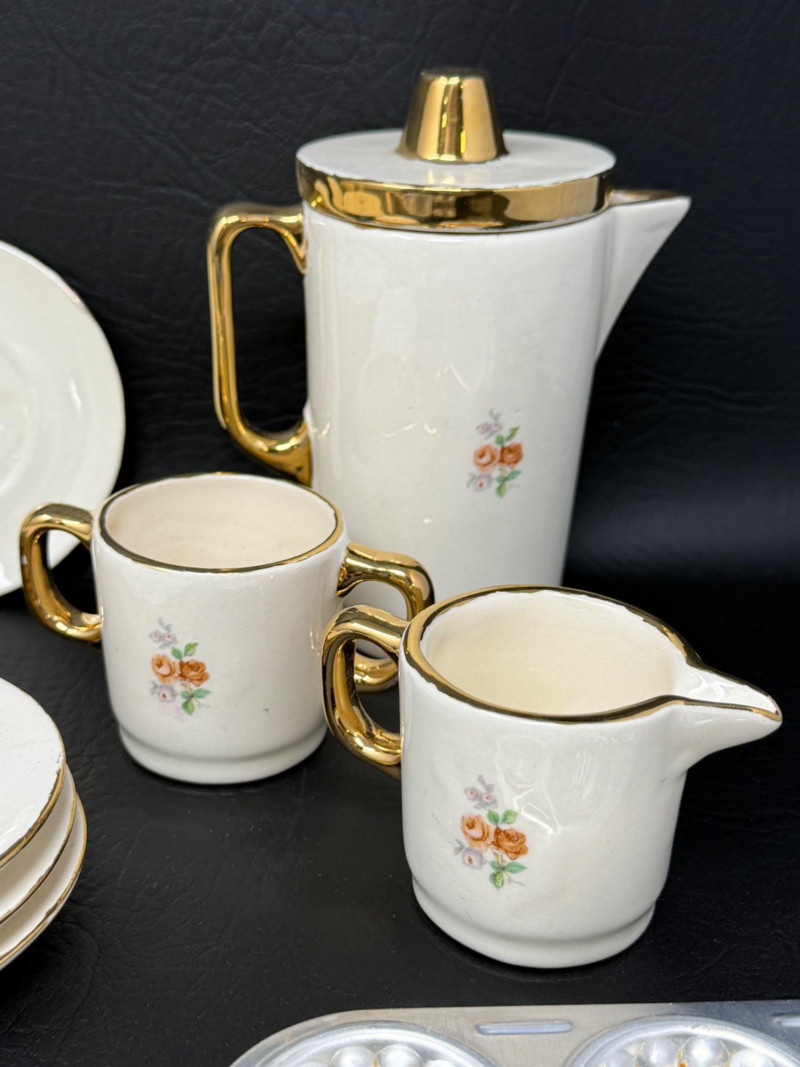 Children’s Toy Ceramic Tea Set & Baking Set 1970’s ceramic plates, cups and saucers, cream, sugar and coffee.