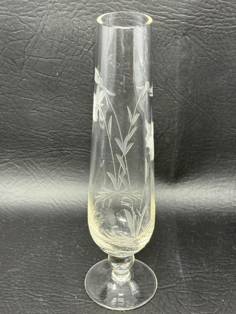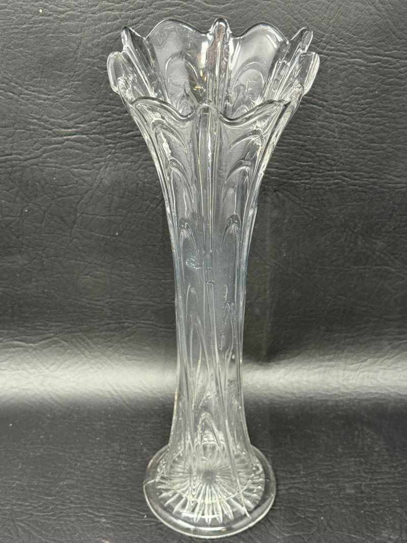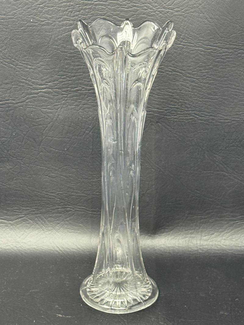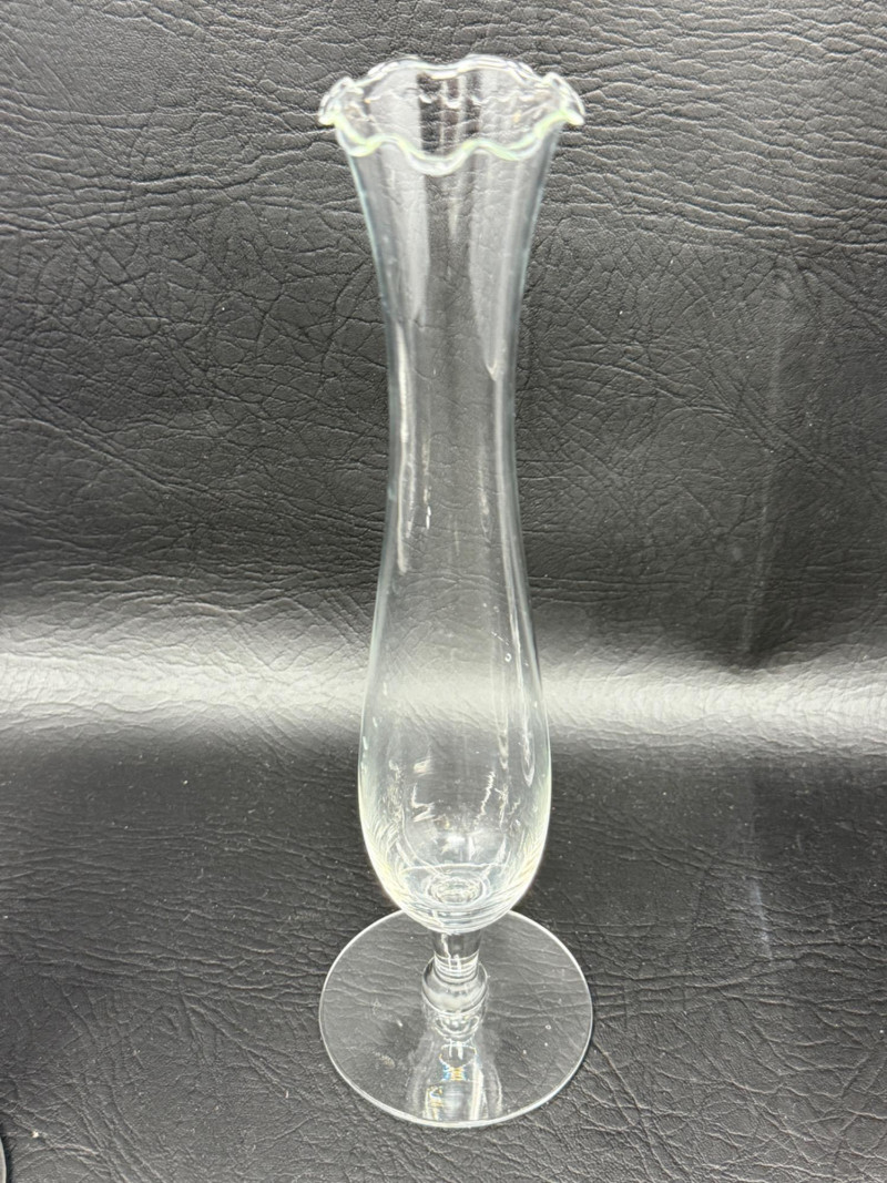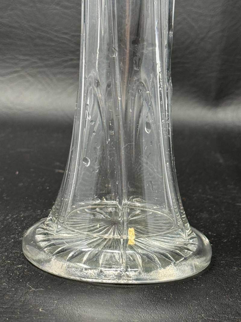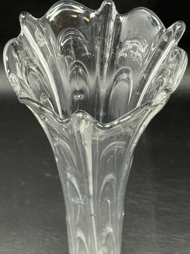 Hofbauer Byrdes collection 24% lead crystal bud vase Dugan Pulled Loop clear glass vase, circa 1912. Has an Art Deco abstract pattern and stands 12”x4” Delicate ruffle edge bud vase Etched glass bud vase is 8.25” tall.