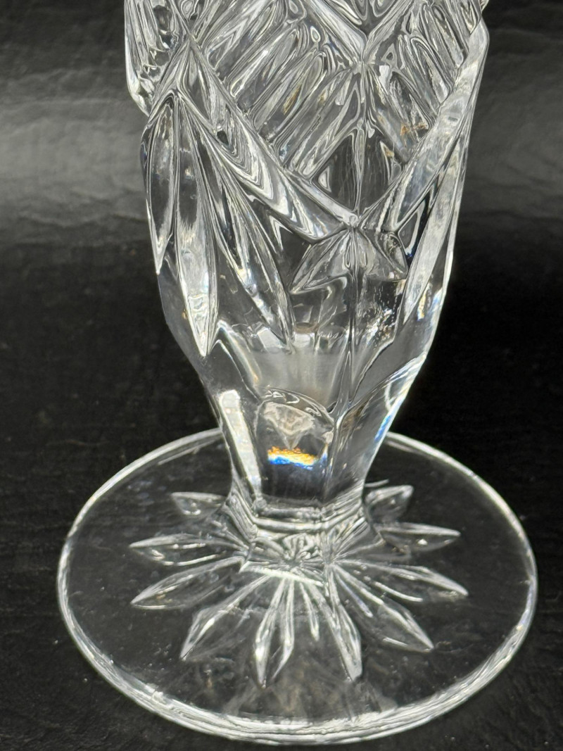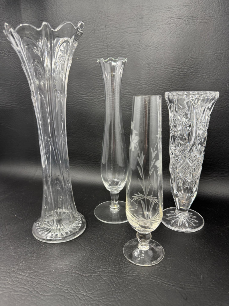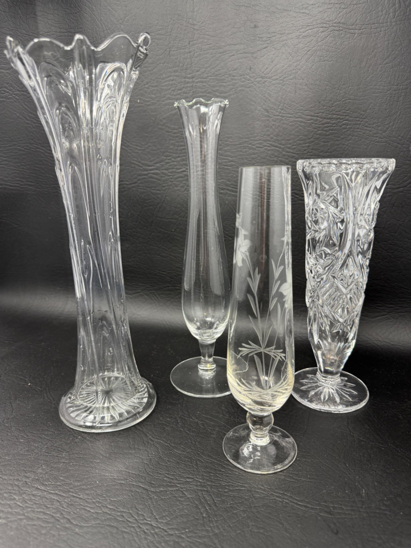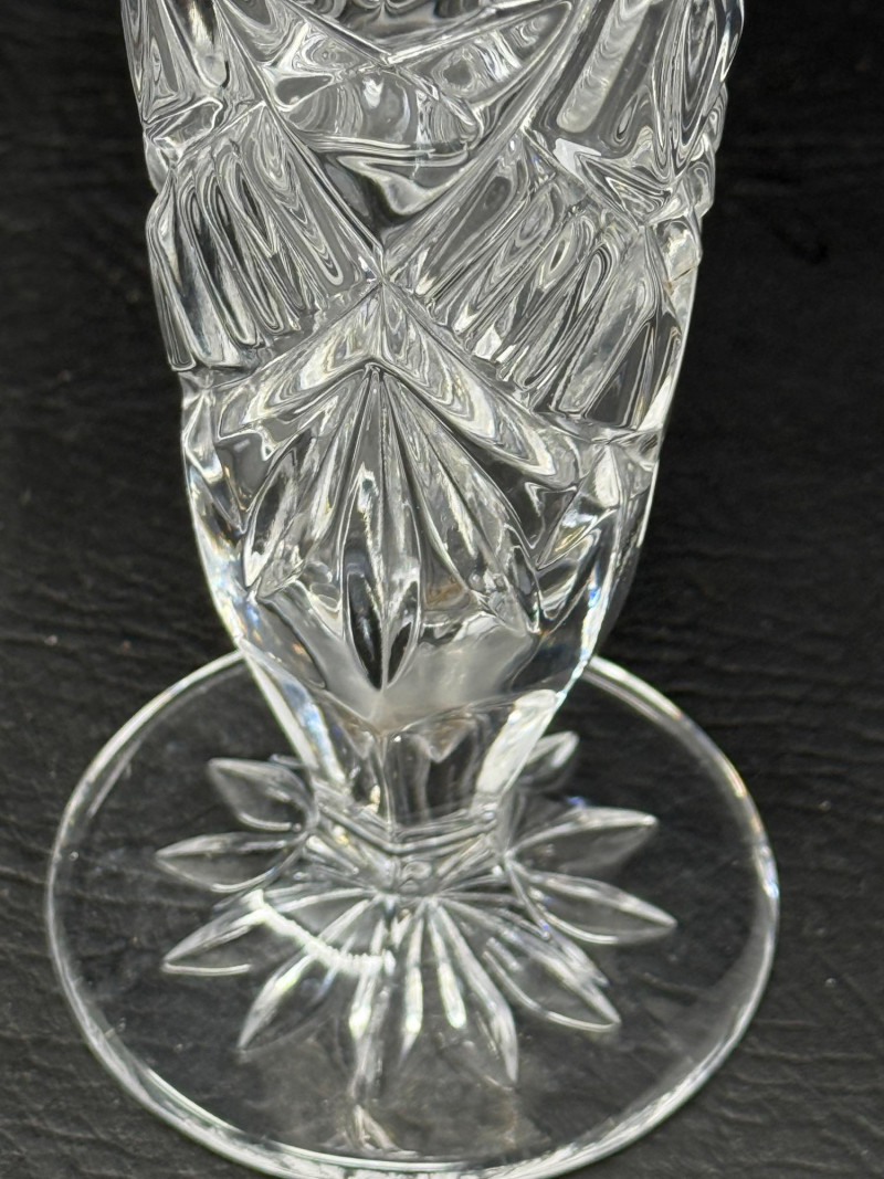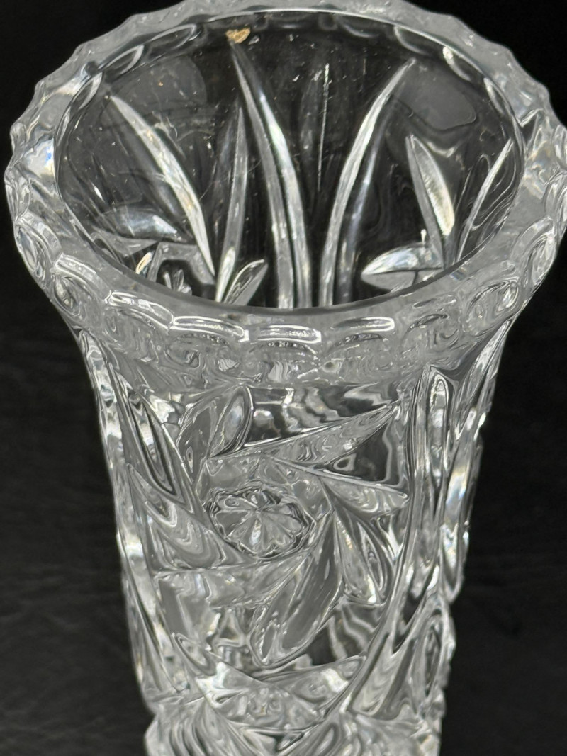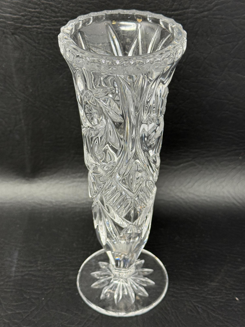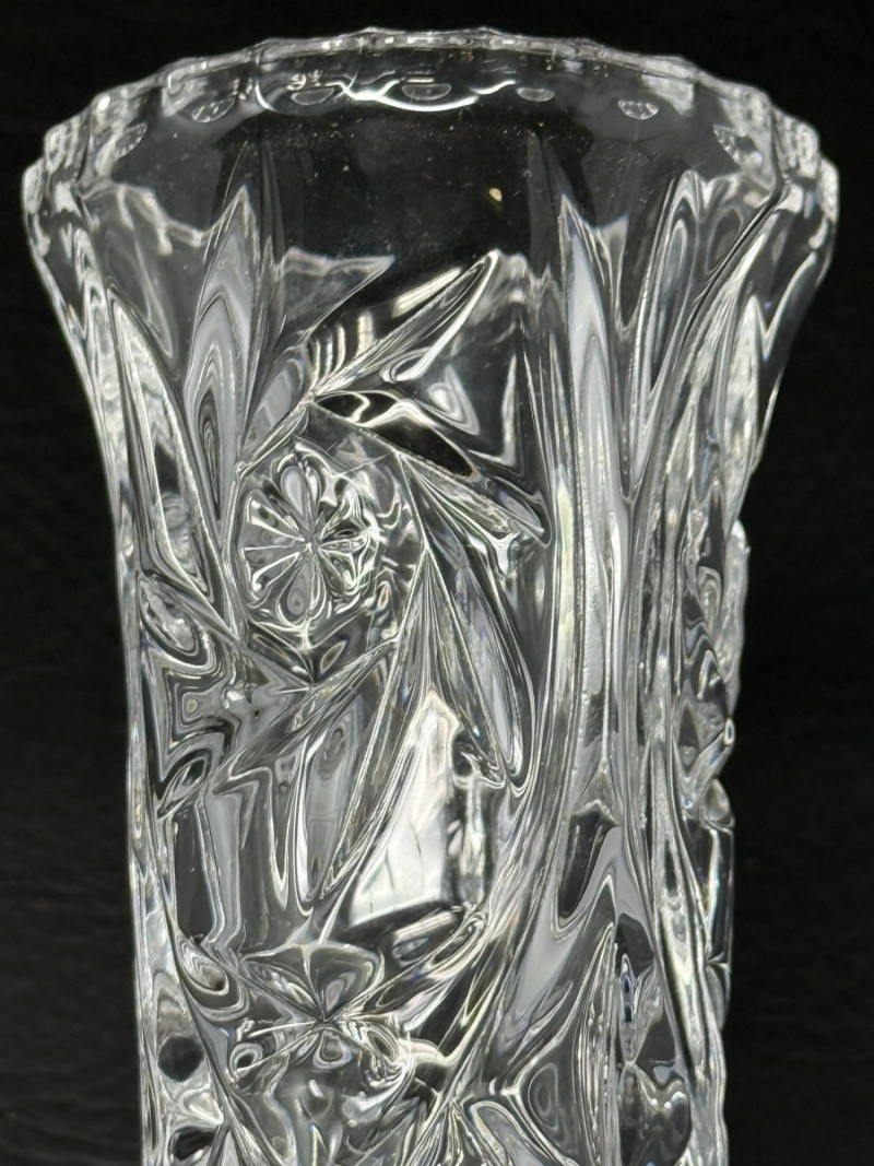 Hofbauer Byrdes collection 24% lead crystal bud vase Dugan Pulled Loop clear glass vase, circa 1912. Has an Art Deco abstract pattern and stands 12”x4” Delicate ruffle edge bud vase Etched glass bud vase is 8.25” tall.
