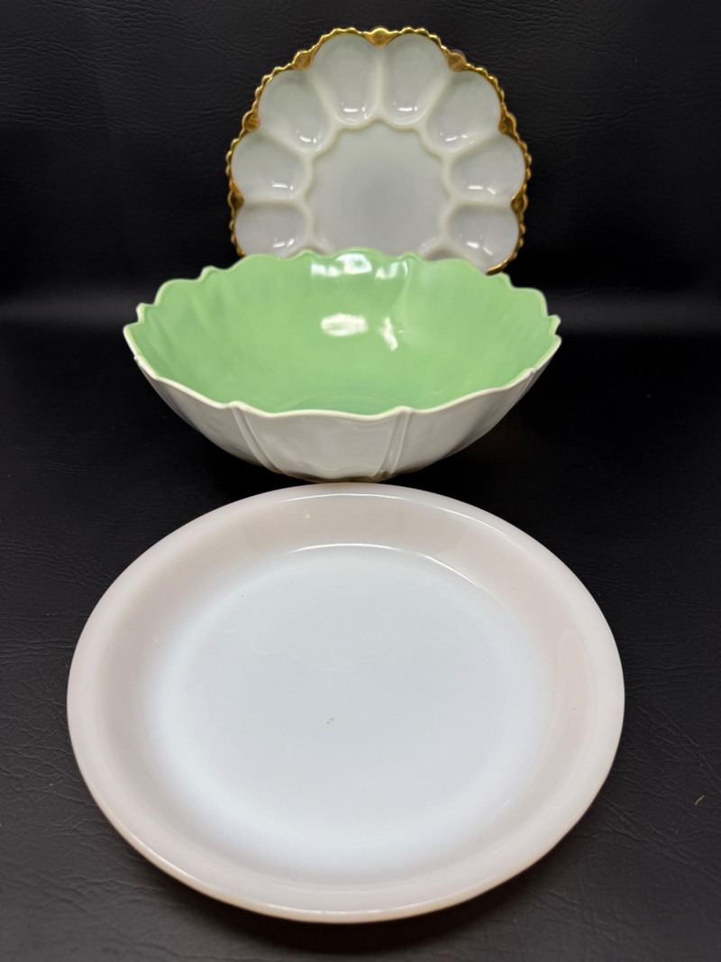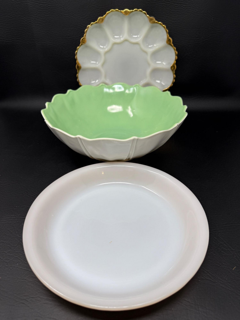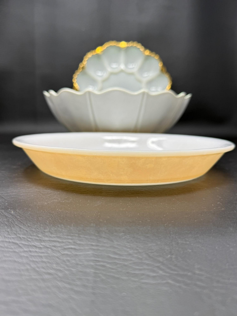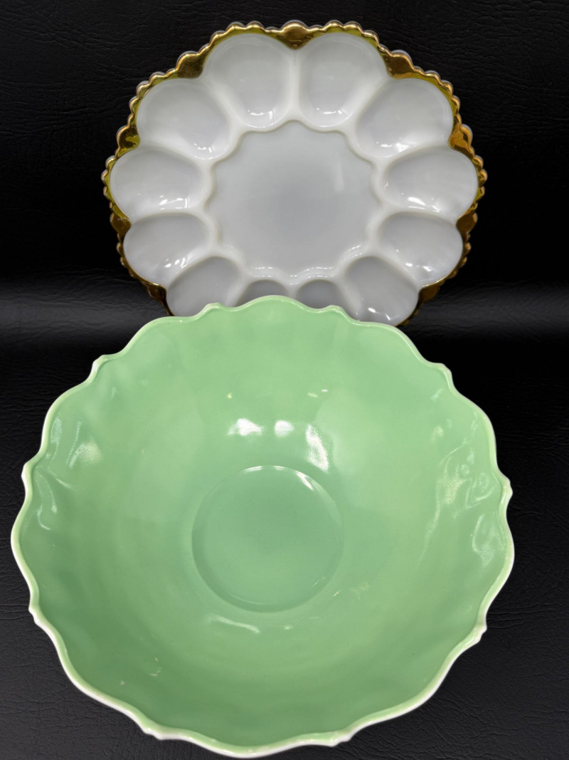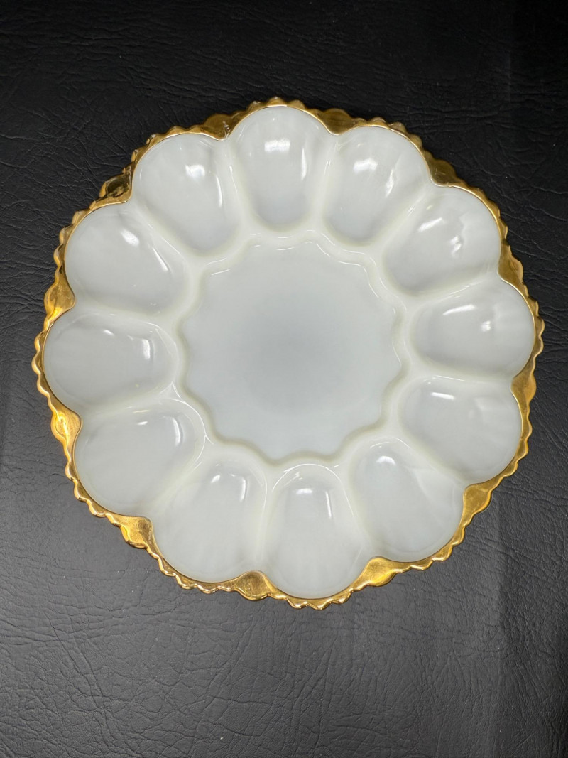 Anchor Hocking Fire-King milk glass deviled egg plate with a 22K gold trim.