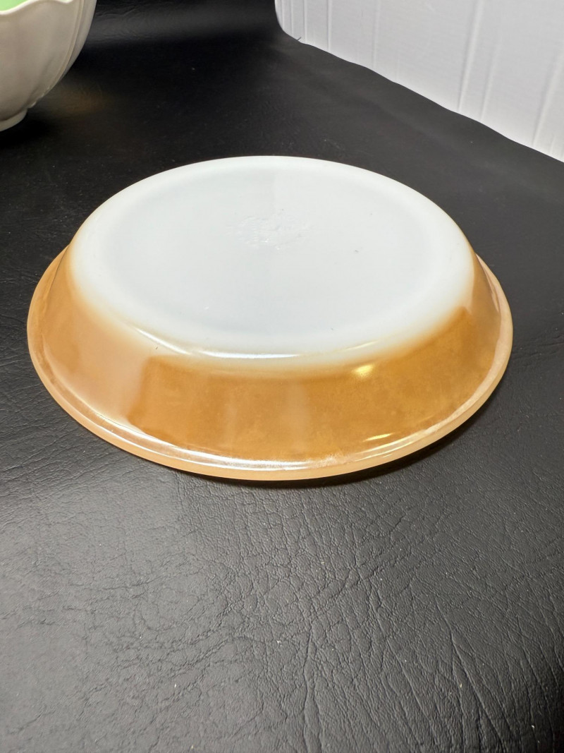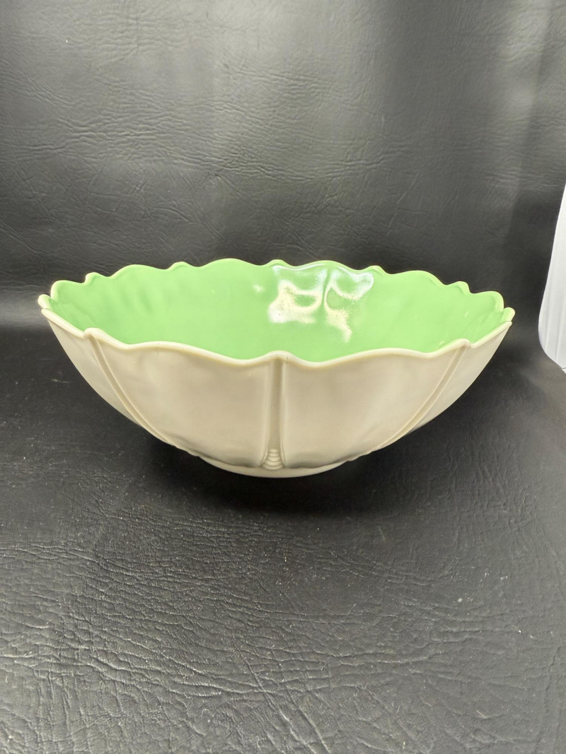 Anchor Hocking Oyster and Pearl serving bowl in white Vitrock with a fired-on "Springtime Green" interior. 10.75”x3.75”
