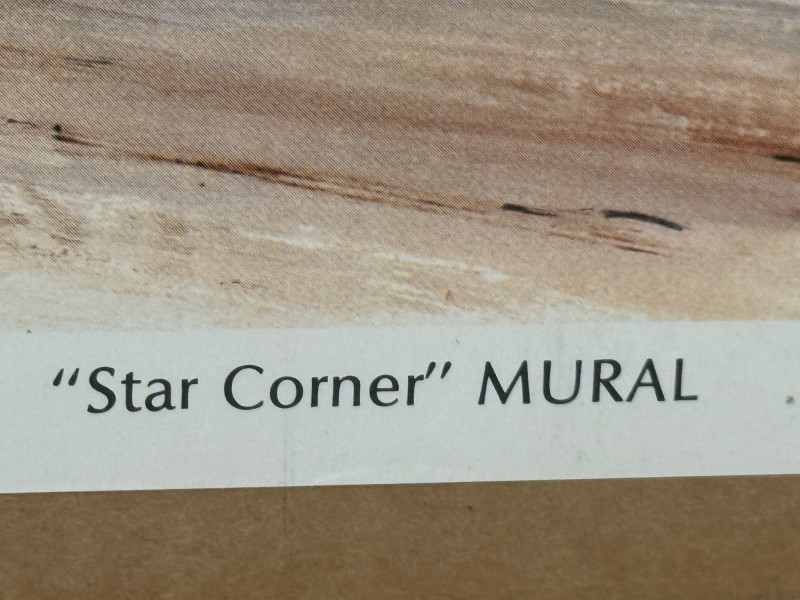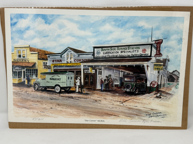 limited edition print of the "Star Corner" mural by artists Dick and Lynn Creevan. The print is an illustration of the South Side Service Station and a bakery in Aberdeen, Washington It is numbered 57/300, indicating it is the 57th print in a series of 300. The original mural was part of the 1989 Washington State Centennial Mural Project. The artists' signatures and the year 1987 are visible on the lower right.