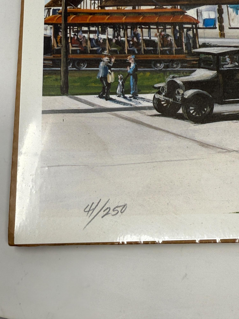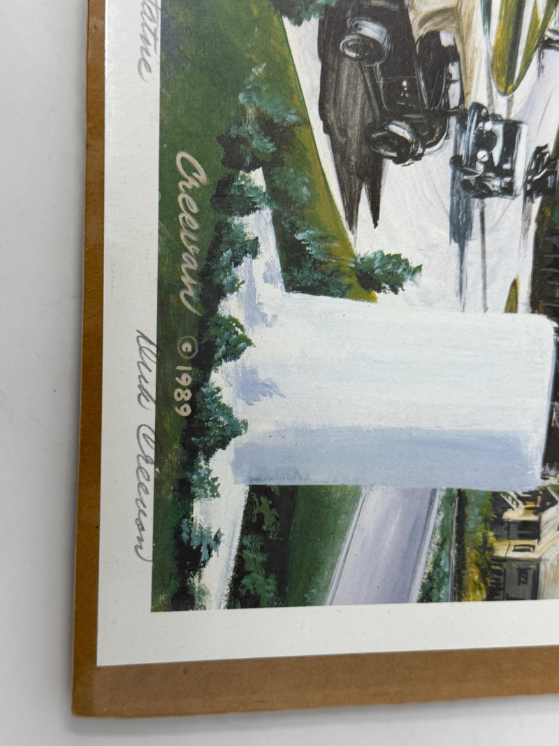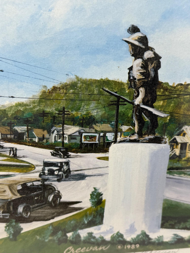 limited edition print by artist K. Creevan, created in 1989, depicting the intersection of Park and Simpson Avenue in Aberdeen, Washington, featuring the historic Ice Palace building and the "Spirit of the American Doughboy" statue. The print is titled "Ill Palace/Doughboy Statue" and is numbered 4/250, indicating it is an original, limited-run piece of collectible art. The "Spirit of the American Doughboy" statue is a famous mass-produced memorial by E.M. Viquesney, honoring World War I veterans, with over 135 copies in various U.S. locations. The Aberdeen statue was erected on July 4, 1926, near the original Ice Palace location shown in the artwork. The artwork captures a historical scene