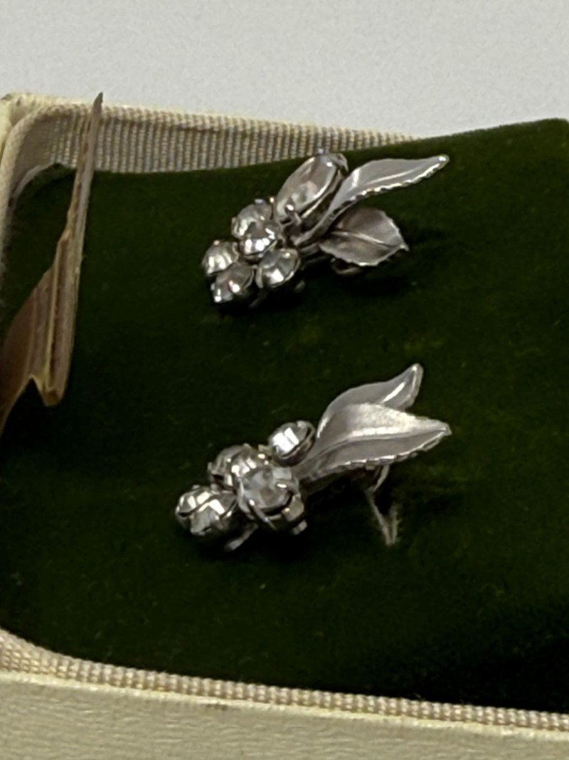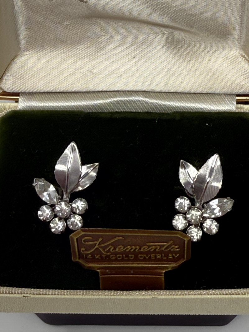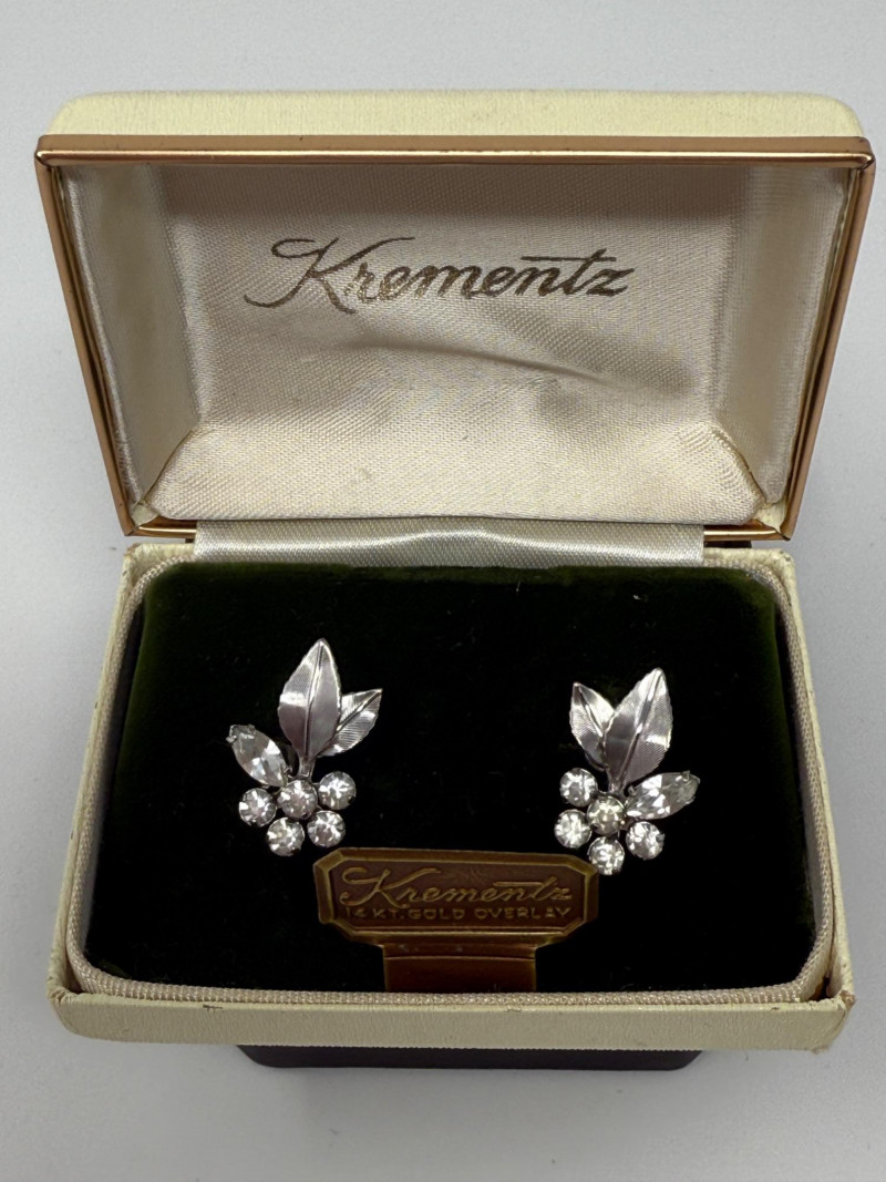 These are a pair of vintage Krementz 14kt white gold overlay screw-back earrings featuring a clear rhinestone and leaf design. 14kt white gold overlay with crystal rhinestones. A floral motif with textured leaves and clear, sparkling stones. Screw-back earrings 1966 Krementz 14K White Gold Overlay Screw Back Earrings in original box.