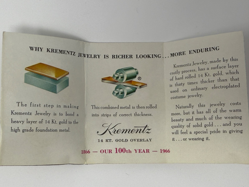 Krementz was a well-known American jewelry manufacturer founded in 1866, famous for its high-quality gold overlay process that was significantly thicker than typical costume jewelry gilding.