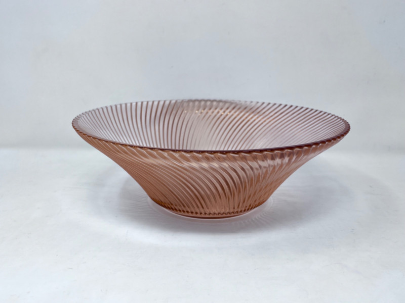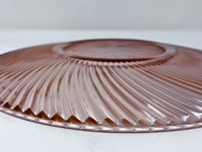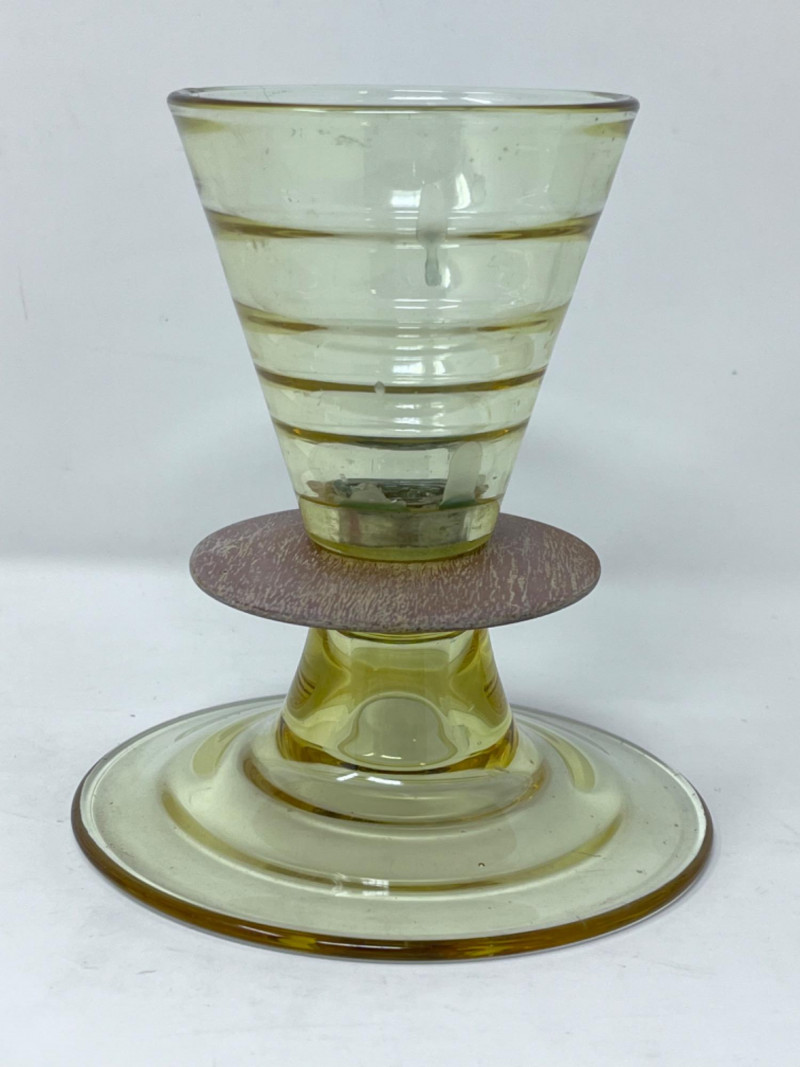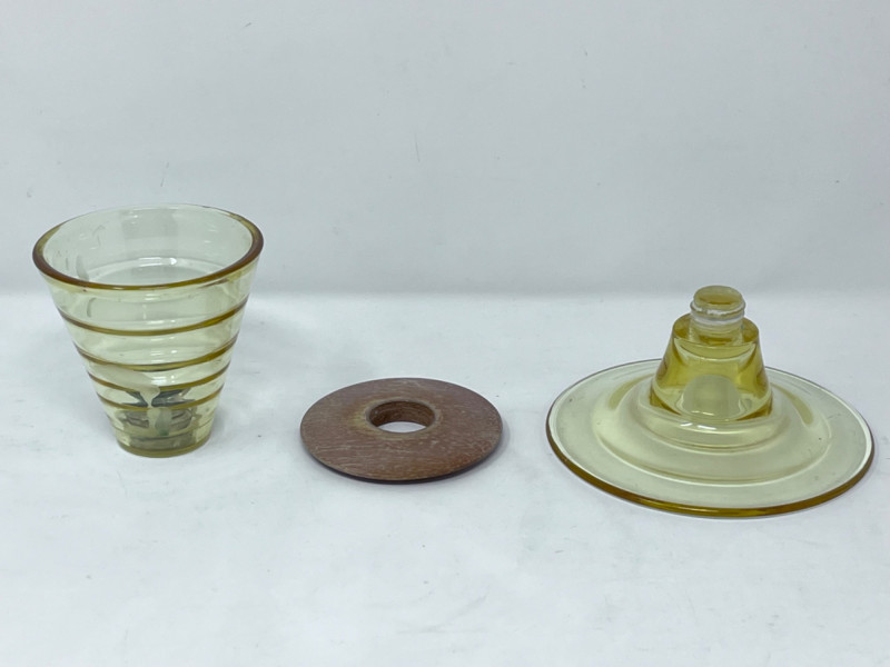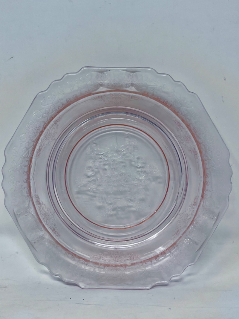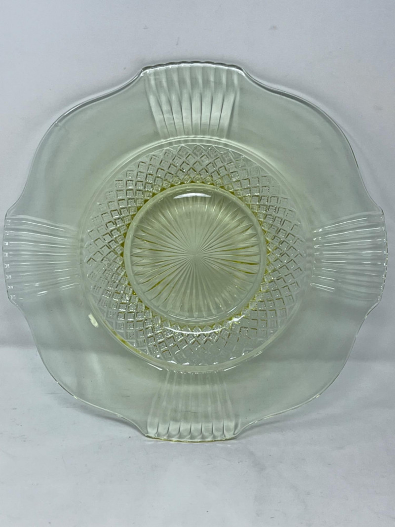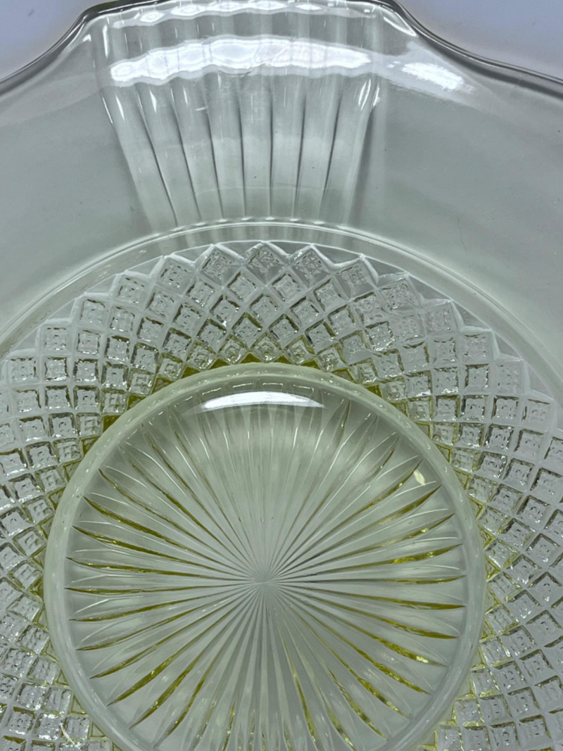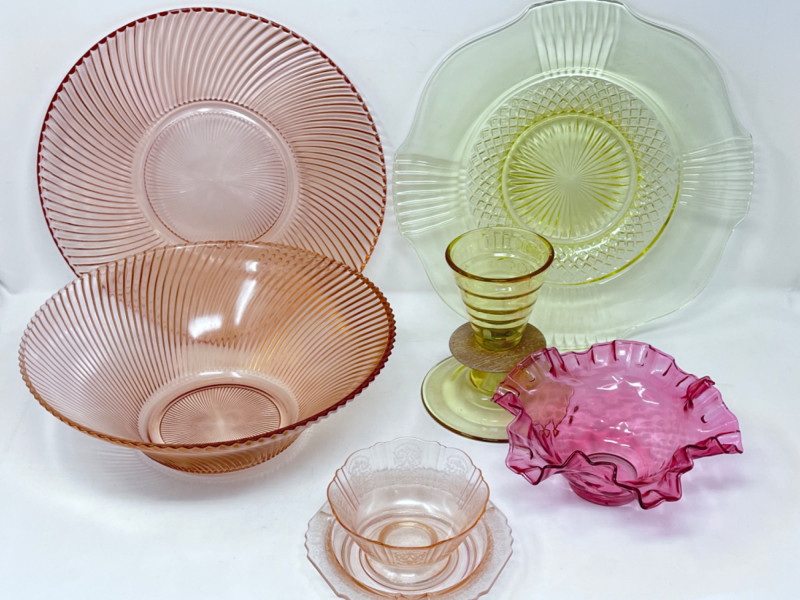 Depression Glass— Federal Glass—Fenton— & More! 6”x7”x3.5” Pink Federal Glass Company bowl and plate with the “Diana” pattern. Plate is 11.5”. Topaz Lancaster Colony Corp. depression glass plate with the pattern “Meg”. Hazel Atlas depression glass plate and bowl in the “Florentine Poppy” pattern. Bowl is 4.25”x2.25”. Yellow glass candle stick holder with wood between pieces. Ripple pattern on inside of glass. 5”x5.5”