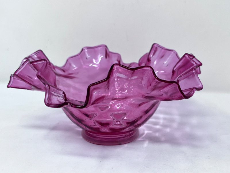 Fenton cranberry glass with ruffled edges and diamond patterns around bowl.
