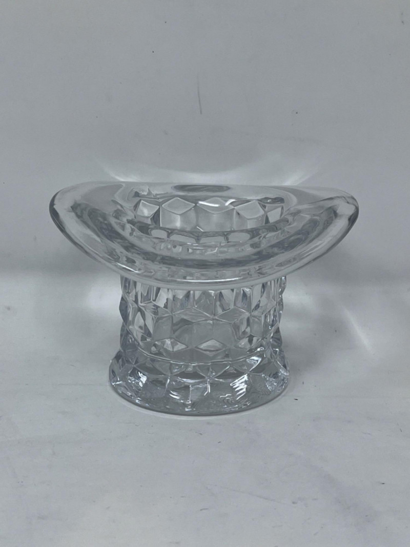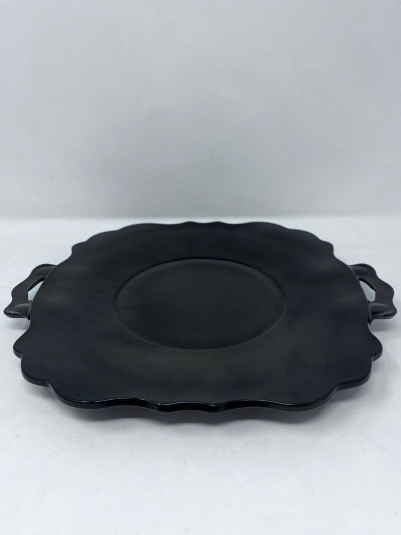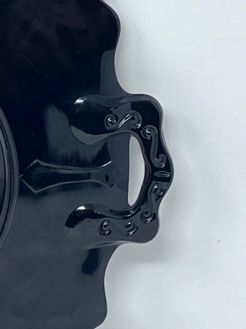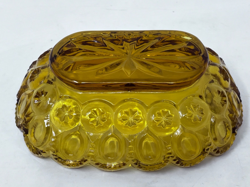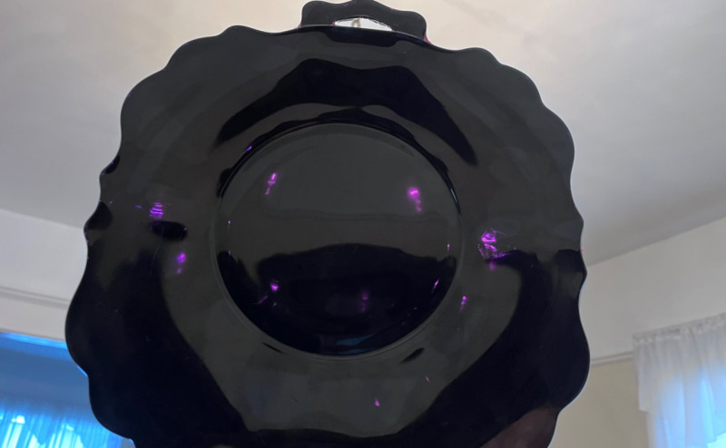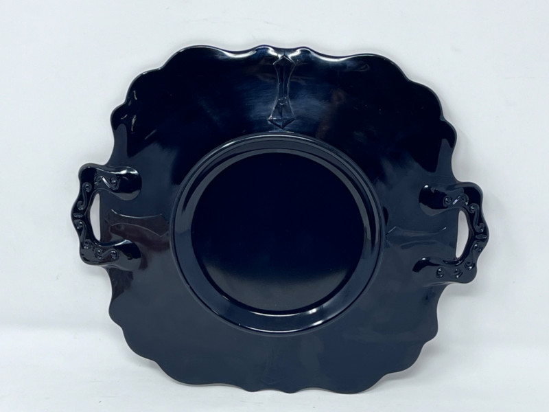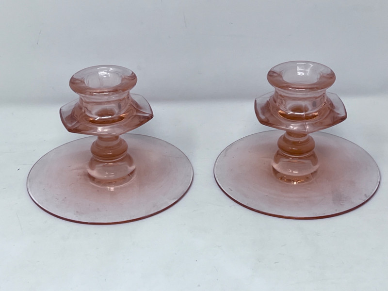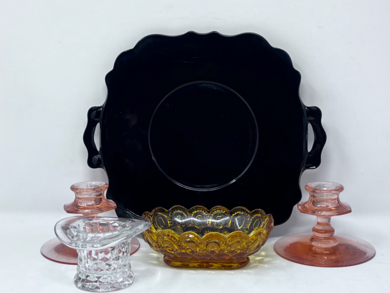 L.E. Smith Glass Company lack amethyst glass handled serving platter with scalloped edge. 12”x10” L.E. Smith Glass Company amber glass “Moon and Stars” relish dish with scalloped edges. 6”x4” Pair of pink glass Fostoria Fairfax candle holders. 4.5”x3” Clear glass Fostoria Top Hat with diamond motifs. 4”x4”x2.5”