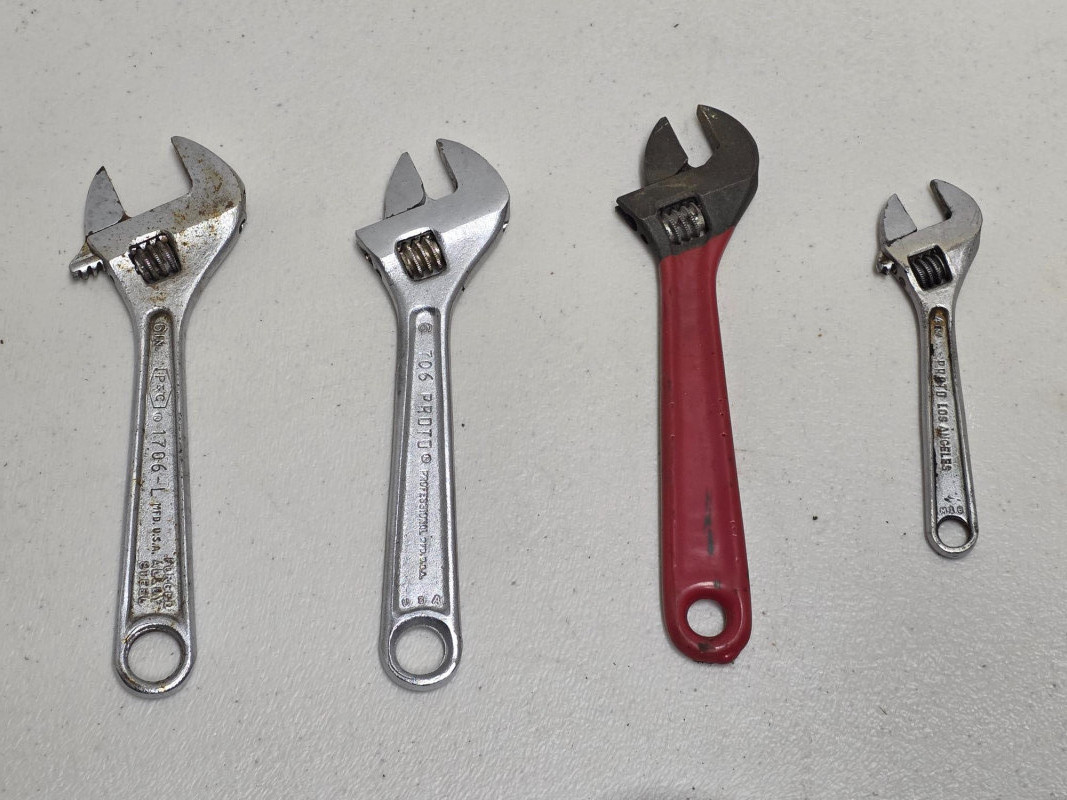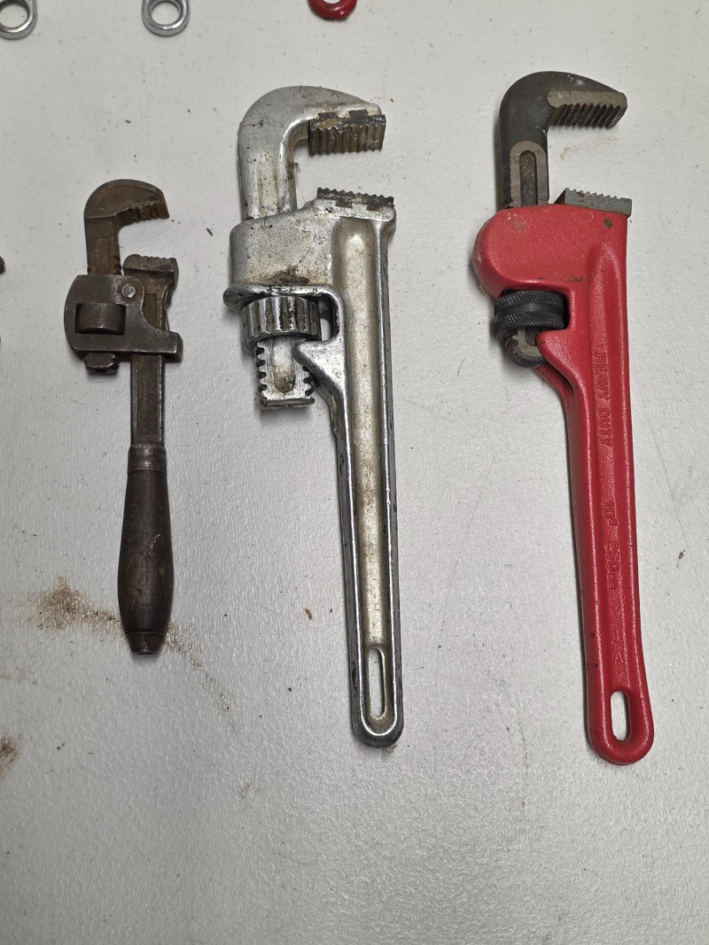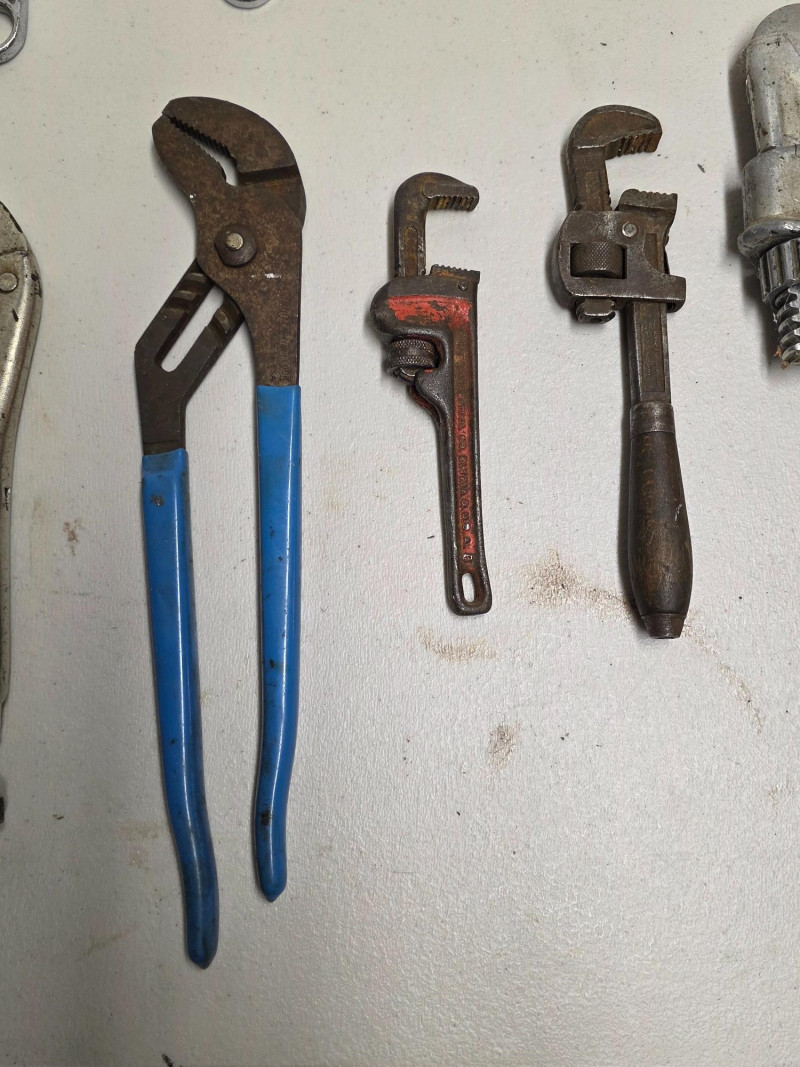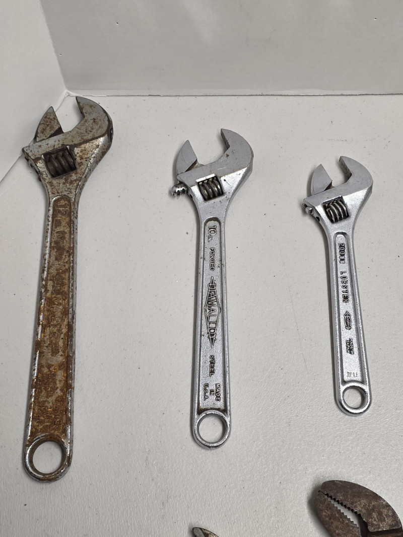 (14) Wrenches: Adjustable, Pipe, Vice Grips & Channellocks (6) Adjustable wrenches from Diamalloy, Proto, Lobster, P&C. 12" - 4" (4) Pipe wrenches from ACE, Shick & Ridgid. 11" - 6" (2) Vice Grips 9" - 6" (1) Channellocks 12" 13 tools in all!