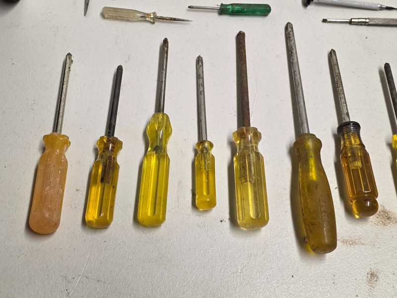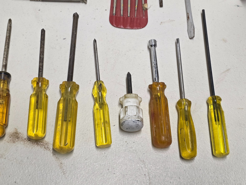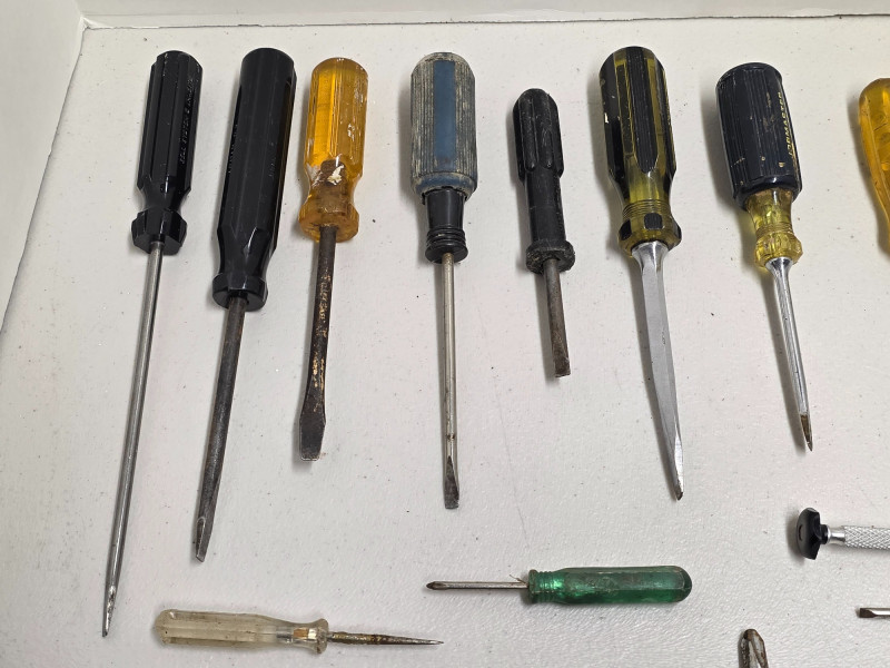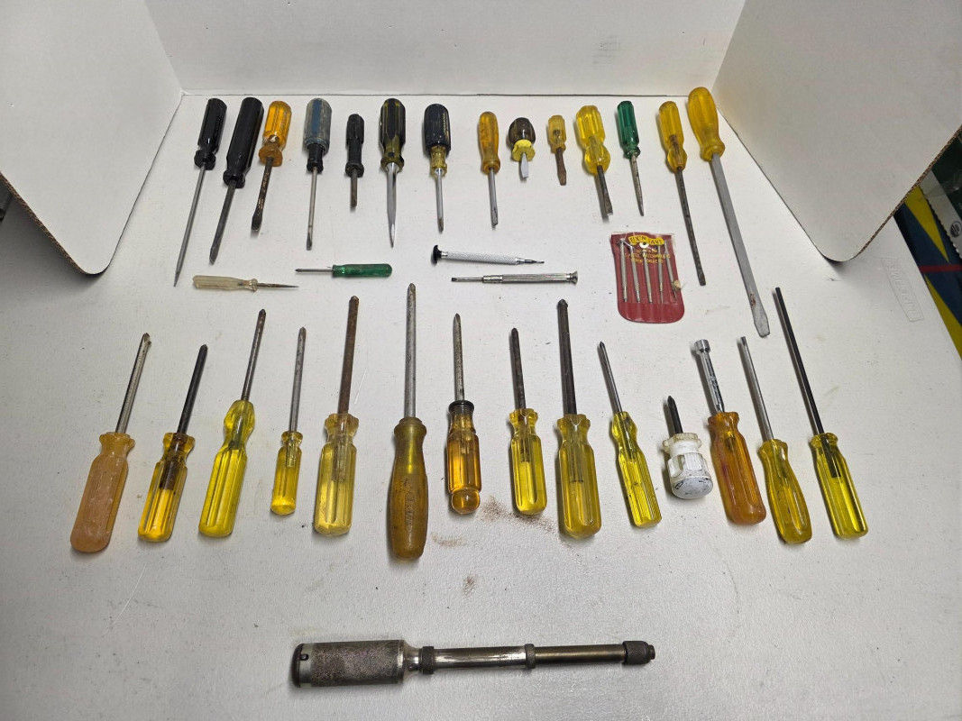 (38) Scredrivers: Phillips, Slotted, Micro & More (14) Slotted screwdrivers from Proto, Jibmaster, Stanley & more. 3" - 13" (11) Phillips screwdrivers from Irwin, Proto, VACO, Craftsman & more. 3.5" - 10.5" (9) Micro screwdrivers (3) Miscellaneous drivers (1) Yankee-style push drill - 9.5" 38 tools in all!