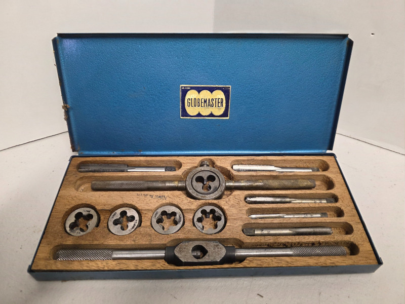 (3) Vintage Tap & Die Sets (2) Globemaster 12 Piece Tap & Die Sets - Used for cutting new screw threads (tapping) and repairing damaged threads on existing screws or bolts (dieing) (1) Globemaster 6 Piece Tap & Tap Handle set - vintage set used for cutting internal threads in holes. 3 kits in original metal boxes & pouch!