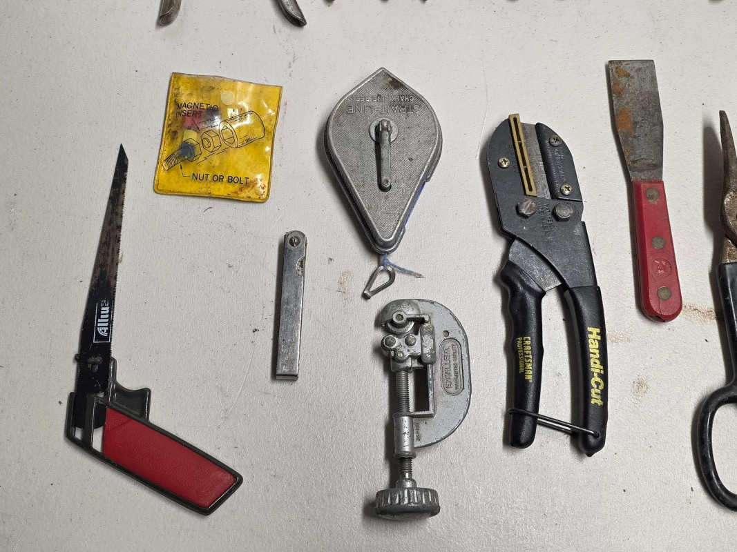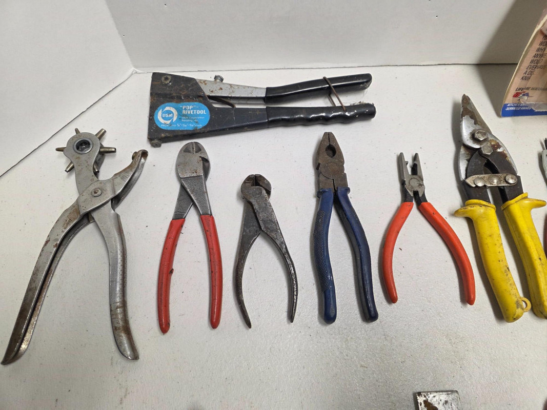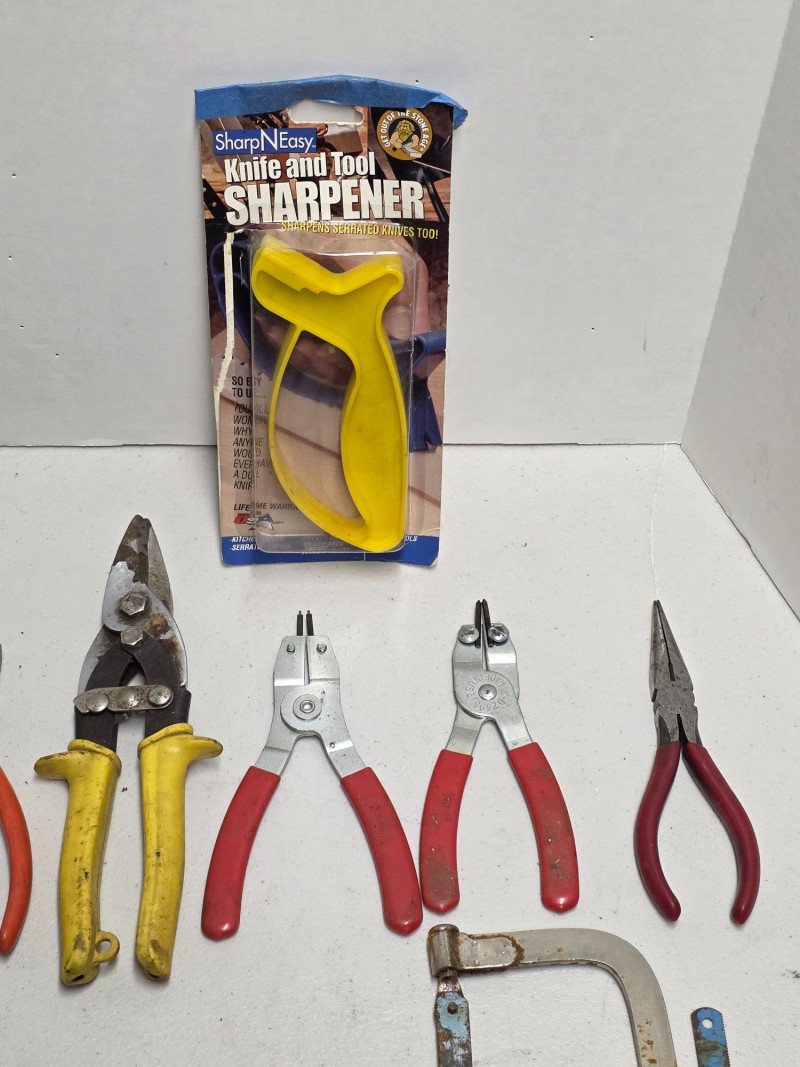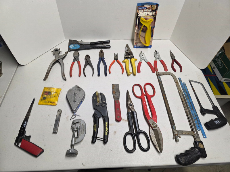 (20) Miscellaneous Tool Lot! Leather punch, side-cutters, snips (2), pliers, snap-ring pliers, hack saws (2), chalking, tubing cutter, utility cutter and more! 20 tools in all!