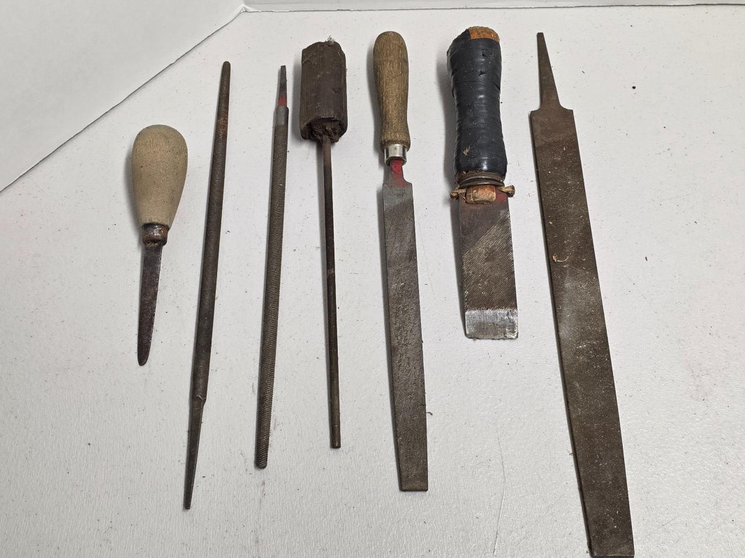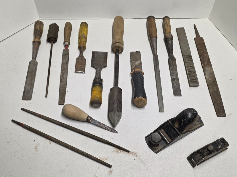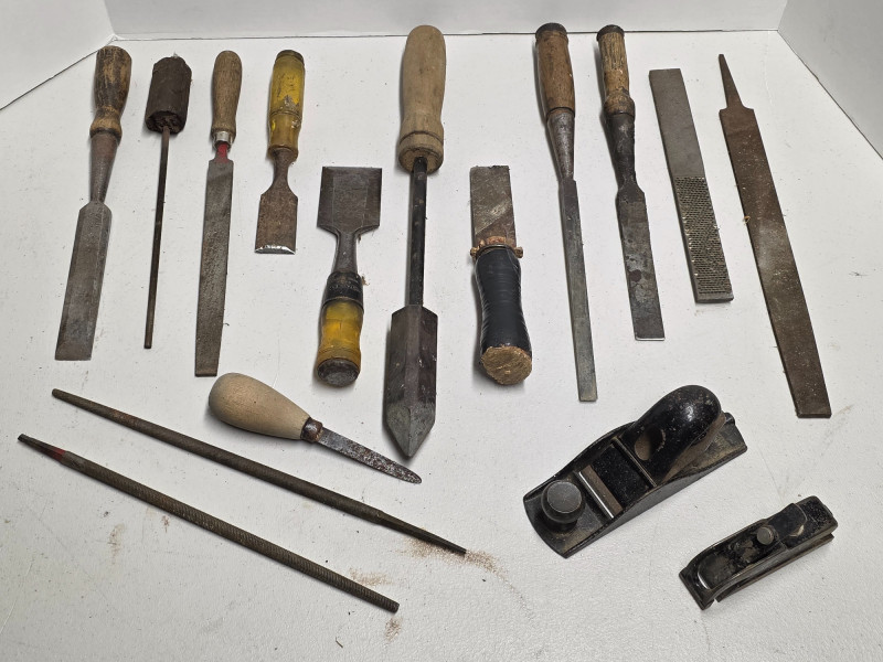 (16) Chisels, Files, Planes, Rasp & Antique Soldering Iron (7) Files (3) Chisels (2) Hand planes (bull nose & general purpose) (1) Antique copper-head soldering iron (1) Rasp/file blade 16 tools in all!