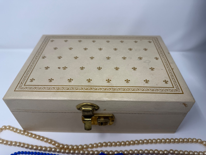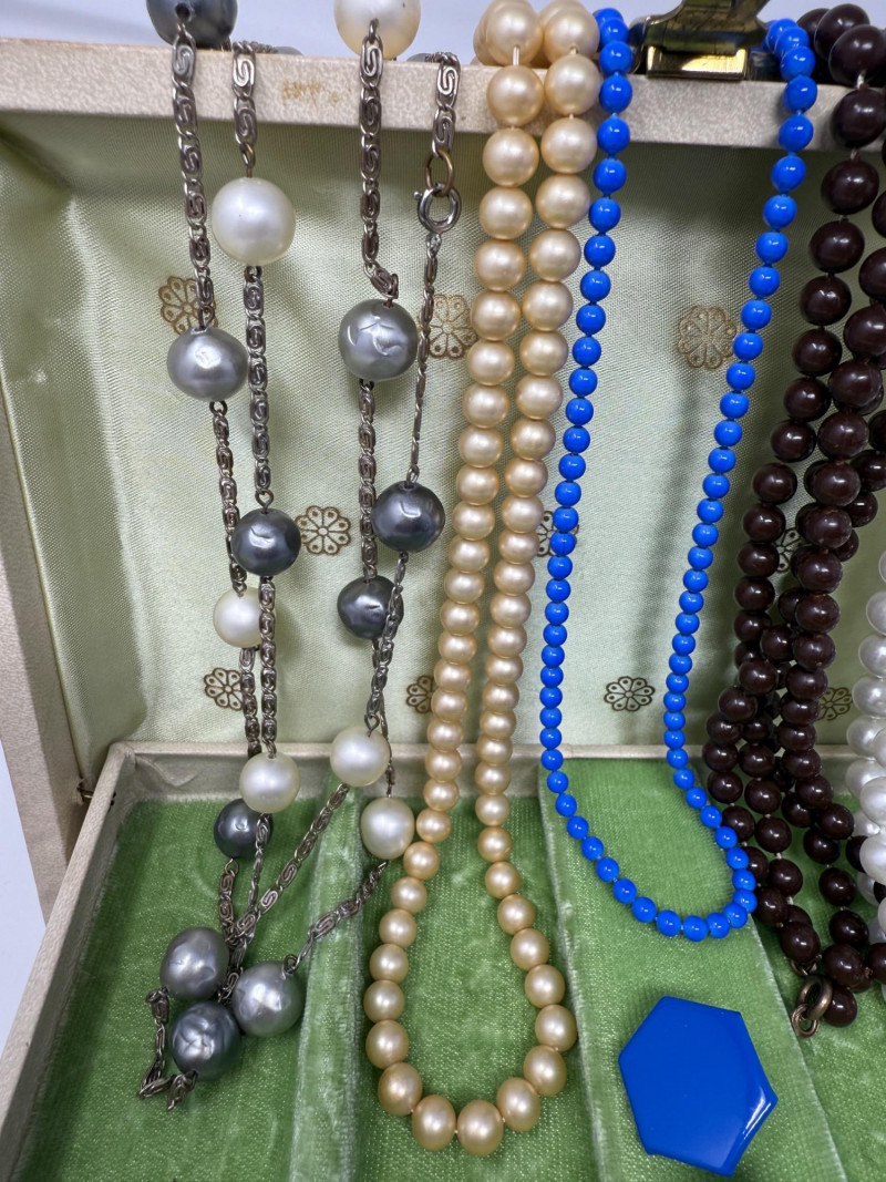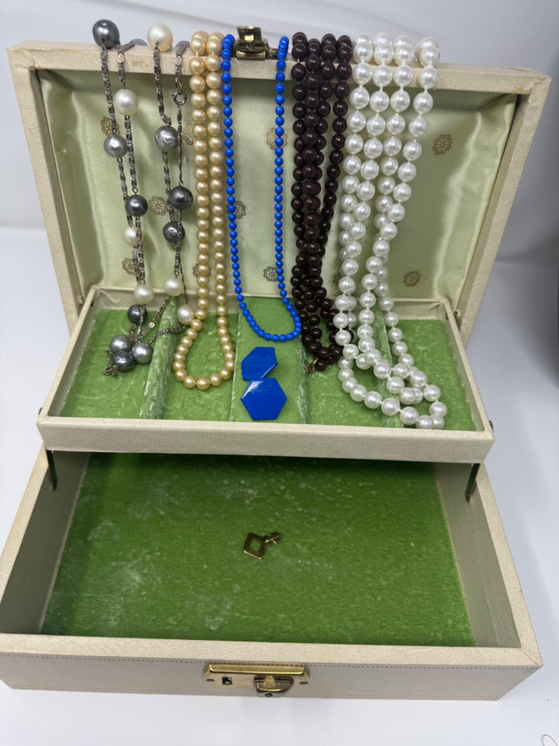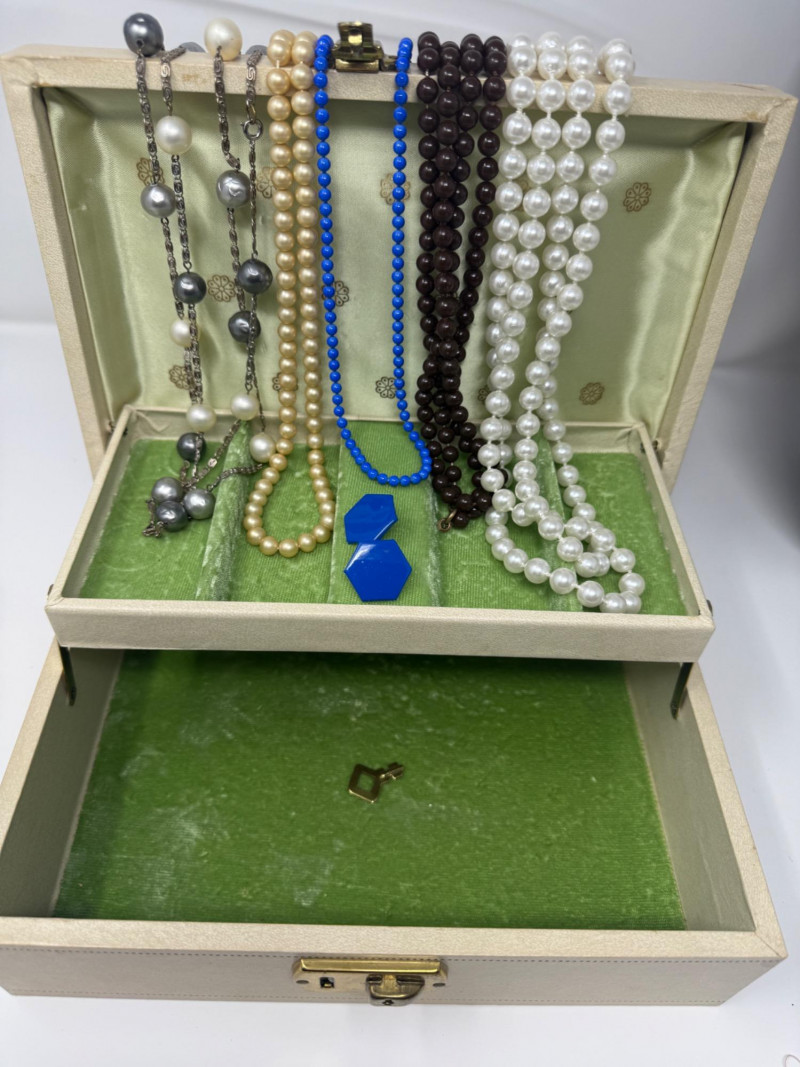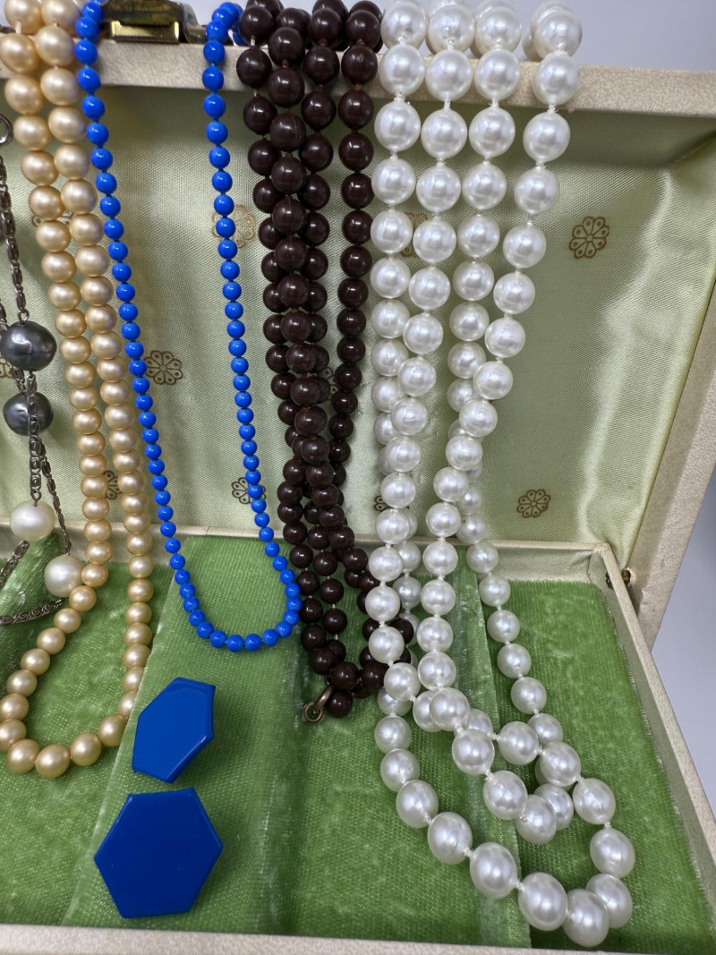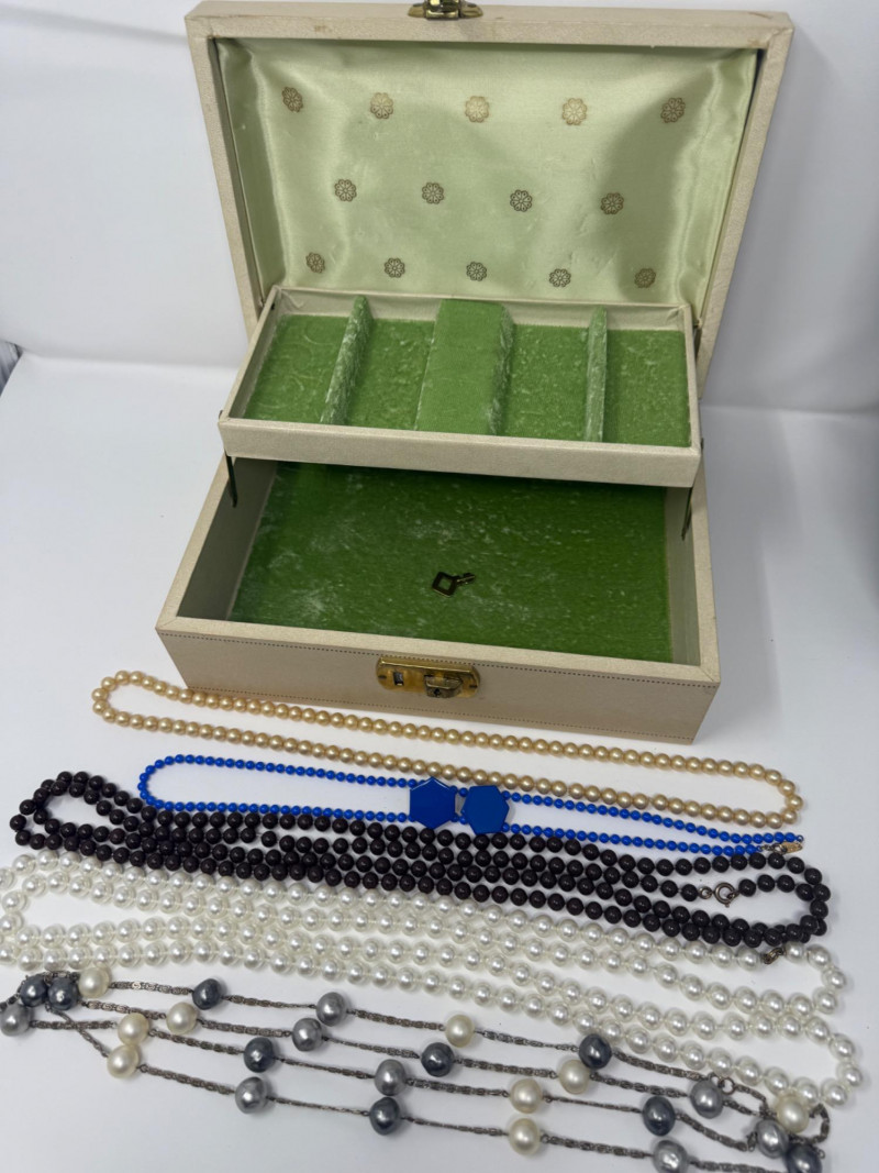 5) Long Beaded Necklaces - Blue Beads & Earring Set in Vintage Locking Box with green velvet interior and key.