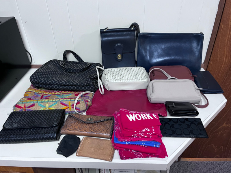 Coach Check Cover—Purses—Wallets— & More! Black coach checkbook cover with credit card slot insert. Five wallets. Two large clutches. One coin purse. Eleven handkerchiefs.